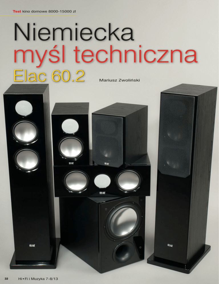 Test Niemiecka 32 Test ie myślcie jednak, że można je kupić za psie pieniądze. Większość kolumn Elaca powstaje w niemieckim mieście Kiel, więc koszty pracy zdecydowanie przewyższają dalekowschodnie standardy. Na szczęście, jakość wykonania idzie z nimi w parze. Testowany zestaw wielokanałowy wchodzi w skład serii 60.2, obecnej w katalogu od ładnych kilku lat. Znajdują się w niej dwa modele kolumn podłogowych, para monitorów i głośnik centralny. Dwójka po kropce wskazuje na modyfikacje, jakim w tym czasie ją poddano. Jedynym obcym elementem w teście był aktywny subwoofer SUB 111.2 ESP. Dla basowych dopalaczy Elac stworzył oddzielną grupę. węgla drzewnego. Do wyboru jest też orzech, ale obawiam się, że z daleka może zalatywać plastikiem. Czerń jest w pełni akceptowalna. Fronty zakryto plastikowymi panelami imitującymi lakier fortepianowy. Poza funkcjami estetycznymi mają za zadanie zasłaniać mocowania głośników. W połączeniu ze srebrzystymi membranami efekt jest niczego sobie. W plastikowe panele choć w przypadku współpracy z płaskimi ekranami nie było to konieczne. W serii 60.2 górę pasma przetwarza standardowa jedwabna kopułka o średnicy 25 mm z magnesem neodymowym. Ze względów estetycznych i praktycznych na stałe osłania ją srebrzysta siateczka. Obudowy wzmocniono poprzecznymi wręgami i obficie wytłumiono płatami watoliny. Wszystkie modele z testowanej grupy wyposażono w pojedyncze złocone zaciski, przyjmujące dowolny typ końcówek kabli głośnikowych. Nad nimi umieszczono wyloty tuneli bas-refleksu. Ilość basu można regulować dwuczęściowymi gąbkowymi zatyczkami. Podłogowe FS 67.2 pełnią rolę głośników głównych. Posadowiono je na grubym Ekranowane magnesy. Budowa Pojęcie „niemieckiej myśli technicznej” od razu nasuwa skojarzenia z „samochodami dla ludu”, które wprawdzie nie grzeszą urodą, ale oferują ponadprzeciętną jakość wykonania i niezawodność. Elaki idą znacznie dalej, bo choć wpisują się w tradycję niemieckiej solidności, to trudno im odmówić walorów wizualnych. Wszystkie obudowy wykonano z MDF-u o grubości 22 mm i wykończono winylową okleiną drewnopodobną w kolorze wtopiono małe magnesy przytrzymujące maskownice. Dzięki temu po zdjęciu siatek błyszczące powierzchnie pozostają nieskalane gniazdami. Uwagę przykuwają srebrzyste 14-cm przetworniki nisko-średniotonowe. Elac od lat stosuje patent polegający na zakryciu celulozowej membrany aluminiową sferą. Taki układ charakteryzuje się ponadprzeciętną sztywnością. Magnesy zamknięto w ekranujących puszkach, cokole wystającym poza obrys obudów. W podstawy należy wkręcić masywne kolce, dołączone do kolumn. W głośniku centralnym i surroundach zastosowano dokładnie te same rozwiązania co w podłogówkach, nie ma więc potrzeby głębszego drążenia tematu. SUB 111.2 ESP SUB 111.2 ESP należy do średniej klasy subwooferów Elaca. Zamontowano wtyczek bananowych. 33 Test w nim znajomy srebrzysty przetwornik o średnicy 20 cm. W porównaniu z basowymi dopalaczami konkurencji nie wygląda imponująco, podobnie jak 100-watowy wzmacniacz, ale często papierowe deklaracje nijak się mają do wrażeń odsłuchowych. Umieszczony z przodu wylot tunelu basowego ułatwi ustawienie subwoofera w niewielkich pomieszczeniach. Tablica rozdzielcza „stojedenastki” jest przejrzysta, a oznakowanie regulatorów głośności i poziomu filtrowania można uznać za wzorcowe. Jedyne zamieszanie wywołuje aż sześć par zacisków niskopoziomowych. Dzięki nim niemiecki subwoofer może wspomagać bas standardowych zestawów stereo, może też pracować w konfiguracji 3.1 z głośnikiem centralnym i frontami. Ja nie miałem tych dylematów i skorzystałem z wejścia liniowego. Po odkręceniu tablicy rozdzielczej natknąłem się na zasilacz, jakiego nie powstydziłby się niejeden piecyk stereo. Potężny toroid i dwa okazałe elektrolity po 6800 µF robią świetne wrażenie. Maksymalny pobór energii z sieci wynosi 200 W, co sugeruje, że deklarowana przez producenta moc to prawdziwe waty, a nie ich dalekowschodnie odpowiedniki. Zestaw Elaca testowałem z dwoma amplitunerami reprezentującymi odmienne szkoły dźwięku. Pierwszy z nich, Cambridge Audio Azur 751R, to szybkość i precyzja. Z kolei Harman/Kardon AVR270 odznacza się brzmieniem znacznie ciep34 lejszym, nieco zmiękczonym w górze pasma. Wprawdzie kosztuje 1/3 ceny Cambridge’a, ale w tym przypadku zależało mi na jego charakterze brzmienia. Najpierw do Elaców podłączyłem CA. Od pierwszych chwil brzmienie ulokowało się po jasnej stronie mocy. Czysta i rześka średnica sprawiała, że w głosach aktorów pojawiały się delikatne szelesty na przełomie wysokich tonów, zaś skrzeczenie latających stworów w „Avatarze” wywoływało ciarki na plechach. Kolumny wygenerowały obszerną scenę, a na podkreślenie zasługiwał aktywny udział surroudów w budowie panoramy dźwiękowej. Jej wirtualne rozmiary zależały od realizacji ścieżki dźwiękowej, niezmienne natomiast było nasycenie drobnymi odgłosami, towarzyszącymi wydarzeniom na ekranie. Elaki dysponują bardzo dobrymi wysokimi tonami, krystalicznie czystymi i ponadprzeciętnie detalicznymi, jednak w połączeniu z żywym brzmieniem Cambridge’a tego dobra było już za wiele. Harman wprowadził więcej ciepła i soczystości w dolnych partiach, dzięki cze- 60.2 mu nawet kilkugodzinny seans nie wywołał oznak zmęczenia. I właśnie tego typu amplituner będzie wymarzonym partnerem dla Elaców. Największą niespodziankę sprawił subwoofer. Patrząc na jego gabaryty, wsparte niezbyt imponującymi danymi technicznymi, nie spodziewałem się cudów, jednak 111.2 ESP mile mnie zaskoczył. W kinie akcji bas potrafił uderzyć z siłą Mike’a Tysona i już po pierwszym ciosie musiałem zjechać potencjometrem w dół. Niskie tony Elaca były twarde, konturo- we, a w nagrania