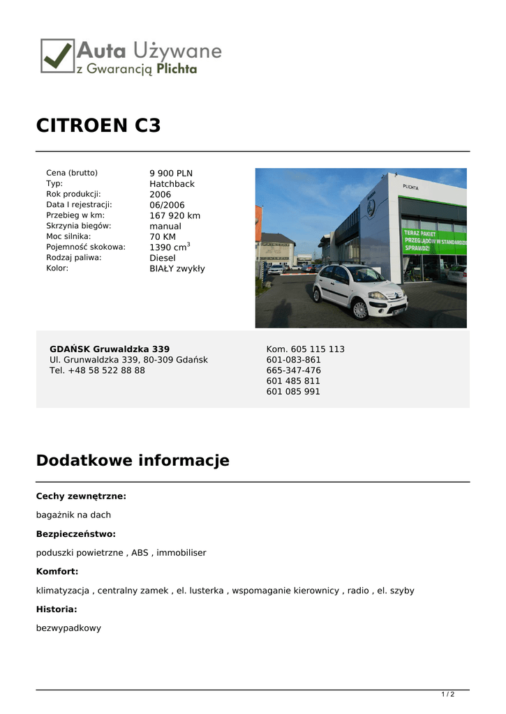 CITROEN C3 Cena (brutto) Typ: Rok produkcji: Data I rejestracji: Przebieg w km: Skrzynia biegów: Moc silnika: Pojemność skokowa: Rodzaj paliwa: Kolor: 9 900 PLN Hatchback 2006 06/2006 167 920 km manual 70 KM 1390 cm3 Diesel BIAŁY zwykły GDAŃSK Gruwaldzka 339 Ul. Grunwaldzka 339, 80-309 Gdańsk Tel. +48 58 522 88 88 Kom. 605 115 113 601-083-861 665-347-476 601 485 811 601 085 991 Dodatkowe informacje Cechy zewnętrzne: bagażnik na dach Bezpieczeństwo: poduszki powietrzne , ABS , immobiliser Komfort: klimatyzacja , centralny zamek , el. lusterka , wspomaganie kierownicy , radio , el. szyby Historia: bezwypadkowy 1/2 Gwarancja Szanowni Państwo, Pragniemy Państwa poinformować, iż firma Plichta – Autoryzowany Dealer Škoda Auto prowadzi skup oraz sprzedaż samochodów używanych wszystkich marek, oferując także samochody używane z gwarancją objęte programem „Auta używane z Gwarancją Plichta”. W ramach programu „Auta Używane z Gwarancją Plichta ” każdy Klient otrzymuje atrakcyjny pakiet zniżek pozwalający zoptymalizować koszty eksploatacji samochodu: -50% na serwis klimatyzacji -50% na ustawienie zbieżności -50% na kosmetykę auta -50% na ścieżkę diagnostyczną -25% na wymiany oleju -25% na zakup opon + 5zł na sezon za hotelowanie opon -15% na części i akcesoria Oferujemy również kompleksową obsługę w zakresie finansowania i ubezpieczenia: - kredyty już od 4,99% - leasingi i kredyty bez zaświadczeń - uproszczone procedury – decyzja już od 30 min. - atrakcyjne pakiety AC/OC/NW/ASS wiodących firm ubezpieczeniowych Możliwość pozostawienia dotychczas użytkowanego auta w rozliczeniu – BEZPŁATNA WYCENA!!! Zapraszamy wszystkich Klientów na jazdę próbną wybranym autem. Numer oferty: C 146 Informacja nie stanowi oferty w rozumieniu art. 66 KC. Podane dane mają charakter wyłącznie informacyjny. 2/2 Powered by TCPDF (www.tcpdf.org)