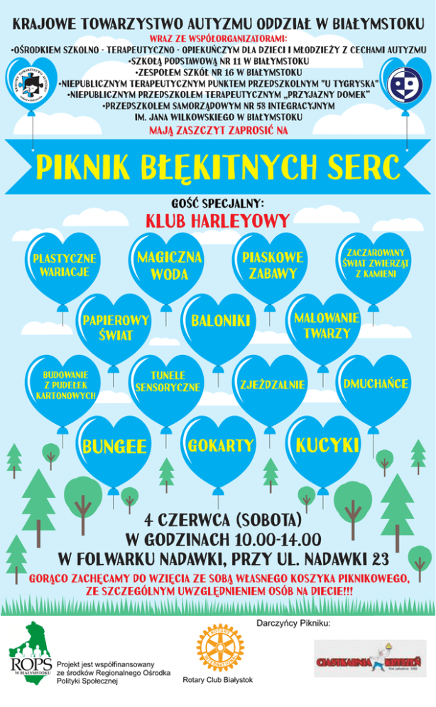 Krajowe Towarzystwo Autyzmu Oddział w Białymstoku wraz ze współorganizatorami: •OŚRODkiem SZKOLNO - TERAPEUTYCZNO - OPIEKUŃCZYM DLA DZIECI I MŁODZIEŻY Z CECHAMI AUTYZMU •Szkołą Podstawową nr 11 w Białymstoku •Zespołem Szkół Nr 16 w Białymstoku •Niepublicznym Terapeutycznym Punktem Przedszkolnym "U Tygryska" •Niepublicznym Przedszkolem Terapeutycznym „Przyjazny Domek” •Przedszkolem Samorządowym Nr 58 Integracyjnym im. Jana Wilkowskiego w Białymstoku Mają zaszczyt zaprosić na PIKNIK BŁĘKITNYCH SERC Gość specjalny: Klub Harleyowy PLASTYCZNE WARIACJE MAGICZNA WODA PAPIEROWY ŚWIAT BUDOWANIE Z PUDEŁEK KARTONOWYCH BALONIKI TUNELE SENSORYCZNE Bungee PIASKOWE ZABAWY MALOWANIE TWARZY Zjeżdzalnie Gokarty ZACZAROWANY ŚWIAT ZWIERZĄT Z KAMIENI Dmuchańce Kucyki 4 czerwca (sobota) w godzinach 10.00-14.00 w Folwarku Nadawki, przy ul. Nadawki 23 Gorąco zachęcamy do wzięcia ze sobą własnego koszyka piknikowego, ze szczególnym uwzględnieniem osób na diecie!!! Darczyńcy Pikniku: Projekt jest współfinansowany ze środków Regionalnego Ośrodka Polityki Społecznej Rotary Club Białystok
