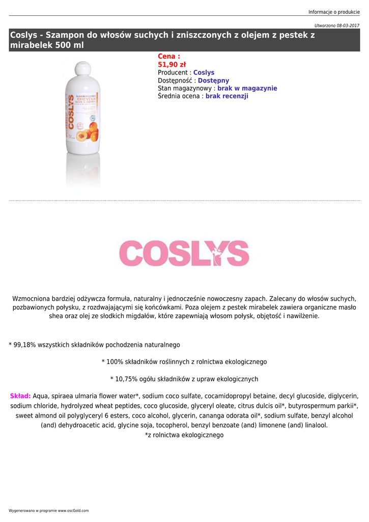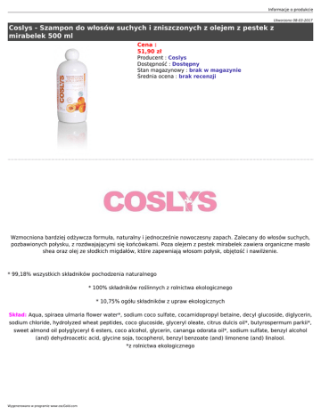 Informacje o produkcie Utworzono 08-03-2017 Coslys - Szampon do włosów suchych i zniszczonych z olejem z pestek z mirabelek 500 ml Cena : 51,90 zł Producent : Coslys Dostępność : Dostępny Stan magazynowy : brak w magazynie Średnia ocena : brak recenzji Wzmocniona bardziej odżywcza formuła, naturalny i jednocześnie nowoczesny zapach. Zalecany do włosów suchych, pozbawionych połysku, z rozdwajającymi się końcówkami. Poza olejem z pestek mirabelek zawiera organiczne masło shea oraz olej ze słodkich migdałów, które zapewniają włosom połysk, objętość i nawilżenie. * 99,18% wszystkich składników pochodzenia naturalnego * 100% składników roślinnych z rolnictwa ekologicznego * 10,75% ogółu składników z upraw ekologicznych Skład: Aqua, spiraea ulmaria flower water*, sodium coco sulfate, cocamidopropyl betaine, decyl glucoside, diglycerin, sodium chloride, hydrolyzed wheat peptides, coco glucoside, glyceryl oleate, citrus dulcis oil*, butyrospermum parkii*, sweet almond oil polyglyceryl 6 esters, coco alcohol, glycerin, cananga odorata oil*, sodium sulfate, benzyl alcohol (and) dehydroacetic acid, glycine soja, tocopherol, benzyl benzoate (and) limonene (and) linalool. *z rolnictwa ekologicznego Wygenerowano w programie www.oscGold.com