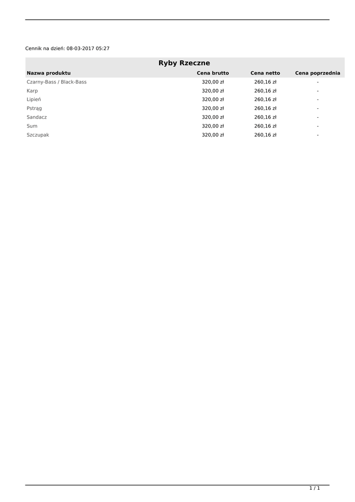 Cennik na dzień: 08-03-2017 05:27 Ryby Rzeczne Nazwa produktu Cena brutto Cena netto Cena poprzednia Czarny-Bass / Black-Bass 320,00 zł 260,16 zł - Karp 320,00 zł 260,16 zł - Lipień 320,00 zł 260,16 zł - Pstrąg 320,00 zł 260,16 zł - Sandacz 320,00 zł 260,16 zł - Sum 320,00 zł 260,16 zł - Szczupak 320,00 zł 260,16 zł - 1/1 Powered by TCPDF (www.tcpdf.org)