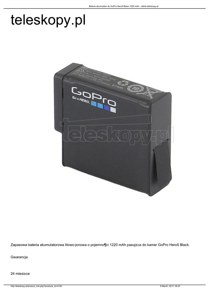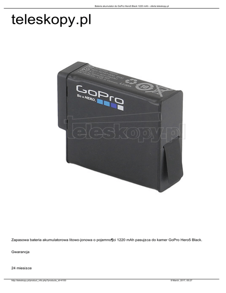 Bateria akumulator do GoPro Hero5 Black 1220 mAh - oferta teleskopy.pl teleskopy.pl Zapasowa bateria akumulatorowa litowo-jonowa o pojemno¶ci 1220 mAh pasuj±ca do kamer GoPro Hero5 Black. Gwarancja 24 miesi±ce http://teleskopy.pl/product_info.php?products_id=4100 8 March, 2017, 05:27 Bateria akumulator do GoPro Hero5 Black 1220 mAh - oferta teleskopy.pl W NASZEJ OFERCIE POSIADAMY KAMERY GOPRO: najnowsze Hero5 Black i Hero5 Session oraz bogaty wybór akcesoriów do GoPro (w tym Hero 3+, 3 i 2) - zachêcamy do kontaktu. Jeste¶my Autoryzowanym Sprzedawc± Detalicznym GoPro - oferowane przez nas kamery i akcesoria GoPro pochodz± z oficjalnej polskiej dystrybucji i posiadaj± 2-letni±, realizowan± w Polsce gwarancjê dystrybutora. http://teleskopy.pl/product_info.php?products_id=4100 8 March, 2017, 05:27