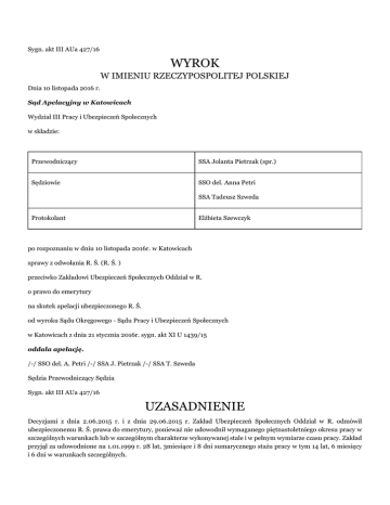 Sygn. akt III AUa 427/16 WYROK W IMIENIU RZECZYPOSPOLITEJ POLSKIEJ Dnia 10 listopada 2016 r. Sąd Apelacyjny w Katowicach Wydział III Pracy i Ubezpieczeń Społecznych w składzie: Przewodniczący SSA Jolanta Pietrzak (spr.) Sędziowie SSO del. Anna Petri SSA Tadeusz Szweda Protokolant Elżbieta Szewczyk po rozpoznaniu w dniu 10 listopada 2016r. w Katowicach sprawy z odwołania R. Ś. (R. Ś. ) przeciwko Zakładowi Ubezpieczeń Społecznych Oddział w R. o prawo do emerytury na skutek apelacji ubezpieczonego R. Ś. od wyroku Sądu Okręgowego - Sądu Pracy i Ubezpieczeń Społecznych w Katowicach z dnia 21 stycznia 2016r. sygn. akt XI U 1439/15 oddala apelację. /-/ SSO del. A. Petri /-/ SSA J. Pietrzak /-/ SSA T. Szweda Sędzia Przewodniczący Sędzia Sygn. akt III AUa 427/16 UZASADNIENIE Decyzjami z dnia 2.06.2015 r. i z dnia 29.06.2015 r. Zakład Ubezpieczeń Społecznych Oddział w R. odmówił ubezpieczonemu R. Ś. prawa do emerytury, ponieważ nie udowodnił wymaganego piętnastoletniego okresu pracy w szczególnych warunkach lub w szczególnym charakterze wykonywanej stale i w pełnym wymiarze czasu pracy. Zakład przyjął za udowodnione na 1.01.1999 r. 28 lat, 3miesiące i 8 dni sumarycznego stażu pracy w tym 14 lat, 6 miesięcy i 6 dni w warunkach szczególnych. W odwołaniu od tej decyzji ubezpieczony wnosił o zmianę zaskarżonych decyzji i przyznanie emerytury. Podnosił, że w warunkach szczególnych pracował: - od 3.09.1973 r. do 16.06.1975 r. w (...) Zakład Nr (...) w B. na stanowisku montera; - od 17.06.1975 r. do 30.11.1975 r. w (...) Zakład nr (...) T. na stanowisku montera samochodów transportowych; - od 6.05.1978 r. do 14.11.1982 r. w (...) Zakład nr (...) T. na stanowisku montera samochodów osobowych; - od 15.11.1982 r. do 28.02.1988 r. w (...) Zakład nr (...) T. na stanowisku robotnika transportowego – operatora wózka; - od 1.03.1988 r. do 30.09.1991 r. w (...) Zakład nr (...) T. na stanowisku montera mechanika silników spalinowych; - od 1.10.1991 r. do 30.04.2013 r. w (...) Zakład nr (...) T. ( od 1993 r. pod nazwą (...) S.A. , a od 1999 r. (...) S.A.) na stanowisku montera, albowiem wszystkie stanowiska, na których pracował zaliczane były do szczególnych warunków zatrudnienia. Pracę montera samochodów osobowych stale i w pełnym wymiarze wykonywał również w okresie - od 15.11.1982 r. do 28.02.1988 r. w (...) Zakład nr (...) T. na stanowisku robotnika transportowego – operatora wózka. W odpowiedzi na odwołanie organ rentowy wnosił o jego oddalenie i wywodził jak w zaskarżonej decyzji wskazując, że zaliczył do pracy ubezpieczonego w warunkach szczególnych wszystkie okresy zatrudnienia wskazane w wystawionym przez pracodawcę świadectwie pracy w warunkach szczególnych, jak również okres służby wojskowej od 3.09.1973 r. do 16.06.1975 r. Wyrokiem z dnia 21.01.2016r. Sąd Okręgowy – Sąd Pracy i Ubezpieczeń Społecznych w Katowicach oddalił odwołania. Bezsporne w sprawie było, że ubezpieczony R. Ś. w dniu (...)r. ukończył 60 lat, nie jest członkiem OFE, na dzień 31.12.1998 r. posiada ponad 25 lat okresów składkowych i nieskładkowych i w dniu (...) r. wystąpił z wnioskiem o emeryturę. Sąd ustalił: Ubezpieczony R. Ś. z wykształcenia mechanik pojazdów samochodowych wykonywał pracę : - od 3.09.1973 r. do 16.06.1975 r. w (...) Zakład Nr (...) w B. na stanowisku montera na Montażu Głównym – Oddział Wyposażenia Wnętrza, - od 17.06.1975 r. do 30.11.1975 r. w (...) Zakład nr (...) T. na stanowisku montera pojazdów i pojazdów transportowych - Oddział Podwozia i Wyposażenia Wewnętrznego; - od 1.12.1975 r. do 29.04.1976 r. w (...) Zakład nr (...) T. na stanowisku montera samochodów osobowych; - od 30.04.1975 r. do 13.04.1978 r. odbywał zasadniczą służbę wojskową; - od 6.05.1978 r. do 14.11.1982 r. w (...) Zakład nr (...) T. na stanowisku montera samochodów osobowych, w tym w listopadzie 1980 r. przeszedł kurs legalizacji prędkościomierzy i drogomierzy samochodowych; - od 15.11.1982 r. do 28.02.1988 r. w (...) Zakład nr (...) T. na Wydziale (...) – magazyn silników na stanowisku robotnika transportowego – operatora wózka; - od 1.03.1988 r. do 30.09.1991 r. w (...) Zakład nr (...) T. na stanowisku montera mechanika silników spalinowych; - od 1.10.1991 r. do 31.12.1998 r. w (...) Zakład nr (...) T. ( od 1993 r. pod nazwą (...) S.A. ) na stanowisku montera. W okresie zatrudnienia od 3.09.1973 r. do 29.04.1975 r. i po wojsku od 6.05.1978 r. do 14.11.1982 r. oraz od 1.03.1988 r. do 30.09.1991 r. ubezpieczony wykonywał prace na linii montażowej F. (...) początkowo w Zakładzie Nr (...) w B., a od 17.06.1975 r. w Zakładzie Nr (...) w T. przy montażu oświetlenia, osprzętu drzwi, karoserii, drogomierzy i prędkościomierzy. Od 1.10.1991 r. do 31.12.1998 r. ubezpieczony wykonywał prace na Oddziale Podmontaży Różnych przy montowaniu podzespołów zawieszenia do samochodów. Od 15.11.1982 r. do 28.02.1988 r. na Wydziale Napraw (...)– magazyn silników na stanowisku robotnika transportowego – operatora wózka widłowego. Praca ubezpieczonego polegała na przywożeniu i odwożeniu silników z magazynu tych silników na Wydział Napraw, na którym silniki te były podmieniane. Ponadto, w tym okresie czasami pracował też na stanowisku uruchomienia , gdzie ustalał przyczyny usterek pracy samochodów i wymieniał wadliwe zespoły, czy urządzenia. Ubezpieczony nigdy w okresie zatrudnienia nie pracował na hamowni przy sprawdzaniu sprawności silników spalinowych. Takie prace były wykonywane jedynie na Zakładzie Nr (...) w B., bo tylko tam odbywała się produkcja silników. Gotowe silniki były następnie transportowane do Zakładu(...) – gdzie były montowane do samochodów. Ubezpieczony nie wykonywał również pracy na stanowisku rolek na Wydziale Montażu Głównego w Zakładzie Nr (...) w T., albowiem nie miał uprawnień do wykonywania tej pracy. Pracodawca w dni