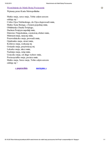 10.02.2013 Westchnienie do Matki Bożej Pocieszenia Westchnienie do Matki Bożej Pocieszenia Wpisany przez Kuria Metropolitalna Matko moja, serce moje, Tobie całym sercem oddaję się ! Córko Ojca Niebieskiego, do Ojca doprowadź mnie, Matko Syna Bożego, z Synem pojednaj mnie, Oblubienico Ducha Świętego, Duchem Świętym napełnij mnie, Dziewico Niepokalana, czystością obdarz mnie, Mistrzyni moja, nauczaj mnie, Przewodniczko moja, prowadź mnie, Opiekunko moja, strzeż mnie, Królowo moja, rozkazuj mi, Gwiazdo moja, przyświecaj mi, Lekarko moja, ulecz mnie, Nadziejo moja, ratuj mnie, Ucieczko moja, od złego wybaw mnie, Pocieszycielko moja, pociesz mnie. Matko moja, Serce moje, Tobie całym sercem oddaję się ! « poprzednia następna » 83.18.26.76/archidiecezja/sanktuaria/634-westchnienie-do-matki-boej-pocieszenia.html?tmpl=component&print=1&page= 1/1
