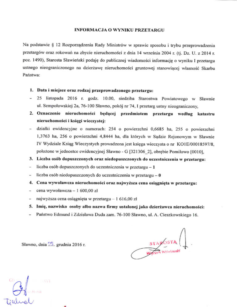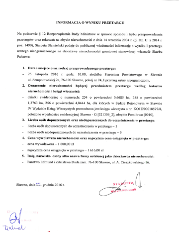 INFORMACJA O WYNIKU PRZETARGU Na podstawie § 12 Rozporz^dzenia Rady Ministrow w sprawie sposobu i trybu przeprowadzenia przetargow oraz rokowaii na zbycie nieruchomosci z dnia 14 wrzesnia 2004 r. (tj. Dz. U. z 2014 r. poz. 1490), Starosta Slawieriski podaje do publicznej wiadomosci informacj? o wyniku I przetargu ustnego nieograniczonego na dzierzawe nieruchomosci gruntowej stanowi^cej wlasnosc Skarbu Paristwa: 1. Data i miejsce oraz rodzaj przeprowadzonego przetargu: - 25 listopada 2016 r. godz. 10.00, siedziba Starostwa Powiatowego w Slawnie ul. Sempolowskiej 2a, 76-100 Slawno, pokqj nr 74,1 przetarg ustny nieograniczony, 2. Oznaczenie nieruchomosci bed^cej przedmiotem przetargu wedlug katastru nieruchomosci i ksi^gi wieczystej: - dzialki ewidencyjne o numerach: 254 o powierzchni 0,6685 ha, 255 o powierzchni 1,3763 ha, 256 o powierzchni 4,8444 ha, dla ktorych w S^dzie Rejonowym w Slawnie IV Wydziale Ksi^g Wieczystych prowadzona jest ksi^ga wieczysta o nr KOIE/00018597/8, polozone wjednostce ewidencyjnej Slawno - G [321306_2], obrebie Pomilowo [0010], 3. Liczba osob dopuszczonych oraz niedopuszczonych do uczestniczenia w przetargu: liczba osob dopuszczonych do uczestniczenia w przetargu - 1 - liczba osob niedopuszczonych do uczestniczenia w przetargu - 0 4. Cena wywolawcza nieruchomosci oraz najwyzsza cena osi^gnieta w przetargu: - cena wywolawcza - 1 600,00 zl najwyzsza cena osi^gnieta w przetargu - 1 616,00 zl 5. Imi$, nazwisko osoby albo nazwa firmy ustalonej jako dzierzawca nieruchomosci: - Paristwo Edmund i Zdzislawa Duda zam. 76-100 Slawno, ul. A. Cieszkowskiego 16. Slawno, dnia 25. grudnia 2016 r.