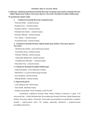 Protokół z dnia 27 czerwiec 2014r. Z odbytego wspólnego posiedzenia Komisji Rozwoju Gospodarczego Gminy, Komisji Oświaty, Opieki Społecznej, Kultury Fizycznej, Sportu i Turystyki i Komisji Porządku Publicznego. W posiedzeniu udział wzięli: 1. Członkowie Komisji Rozwoju Gospodarczego: - Pietrzak Stefan - członek komisji - Karpiuk Jerzy - członek komisji - Karpiuk Andrzej - członek komisji - Michałowska Emilia - członek komisji - Holonko Mikołaj - członek komisji - Troc Aleksy - członek komisji - Szymaniuk Irena- członek komisji 2. Członkowie Komisji Oświaty, Opieki Społecznej, Kultury Fizycznej, Sportu i Turystyki: - Michałowska Emilia - przewodnicząca komisji - Szymaniuk Irena- członek komisji - Holonko Mikołaj- członek komisji - Aleksander Bańkowski -członek komisji - Chodakowski Mirosław – członek komisji - Oksentiuk Nina - członek komisji 3. Członkowie Komisji Porządku Publicznego: - Andrzej Karpiuk - przewodniczący komisji - Michał Kot- z-ca przewodniczącego komisji - Jerzy Karpiuk- członek komisji - Mikołaj Rybak- członek komisji 4. Zaproszeni goście: - Leon Małaszewski- Wójt Gminy - Anna Kulik -Skarbnik Gminy - Natalia Gierasimiuk- Prezes Fundacji „ONI TO MY” Posiedzenie wspólnych Komisji Rady Gminy Dubicze Cerkiewne o godz. 9.25 otworzyła Pani – Emilia Michałowska Przewodnicząca Komisji Oświaty, Opieki Społecznej, Kultury Fizycznej, Sportu i Turystyki. Przywitała ona przybyłych na posiedzenie członków komisji i zaproszonych gości. Na wstępie zapoznała zebranych z proponowanym porządkiem dziennym 1.Stanowisko Rady Gminy Dubicze Cerkiewne w sprawie nieodpłatnego przekazania nieruchomości ( budynek po byłej szkole oraz przyległy plac z budynkami gospodarczymi) w miejscowości Stary Kornin. 2. 3. Informacja o sytuacji Ochotniczej Straży Pożarnej w gminie Dubicze Cerkiewne. Rozpatrzenie wniosku Gminy Hajnówka w sprawie przekazania majątku trwałego w postaci sieci wodociągowej we wsiach Mochnate i Stare Berezowo. 4. Zaopiniowanie projektów uchwał w sprawie: 1) udzielenia absolutorium Wójtowi Gminy Dubicze Cerkiewne, 2) członkowstwa Gminy Dubicze Cerkiewne w Lokalnej Grupie Działania - Puszcza Białowieska, 3) zmian w budżecie gminy na 2014 rok, 4) zmiany Wieloletniej Prognozy Finansowej Gminy Dubicze Cerkiewne na lata 20142031, 5) przekazania sieci wodociągowej stanowiącej własność gminy Dubicze Cerkiewne, 6) uchwalenia wieloletniego programu gospodarowania mieszkaniowym zasobem Gminy Dubicze Cerkiewne na lata 2014-2018. 5. Sprawy różne. Przewodnicząca zapytała czy członkowie chcą nanieść jakieś zmiany do porządku obrad lecz nikt nie zgłosił sprzeciwu. Komisja jednogłośnie ( głosów 13 „za”) przyjęła zaproponowany porządek obrad. Do punktu 1 Wójt Gminy Pan Leon Małaszewski powitał zaproszoną na posiedzenie gminnych komisji Panią Prezes Fundacji „ONI TO MY”, po czym odczytał wniosek. Po krótkim wyjaśnieniu udzielił głosu Pani Gierasimiuk. Fundacji na rzecz budowy Otwartego społeczeństwa ONI TO MY ma zamiar stworzyć ośrodek pomocy dla osób pokrzywdzonych przestępstwem. W ośrodku będą pełnić dyżury: psycholog, mediator, radca prawny, terapeuta, pedagog, animator kultury, którzy również będą do dyspozycji mieszkańców. Pan Jerzy Karpiuk radny wsi Werstok zapytał „dlaczego chcecie wynająć budynek po byłej szkole na nie kupić?” Natalia Gierasimiuk odpowiedziała „nie mamy takich pieniędzy” Mikołaj Rybak radny wsi Tofiłowce dodał, że „budynek bez remontu za parę lat będzie całkowitą ruiną” Pani Gierasimuk poinformowała ,że jest już otwarty punkt dla osób potrzebujących pomocy w Miejskim Ośrodku Pomocy Społecznej w Hajnówce, gdzie do dyspozycji zainteresowanych pełni dyżury radca prawy i psycholog – bezpłatnie. Wójt Gminy Leon Małaszewski zapytał jaki termin do rozpoczęcia pierwszych prac remontowych? Pani Natalia Gierasimiuk stwierdziła, że „chcielibyśmy pokrycie duchowe zrealizować jeszcze w tym roku. Mikołaj Rybak radny wsi Tofiłowce „należy porozmawiać z mieszkańcami wsi Stary Kornin” Jerzy Karpiuk Przewodniczący Rady Gminy Dubicze Cerkiewne „myślę, że rada nie będzie miała nic przeciwko”. Po przeprowadzonych rozmowach ustalono, że zostanie zorganizowane zebranie wiejskie w miejscowości Stary Kornin. Do punktu 2 Wójt Gminy Leon Małaszewski zabrał głos w sprawie zakupu nowego samochodu do OSP Dubicze Cerkiewne. Gmina Dubicze Cerkiewne w ramach polsko-białoruskiego projektu partnerskiego “Wspólnie chronimy Puszczę Białowieską” zakupiła nowy samochód specjalny-pożarniczy MAN TGM 13.290. 4x4 BL. Projekt był w 90% współfinansowany ze środków Unii Europejskiej w ramach Współpracy Transgranicznej Polska- Białoruś- Ukraina 2007-2013. W dniu 5 czerwca 2014r. samochód został uroczyście przekazany do dyspozycji Jednostki OSP w Dubiczach Cerkiewnych. Mikołaj Rybak radny wsi Tofiłowce powiedział , że JELCZ to pomocniczy samochód” Jerzy Kułaj „to może sprzedać?” Mikołaj Rybak radny wsi Tofiłowce „wziąć do Tofiłowiec to ani ludzi nie wsadzisz ani sprzętu” Aleksy Troc radny wsi Koryciski „Jak wyjechać na pożar to nie ma komu a sprzęt jest nowy” Wójt Gminy zaproponował żeby zrobić zebranie i wspólnie porozmawiać. Do punktu 3 Wójt Gminy Pan Leon Małaszewski zajął głos w sprawie rozpatrzenie wniosku Gminy Hajnówka w sprawie przekazania majątku trwałego w postaci sieci wodociągowej we wsiach Mochnate i Stare Berezowo. Mikołaj Rybak powiedział, aby Wójt prowadził negocjacje. Należałoby wziąć Pana Jana Gierasimiuka rzeczoznawcę aby wycenił. Jerzy Karpiuk Przewodniczący Rady Gminy zasugerował, aby cena byłą zbliżona do 100 tys. zł Do punktu 4 . Do ppkt.1 Projekt uchwały w sprawie udzielenia absolutorium Wójtowi Gminy Dubicze Cerkiewne został odczytany przez panią Emilię Michałowską po czym, komisja zapoznała si