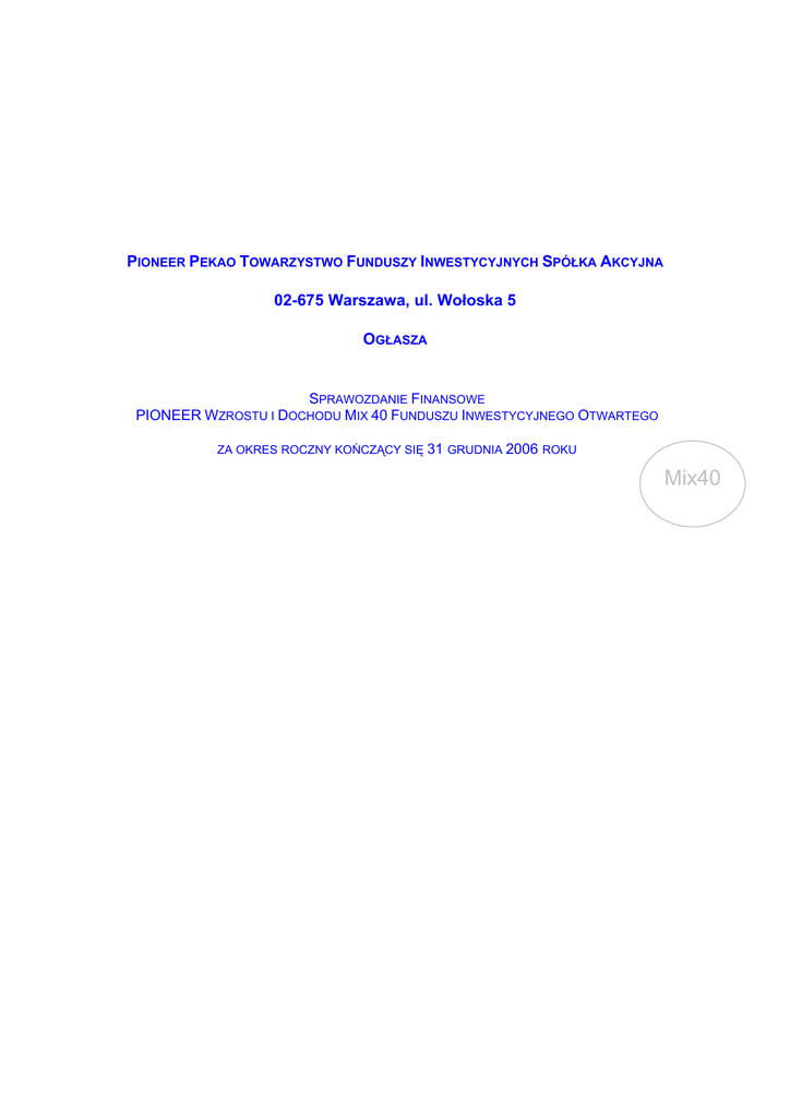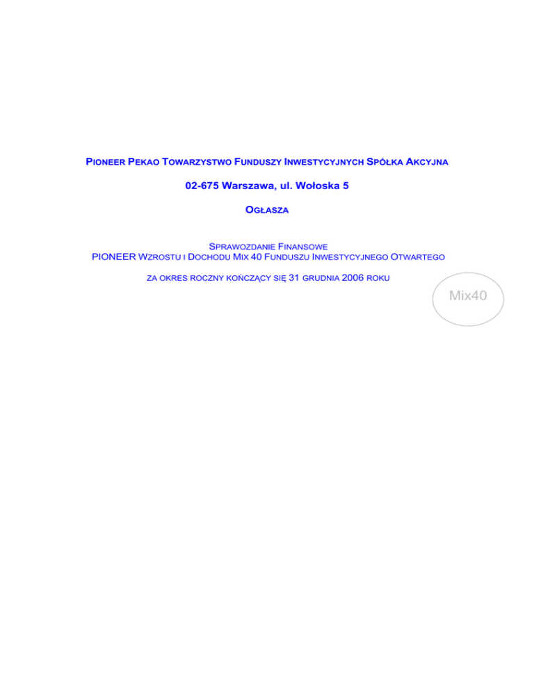 PIONEER PEKAO TOWARZYSTWO FUNDUSZY INWESTYCYJNYCH SPÓŁKA AKCYJNA 02-675 Warszawa, ul. Wołoska 5 OGŁASZA SPRAWOZDANIE FINANSOWE PIONEER WZROSTU I DOCHODU MIX 40 FUNDUSZU INWESTYCYJNEGO OTWARTEGO ZA OKRES ROCZNY KOŃCZĄCY SIĘ 31 GRUDNIA 2006 ROKU Mix40 PIONEER WZROSTU I DOCHODU MIX 40 FUNDUSZ INWESTYCYJNY OTWARTY Sprawozdanie Finansowe za okres roczny kończący się 31 grudnia 2006 roku Spis treści Wprowadzenie A Fundusz Nazwa Funduszu, typ oraz konstrukcja Funduszu Podstawy prawne działania, informacje rejestrowe Funduszu, utworzenie Funduszu Opis celu inwestycyjnego, specjalizacji Funduszu Opis stosowanych ograniczeń inwestycyjnych Funduszu Informacja o założeniu kontynuowania działalności B Towarzystwo Funduszy Inwestycyjnych Firma Towarzystwa Funduszy Inwestycyjnych, siedziba i adres Dane rejestrowe Towarzystwa Funduszy Inwestycyjnych C Okres sprawozdawczy i dzień bilansowy D Biegły rewident funduszu E Jednostki Uczestnictwa Zestawienie lokat Bilans Rachunek wyniku z operacji Zestawienie zmian w aktywach netto Noty objaśniające Nota - 1 Polityka rachunkowości funduszu Przepisy prawne regulujące rachunkowość Funduszu Zasady ujawniania i prezentacji informacji w sprawozdaniu finansowym Ujmowanie operacji dotyczących Funduszu w księgach rachunkowych Wycena aktywów i pasywów Funduszu Ustalanie Wartości Aktywów Netto i wyniku z operacji Wprowadzone w okresie sprawozdawczym zmiany stosowanych zasad rachunkowości, metod wyceny oraz sposobu sporządzania sprawozdania finansowego Nota - 2 Należności Funduszu Nota - 3 Zobowiązania Funduszu Nota - 4 Środki pieniężne i ich ekwiwalenty Nota - 5 Ryzyka Nota - 6 Instrumenty pochodne Nota - 7 Transakcje przy zobowiązaniu się Funduszu lub drugiej strony do odkupu Nota - 8 Kredyty i pożyczki Nota - 9 Waluty i różnice kursowe Nota - 10 Dochody i ich dystrybucja Nota - 11 Koszty Funduszu Nota - 12 Dane porównawcze o Jednostkach Uczestnictwa Informacje dodatkowe A Informacje o znaczących zdarzeniach, dotyczących lat ubiegłych, ujętych w sprawozdaniu finansowym B Informacje o znaczących zdarzeniach po dniu bilansowym C Dokonane korekty błędów podstawowych D Inne informacje Opodatkowanie Funduszu w roku 2006 Podatek dochodowy od dochodu z tytułu odkupienia Jednostek Uczestnictwa Instytucje obsługujące Fundusz • Towarzystwo Funduszy Inwestycyjnych • Agent Obsługujący Uczestników Funduszu • Depozytariusz PIONEER WZROSTU I DOCHODU MIX 40 FUNDUSZ INWESTYCYJNY OTWARTY Sprawozdanie Finansowe za okres roczny kończący się 31 grudnia 2006 roku Wprowadzenie A Fundusz Nazwa Funduszu, typ oraz konstrukcja Funduszu Pioneer Wzrostu i Dochodu Mix 40 Fundusz Inwestycyjny Otwarty Fundusz jest funduszem inwestycyjnym otwartym. Fundusz zbywa jednostki uczestnictwa różnych kategorii. Podstawy prawne działania, informacje rejestrowe Funduszu, utworzenie Funduszu Podstawy prawne działania Funduszu określone są w Ustawie z dnia 27 maja 2004 roku o funduszach inwestycyjnych (Dz. U. nr 146, poz. 1546 z późniejszymi zmianami), zwanej dalej Ustawą. Zgodnie z Ustawą nadzór nad rynkiem sprawuje Komisja Nadzoru Finansowego (dalej: ‘Komisja’) – wcześniej Komisja Papierów Wartościowych i Giełd. Fundusz prowadzi działalność zgodnie z prawem wspólnotowym regulującym zasady zbiorowego inwestowania w papiery wartościowe. Statut PIONEER Wzrostu i Dochodu Mix 40 Funduszu Inwestycyjnego Otwartego zatwierdzony został decyzją Komisji Papierów Wartościowych i Giełd DFI/W/4032-12/21-1-2487/05 z dnia 20 maja 2005 roku o udzieleniu zezwolenia na utworzenie funduszu oraz zatwierdzeniu Statutu Funduszu i wyborze depozytariusza. Fundusz został wpisany do rejestru funduszy inwestycyjnych prowadzonego przez Sąd Okręgowy w Warszawie, VII Wydział Cywilny i Rejestrowy pod numerem RFi 188 w dniu 20 czerwca 2005 roku. Fundusz został utworzony w drodze zapisów polegających na dokonaniu wpłaty kwoty 4 milionów złotych przez Pioneer Pekao Towarzystwo Funduszy Inwestycyjnych S.A. Cena nabycia Jednostki uczestnictwa w ramach zapisów wynosiła 10.00 zł. Data rozpoczęcia zbywania Jednostek Uczestnictwa: 1 sierpnia 2005 roku. Zgodnie ze Statutem Fundusz został utworzony na czas nieograniczony. Wskazane w treści niniejszego sprawozdania finansowego odwołania lub odniesienia do postanowień Statutu odnoszą się do Statutu w brzmieniu obowiązującym w dniu podpisania niniejszego sprawozdania finansowego. Opis celu inwestycyjnego, specjalizacji Funduszu Celem inwestycyjnym Funduszu jest wzrost wartości Aktywów Funduszu w wyniku wzrostu wartości lokat oraz osiąganie przychodu z lokat netto Funduszu. Fundusz nie gwarantuje osiągnięcia powyższego celu. Aktywa Funduszu są lokowane w akcje spółek o ponadprzeciętnym, w okresie średnio i długoterminowym, potencjale wzrostu oraz w dłużne papiery wartościowe i instrumenty rynku pieniężnego pozwalające uzyskiwać bieżący dochód. Udział poszczególnych rodzajów lokat w Aktywach Funduszu będzie uzależniony od decyzji zarządzającego Funduszem, podejmowanej z uwzględnieniem warunków ekonomicznych i sytuacji na rynku papierów wartościowych oraz z uwzględnieniem statutowych limitów. Całkowita wartość lokat w instrumenty finansowe o charakterze udziałowym, rozumiane przede wszystkim jako akcje oraz inne instrumenty, których cena w bezpośredni sposób zależy od ceny jednej lub wielu akcji (kwity depozytowe, prawa do akcji, warranty, kontrakty terminowe na akcje i indeksy akcyjne) jak również te jednostki uczestnictwa funduszy inwestycyjnych otwartych mających siedzibę w Polsce lub tytuły uczestnictwa funduszy zagranicznych lub tytuły uczestnictwa instytucji wspólnego inwestowania, których polityka inwestycyjna dopuszcza lokowanie aktywów w akcje, nie będzie większa niż 60 % Aktywów Funduszu. - 1 / Wprowadzenie (PL) - Mix40 PIONEER WZROSTU I DOCHODU MIX 40 FUNDUSZ INWESTYCYJNY OTWARTY Sprawozdanie Finansowe za okres roczny koń