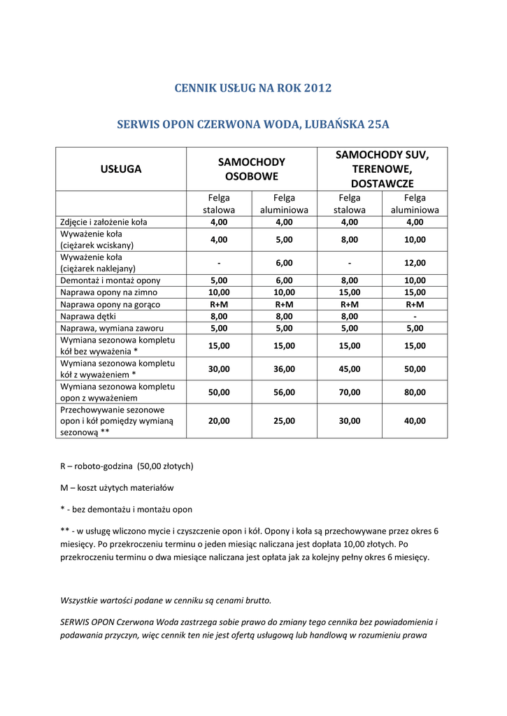 CENNIK USŁUG NA ROK 2012 SERWIS OPON CZERWONA WODA, LUBAŃSKA 25A USŁUGA Zdjęcie i założenie koła Wyważenie koła (ciężarek wciskany) Wyważenie koła (ciężarek naklejany) Demontaż i montaż opony Naprawa opony na zimno Naprawa opony na gorąco Naprawa dętki Naprawa, wymiana zaworu Wymiana sezonowa kompletu kół bez wyważenia * Wymiana sezonowa kompletu kół z wyważeniem * Wymiana sezonowa kompletu opon z wyważeniem Przechowywanie sezonowe opon i kół pomiędzy wymianą sezonową ** SAMOCHODY OSOBOWE SAMOCHODY SUV, TERENOWE, DOSTAWCZE Felga stalowa Felga aluminiowa Felga stalowa Felga aluminiowa 4,00 4,00 4,00 4,00 4,00 5,00 8,00 10,00 - 6,00 - 12,00 5,00 10,00 R+M 8,00 5,00 6,00 10,00 R+M 8,00 5,00 8,00 15,00 R+M 8,00 5,00 10,00 15,00 R+M 5,00 15,00 15,00 15,00 15,00 30,00 36,00 45,00 50,00 50,00 56,00 70,00 80,00 20,00 25,00 30,00 40,00 R – roboto-godzina (50,00 złotych) M – koszt użytych materiałów * - bez demontażu i montażu opon ** - w usługę wliczono mycie i czyszczenie opon i kół. Opony i koła są przechowywane przez okres 6 miesięcy. Po przekroczeniu terminu o jeden miesiąc naliczana jest dopłata 10,00 złotych. Po przekroczeniu terminu o dwa miesiące naliczana jest opłata jak za kolejny pełny okres 6 miesięcy. Wszystkie wartości podane w cenniku są cenami brutto. SERWIS OPON Czerwona Woda zastrzega sobie prawo do zmiany tego cennika bez powiadomienia i podawania przyczyn, więc cennik ten nie jest ofertą usługową lub handlową w rozumieniu prawa