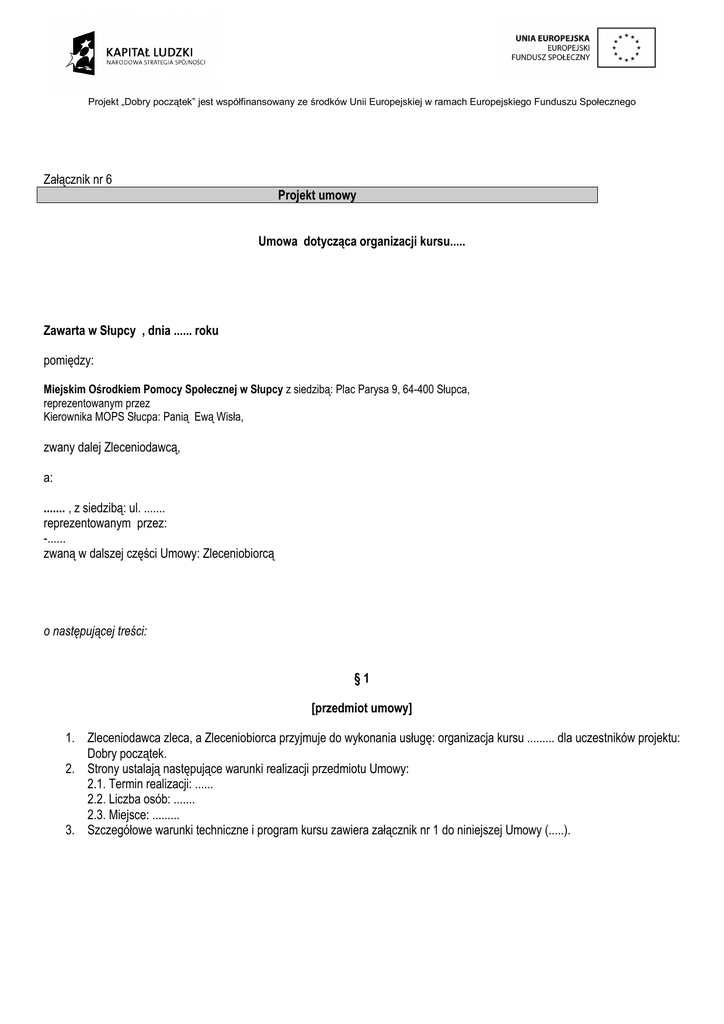 Projekt „Dobry początek” jest współfinansowany ze środków Unii Europejskiej w ramach Europejskiego Funduszu Społecznego Załącznik nr 6 Projekt umowy Umowa dotycząca organizacji kursu..... Zawarta w Słupcy , dnia ...... roku pomiędzy: Miejskim Ośrodkiem Pomocy Społecznej w Słupcy z siedzibą: Plac Parysa 9, 64-400 Słupca, reprezentowanym przez Kierownika MOPS Słucpa: Panią Ewą Wisła, zwany dalej Zleceniodawcą, a: ....... , z siedzibą: ul. ....... reprezentowanym przez: -...... zwaną w dalszej części Umowy: Zleceniobiorcą o następującej treści: §1 [przedmiot umowy] 1. Zleceniodawca zleca, a Zleceniobiorca przyjmuje do wykonania usługę: organizacja kursu ......... dla uczestników projektu: Dobry początek. 2. Strony ustalają następujące warunki realizacji przedmiotu Umowy: 2.1. Termin realizacji: ...... 2.2. Liczba osób: ....... 2.3. Miejsce: ......... 3. Szczegółowe warunki techniczne i program kursu zawiera załącznik nr 1 do niniejszej Umowy (.....). Projekt „Dobry początek” jest współfinansowany ze środków Unii Europejskiej w ramach Europejskiego Funduszu Społecznego §2 [zobowiązania finansowe] 1. Zleceniodawca zobowiązuje się do zapłaty wynagrodzenia ryczałtowego Zleceniobiorcy za wykonanie usługi o której mowa w §1 niniejszej Umowy kwotę ...... zł brutto (słownie: ..... 00/100) za jedną osobą za uczestnictwo w kursie ...... . 2. Wypłata wynagrodzenia nastąpi w terminie 30 dni od przedstawienia rachunku/faktury oraz złożenia dokumentacji wykonanej usługi. 3. Strony nie dopuszczają zapłaty zaliczki na poczet wykonanej usługi oraz płatności za poszczególne części wykonanej usługi. 4. Zleceniodawca informuje, że świadczona usługa realizowana jest w ramach projektu: Dobry początek współfinansowanego ze środków Unii Europejskiej – Europejki Fundusz Społeczny Programu Operacyjnego Kapitał Ludzki, Priorytetu VII Promocja integracji społecznej, Działania 7.1 Rozwój i upowszechnienie aktywnej integracji, Poddziałania 7.1.1 Rozwój i upowszechnianie aktywnej integracji przez ośrodki pomocy społecznej. 5. Zleceniodawca zobowiązuje się do zapłaty za faktyczną liczbę uczestników kursu. Wskazana w § 1 grupa jest wielkością szacunkową i może ulec zmniejszeniu. 6. Strony zgodnie oświadczają, że terminy zapłaty za działania będące przedmiotem Umowy mogą być uzależnione od transz przekazywanych przez Instytucję Pośredniczącą (Wojewódzki Urząd Pracy w Poznaniu) i mogą ulec przedłużeniu w wypadku nie przekazania Zleceniodawcy środków przez Instytucję Pośredniczącą, na co Zleceniobiorca wyraża zgodę w chwili podpisania Umowy. Zleceniodawca dołoży wszelkich starań by płatności te uiszczone zostały w terminie z zastrzeżeniem zdania pierwszego niniejszego punktu. §3 [obowiązki Zleceniodawcy] 1. Zleceniodawca zobowiązuje się do: 2. 1.1. rekrutacji uczestników kursów, 1.2. terminowej zapłaty ustalonego wynagrodzenia z zastrzeżeniem § 2 pkt 5 i 6, 1.3. dostarczenie wszelkich innych informacji oraz pomocy niezbędnej do wykonania usługi. Zleceniodawca zastrzega sobie prawo do kontroli prawidłowości realizacji przedmiotu umowy, w szczególności poprzez hospitację kursu oraz analizę prowadzonej dokumentacji. §4 [obowiązki Zleceniobiorcy] Zleceniobiorca zobowiązuje się w szczególności do: 1. 2. 3. 4. przeprowadzenia kursu w ustalonym ze Zleceniodawcą terminie, przeprowadzenia kursu zgodnie z ustalonym ze Zleceniodawcą programem i na warunkach opisach w złożonej ofercie, zapewnienia transportu i ubezpieczenia dla każdego uczestnika kursu ...., wyposażenie każdego uczestnika w materiały szkoleniowe, Projekt „Dobry początek” jest współfinansowany ze środków Unii Europejskiej w ramach Europejskiego Funduszu Społecznego 5. zapewnienia dla każdego uczestnika każdego dnia kursu poczęstunku w trakcie zajęć: ...... . 6. indywidualizacji zajęć przez prowadzenie systematycznej oceny postępów uczestników i udzielania pomocy osobom mającym trudności w procesie szkolenia, 7. przeprowadzenia ankiet ewaluacyjnych pozwalających ocenić postępy uczestników oraz stopień zadowolenia z uczestnictwa w szkoleniu, 8. prowadzenia dokumentacji szkolenia, w tym w szczególności: dziennika zajęć, listy obecności, 9. przygotowanie zaświadczeń i certyfikatów potwierdzających odbycie zajęć, 10. przekazania dokumentacji kursów po jego zakończeniu, 11. zapewnienia niezbędnego sprzętu koniecznego do przeprowadzania kursów, w szczególności: sprzęt multimedialny, tablice typu flipchart, etc. 12. oznaczenia miejsc realizacji ..... informacją o współfinansowaniu kursu ze środków UE i bieżącego informowania uczestników o fakcie ww. współfinansowania, 13. informowania Zleceniodawcy o wszelkich okolicznościach i zdarzeniach mających wpływ na prawidłowość realizacji przedmiotu umowy. §5 [informacja o Zleceniobiorcy] 1. Zleceniobiorca oświadcza, że jest instytucją szkoleniową wpisaną do Rejestru Instytucji Szkoleniowych Wojewódzkiego Urzędu Pracy (..............) 2. Zleceniobiorca oświadcza, że posiada właściwe kompetencje, wiedzę, umiejętności i doświadczenie i sprzęt konieczne do wykonania usługi oraz zobowiązuje się do przeprowadzenia usługi przez kadrę o właściwych kompletacjach, wiedzy, umiejętnościach i doświadczeniu. §6 [zmiany umowy] Wszelkie zmiany niniejszej Umowy będą dokonywane w formie pisemnej pod rygorem nieważności. §7 [rozstrzyganie sporów] 1. Strony dołożą wszelkich starań by spory powstałe na tle realizacji niniejszej Umowy rozstrzygać polubownie. 2. W sprawach nie uregulowanych w niniejszej Umowie będą miał zastosowanie przepisy Kodeksu cywilnego oraz innych właściwych przepisów. §8 [zapisy końcowe] Projekt „Dobry początek” jest współfinansowany ze środków Unii Europejskiej w ramach Europejskiego Funduszu Społecznego 1. Z uwagi na fakt finansowania prze