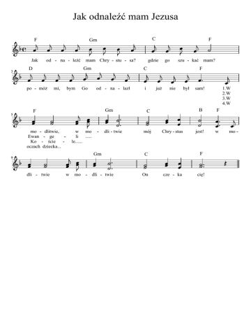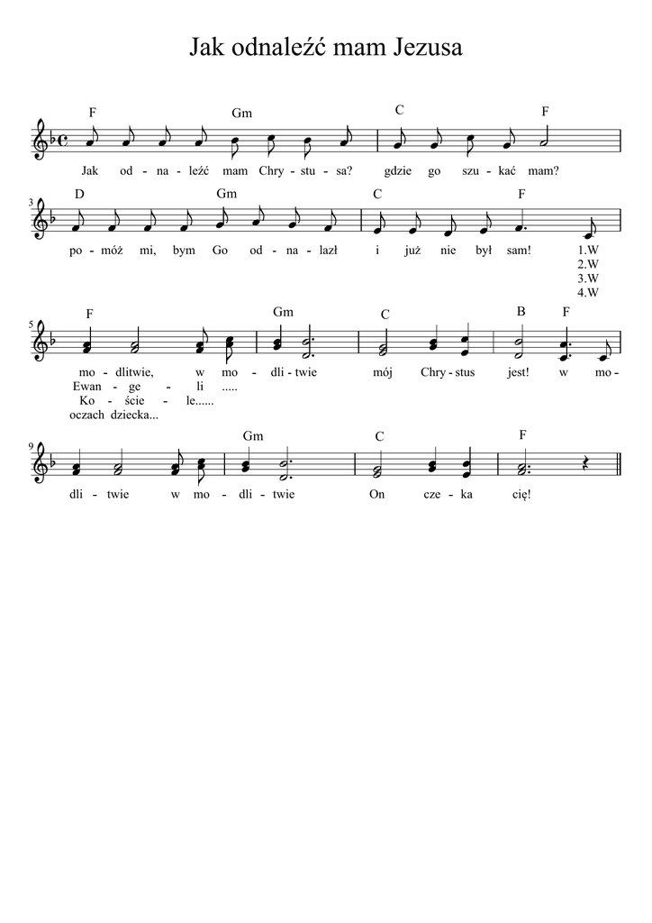 Jak odnaleźć mam Jezusa F Jak 3 od na stu sa? Gm móż mi, bym Go od na Gm F lazł mo dlitwie, Ewan ge Ko ście oczach dziecka... 9 leźć mam Chry D po 5 Gm w mo li ..... le...... dli twie Gm dli twie w mo dli twie C F gdzie go szu C i kać mam? F już nie był sam! B C 1.W 2.W 3.W 4.W F mój Chry stus jest! w F C On cze ka cię! mo