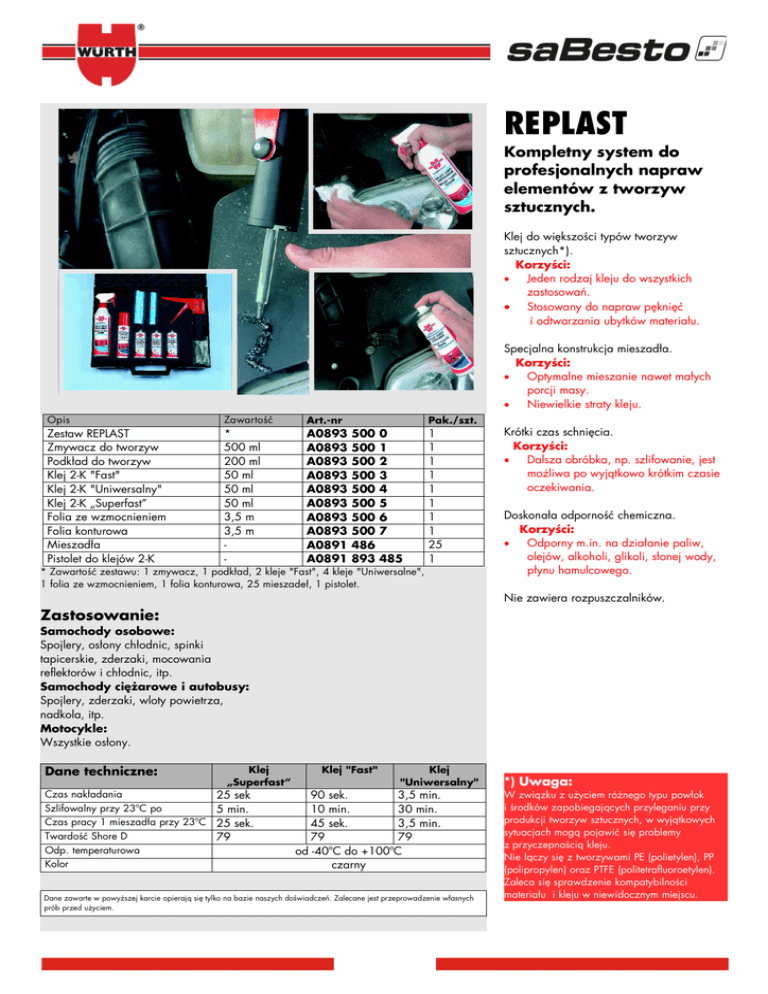 REPLAST Kompletny system do profesjonalnych napraw elementów z tworzyw sztucznych. Klej do większości typów tworzyw sztucznych*). Korzyści: Jeden rodzaj kleju do wszystkich zastosowań. Stosowany do napraw pęknięć i odtwarzania ubytków materiału. Specjalna konstrukcja mieszadła. Korzyści: Optymalne mieszanie nawet małych porcji masy. Niewielkie straty kleju. Opis Zawartość Art.-nr Zestaw REPLAST Zmywacz do tworzyw Podkład do tworzyw Klej 2-K "Fast" Klej 2-K "Uniwersalny" Klej 2-K „Superfast” Folia ze wzmocnieniem Folia konturowa Mieszadła Pistolet do klejów 2-K * 500 ml 200 ml 50 ml 50 ml 50 ml 3,5 m 3,5 m - A0893 A0893 A0893 A0893 A0893 A0893 A0893 A0893 A0891 A0891 Pak./szt. 500 500 500 500 500 500 500 500 486 893 0 1 2 3 4 5 6 7 485 1 1 1 1 1 1 1 1 25 1 * Zawartość zestawu: 1 zmywacz, 1 podkład, 2 kleje "Fast", 4 kleje "Uniwersalne", 1 folia ze wzmocnieniem, 1 folia konturowa, 25 mieszadeł, 1 pistolet. Krótki czas schnięcia. Korzyści: Dalsza obróbka, np. szlifowanie, jest możliwa po wyjątkowo krótkim czasie oczekiwania. Doskonała odporność chemiczna. Korzyści: Odporny m.in. na działanie paliw, olejów, alkoholi, glikoli, słonej wody, płynu hamulcowego. Nie zawiera rozpuszczalników. Zastosowanie: Samochody osobowe: Spojlery, osłony chłodnic, spinki tapicerskie, zderzaki, mocowania reflektorów i chłodnic, itp. Samochody ciężarowe i autobusy: Spojlery, zderzaki, wloty powietrza, nadkola, itp. Motocykle: Wszystkie osłony. Dane techniczne: Klej „Superfast” Czas nakładania 25 sek Szlifowalny przy 23ºC po 5 min. Czas pracy 1 mieszadła przy 23ºC 25 sek. Twardość Shore D 79 Odp. temperaturowa Kolor Klej "Fast" Klej "Uniwersalny" 90 sek. 3,5 min. 10 min. 30 min. 45 sek. 3,5 min. 79 79 od -40ºC do +100ºC czarny Dane zawarte w powyższej karcie opierają się tylko na bazie naszych doświadczeń. Zalecane jest przeprowadzenie własnych prób przed użyciem. *) Uwaga: W związku z użyciem różnego typu powłok i środków zapobiegających przyleganiu przy produkcji tworzyw sztucznych, w wyjątkowych sytuacjach mogą pojawić się problemy z przyczepnością kleju. Nie łączy się z tworzywami PE (polietylen), PP (polipropylen) oraz PTFE (politetrafluoroetylen). Zaleca się sprawdzenie kompatybilności materiału i kleju w niewidocznym miejscu.
