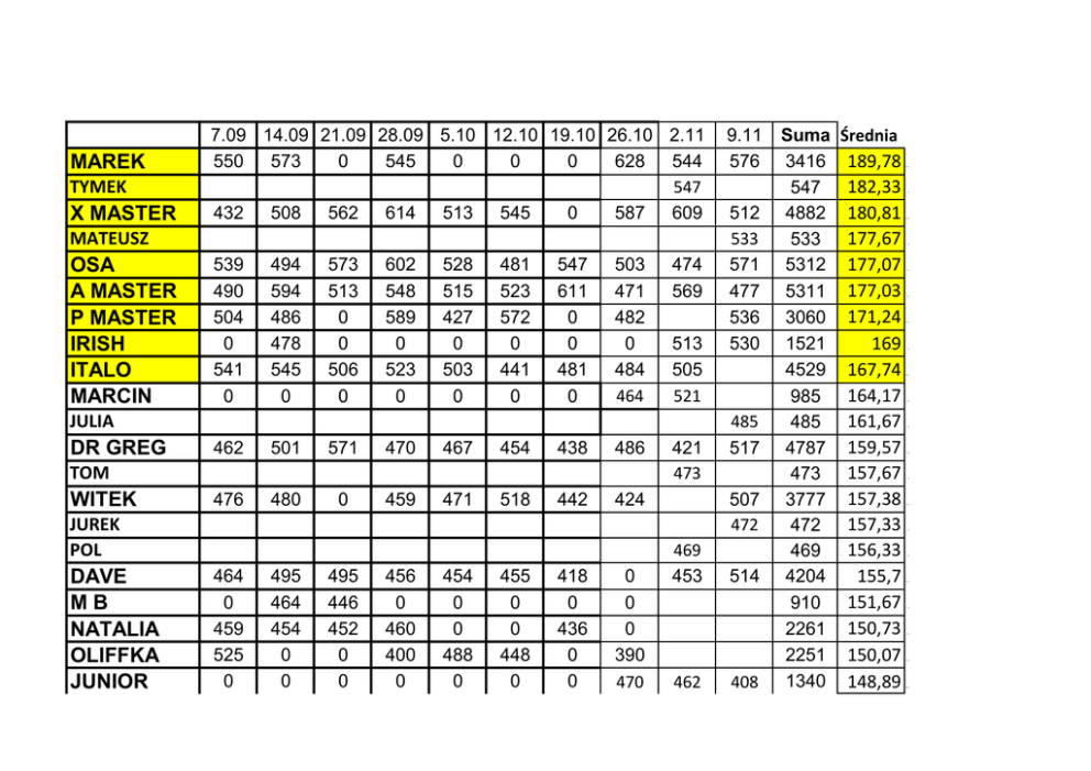 MAREK TYMEK X MASTER 7.09 14.09 21.09 28.09 5.10 12.10 19.10 26.10 2.11 550 573 0 545 0 0 0 628 544 547 432 508 562 614 513 545 0 587 609 MATEUSZ OSA A MASTER P MASTER IRISH ITALO MARCIN 539 490 504 0 541 0 494 594 486 478 545 0 573 513 0 0 506 0 602 548 589 0 523 0 528 515 427 0 503 0 481 523 572 0 441 0 547 611 0 0 481 0 503 471 482 0 484 464 474 569 513 505 521 JULIA DR GREG 462 501 571 470 467 454 438 486 TOM WITEK 476 480 0 459 471 518 442 424 JUREK POL DAVE MB NATALIA OLIFFKA JUNIOR 464 0 459 525 0 495 464 454 0 0 495 446 452 0 0 456 0 460 400 0 454 0 0 488 0 455 0 0 448 0 418 0 436 0 0 421 473 0 0 0 390 470 9.11 576 512 533 571 477 536 530 485 517 507 472 469 453 462 514 408 Suma 3416 547 4882 533 5312 5311 3060 1521 4529 985 485 4787 473 3777 472 469 4204 910 2261 2251 1340 Średnia 189,78 182,33 180,81 177,67 177,07 177,03 171,24 169 167,74 164,17 161,67 159,57 157,67 157,38 157,33 156,33 155,7 151,67 150,73 150,07 148,89 569,3333 547 542,4444 533 531,2 531,1 513,7143 507 503,2222 492,5 485 478,7 473 472,125 472 469 467,1111 455 452,2 450,2 446,6667 MANUELA GRZEGORZ RYSZARD MK MJ BURZA MACIEJ CITKO STOD KANIK PTYS 436 0 416 0 0 416 0 352 330 0 425 0 384 437 438 0 408 0 0 251 0 461 420 0 434 0 0 0 0 0 433 0 452 0 0 0 0 376 0 0 0 0 495 0 0 0 0 0 0 0 0 0 457 0 0 0 0 0 0 0 0 432 471 0 0 0 0 0 0 0 0 459 0 0 0 0 0 0 0 0 461 407 446 468 452 397 230 2223 2211 3938 437 872 416 408 728 330 251 230 148,2 147,4 145,85 145,67 145,33 138,67 136 121,33 110 83,667 76,667 444,6 442,2 437,5556 437 436 416 408 364 330 251 230