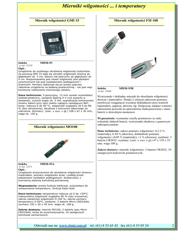Mierniki wilgotności ... i temperatury Miernik wilgotności GMI 15 Indeks Miernik wilgotności FM 100 MIER-93 nr kat. 22270 Opis : Urządzenie do szybkiego określenia wilgotności budynków. Za pomocą GMI 15 daje się określić wilgotność drewna do głębokości ok. 3 cm, betonu lub jastrychu do głębokości ok. 4 cm. Rozpoznawalna jest nawet wilgotność pod płytkami ceramicznymi lub pod wykładzinami podłogowymi i ściennymi. Pomiaru dokonuje się po prostu poprzez nałożenie urządzenia na badaną powierzchnię - nie jest więc konieczne nakłuwanie mierzonego obiektu. Dane techniczne: 3-pozycyjny, 13 mm wysoki wyświetlacz ciekłokrystaliczny, zasilanie baterią 9 V (nie zawarta w dostawie), zużycie prądu ok. 5 mA, sygnalizacja konieczności zmiany baterii przy zbyt niskim napięciu zasilającym BAT, temp. robocza 0 do 50 °C, wilgotność względna od 0 do 80 % (bez obroszenia), obudowa z tworzywa odpornego na uderzenia. Wymiary: (szer. x wys. x gł.) 108 x 67 x 30 mm, waga ok. 150 g. Indeks MIER-93B nr kat. 25648 Wytrzymały i dokładny miernik do określania wilgotności drewna i materiałów. Dzięki 2 różnym zakresom pomiaru możliwość osiągnięcia wysokiej dokładności przy kontroli materiałów, papieru, drewna, itp. Dołączony adapter wartości odniesienia pozwala na sprawdzenie funkcjonowania i stanu baterii w dowolnym momencie. Wyposażenie: wymienne sztyfty pomiarowe ze stali, wskaźnik słabych baterii, wytrzymała obudowa z gumowym zabezpieczeniem. Miernik wilgotności MO100 Dane techniczne: zakres pomiaru wilgotności: 0,2-2 % (materiały), 6-44 % (drewno), dokładność pomiaru wilgotności ±0,05 % (materiały), ±1 % (drewno), zasilanie: 3 baterie CR2032, wymiary: (szer. x wys. x gł.) 47 x 139 x 25 mm, waga 100 g. Zakres dostawy: miernik wilgotności, 3 baterie CR2032, 10 zastępczych końcówek pomiarowych. Indeks MIER-93A nr kat. 22271 Opis : Urządzenie przeznaczone do określania wilgotności drewna i materiałów, pomiaru wilgotności ścian i podłóg przed położeniem wykładzin podłogowych. Dostarczany z wymienną stalową końcówką pomiarową. Wyposażenia: prosta funkcja kalibracji, wyświetlacz do wskazywania temperatury, funkcja Data-Hold. Dane techniczne: temperatura robocza od 0 do +50°C, maksymalna wilgotność względna 90 % (bez oroszenia), zakres wskaźnika wilgotności 0-100 %, zakres pomiaru temperatury 0-50°C, zasilanie: 2 baterie Micro LR03/AAA, wymiary 192 x 30 x 45 mm, waga ok. 108 g. Zakres dostawy: miernik MO100, 2 baterie typu Micro LR03/AAA, torba do przechowywania, 10 zastępczych końcówek pomiarowych. Odwiedź nas na www.elstat.com.pl tel. (61) 8 52 65 42 fax (61) 8 55 05 24 2 Mierniki wilgotności ... i temperatury Miernik wilgotności GMH 3830HF koń.pomiarowe Miernik wilgotności GMH 3830HF Indeks MIER-93C-2 nr kat. 25652 Indeks MIER-93C nr kat. 25650 Cyfrowy i wyjątkowo wytrzymały, ręczny miernik do precyzyjnego określania wilgotności drewna, tynku, materiałów budowlanych z jednoczesnym wskaźnikiem temperatury. Odpowiedni również do materiałów twardych. Końcówki pomiarowe GMS 300/91 1 para końcówek pomiarowych 300 mm do drzazg, wełny drzewnej, papieru, papy, piasku, itp. Miernik wilgotności i temperatury HT 200 Wyposażenie: nowoczesna technika mikroprocesorowa, wysoka dokładność dzięki 464 bezpośrednio zachowanym danym charakterystycznym drewna i 28 materiałom, zintegrowany pomiar temperatury, 8 możliwych do zapamiętania tworzyw do szybkiego wyboru materiału, funkcja Auto-Hold do precyzyjnego określenia wartości pomiaru, wyjście analogowe możliwe do dowolnego skalibrowania, automatyczne wyłączanie. Dane techniczne: zakres pomiaru wilgotności 4-100 %, dokładność pomiaru wilgotności ±0,2 %, zakres pomiaru temperatury -40 do +200°C, dokładność temperatury ±0,5 %, zasilanie: bateria 9 V lub opcjonalny zasilacz sieciowy, wymiary: (szer. x wys. x gł.) 71 x 142 x 26 mm, waga 175 g. Zakres dostawy: przewód pomiarowy GMK 38, elektroda GSE 91, igła pomiarowa GST 91, czujnik temperatury GTF 91, 1 bateria 9 V, etui GKK 3500. Miernik wilgotności GMH 3830HF sondy Indeks MIER-93D nr kat. 25649 Do szybkiego pomiaru wilgotności, temperatury i punktu topnienia. Wyposażenie: wysokiej jakości czujnik, szybki czas reakcji, wysoka dokładność, określenie temperatury topnienia i parowania, funkcja pomiaru wartości maksymalnej, funkcja Hold, przełączanie °C/°F, częstość pomiaru 2,5 pomiarów/sek., podświetlenie wskaźnika. Dane techniczne: zakres pomiaru wilgotności 0-100 % RH, dokładność pomiaru wilgotności ±2 % RH, zakres pomiaru temperatury -30 do +100°C, dokładność pomiaru temperatury ±0,5°C, zasilanie: bateria 9 V, wymiary: (szer. x wys. x gł.) 45 x 255 x 34 mm, waga 200 g, częstość pomiarów 2,5 pomiarów/sek., rozdzielczość 0,01 %, 0,01°C, do skalibrowania wg ISO/DKD. Indeks MIER-93C-1 Zakres dostawy: miernik, bateria 9 V, etui do przechowywania. nr kat. 25651 Sondy szczotkowe GBSL 91 - 1 para sond szczotkowych do głębokości 300 mm. 3 Odwiedź nas na www.elstat.com.pl tel. (61) 8 52 65 42 fax (61) 8 55 05 24 Mierniki wilgotności ... i temperatury Miernik wilgotności GFTH95 Indeks MIER-93E nr kat. 25656 Do szybkiego pomiaru wilgotności powietrza i temperatury. Dane techniczne: zakres pomiaru wilgotności 1095 % RH, dokładność pomiaru wilgotności ±2 % RH, zakres pomiaru temperatury -20 do +70°C, dokładność pomiaru temperatury ±3°C (wg PT 1000 DIN KI,B), zasilanie: bateria 9 V, wymiary: (szer. x wys. x gł.) 67 x 141 x 30 mm, waga 154 g, rozdzielczość temperatury 0,1°C, wilgotności 0,1 % RH, do skalibrowania wg ISO/DKD. Zakres dostawy: termo-higrometr, bateria 9 V. Odwiedź nas na www.elstat.com.pl tel. (61) 8 52 65 42 fax (61) 8 55 05 24 4