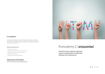 Co zyskujesz? Zapewniając profesjonalnego tłumacza osobom niesłyszącym, umożliwisz im swobodną komunikację, a także unikniesz konsekwencji wynikających z niedostosowania się do Ustawy o języku migowym. Co więcej, podnosisz prestiż swojej Instytucji, która staje się organizacją przyjazną osobom niesłyszącym. Atrybuty wirtualnego tłumacza: Pomożemy Ci zrozumieć • obsługa osób niesłyszących • dostępność tłumaczy online w godzinach pracy urzędu • wykorzystanie standardowych łączy internetowych • atrakcyjna opłata miesięczna • działanie przeciw wykluczeniu społecznemu. Zapraszamy do kontaktu: [email protected] Wirtualny tłumacz języka migowego zapewni profesjonalną i komfortową obsługę osób niesłyszących Witamy! Wirtualny tłumacz języka migowego Dzięki naszej usłudze niesłyszący Klient w Twojej Instytucji będzie Klientem o równych szansach. System jest doskonale dostosowany do problemów osób niesłyszących i słabosłyszących w instytucjach publicznych. Zapewniamy: • tłumaczenia obydwu języków migowych funkcjonujących w Polsce • dostępność tłumaczy w godzinach pracy Twojej Instytucji • dostarczenie urządzeń do połączeń wideokonferencyjnych z tłumaczami oraz materiałów do oznaczenia stanowiska • standardowe koszty wdrożenia i eksploatacji oraz szybkie rozpoczęcie pracy od momentu podjęcia decyzji o zakupie usługi • profesjonalne szkolenie pracowników z zakresu obsługi osób niesłyszących. Język migowy językiem urzędowym? Jak działa wirtualny tłumacz języka migowego? Osoby niesłyszące spychane są na margines życia społecznego. W placówkach zdrowia, bankach, urzędach i innych instytucjach publicznych bardzo rzadko można spotkać pracownika, który potrafi posługiwać się językiem migowym. Niesłyszący często nie posługują się językiem pisanym, przez co załatwienie najprostszych spraw urasta do rangi ogromnego problemu. Możesz to zmienić. Co Ustawa o jęzku migowym oznacza dla instytucji publicznych? Od 1 kwietnia 2012 roku każdy podmiot gospodarczy obsługujący obywateli musi zagwarantować osobom niesłyszącym i słabosłyszącym, posługującym się językiem migowym, możliwość swobodnej komunikacji z pracownikami odpowiedzialnymi za obsługę Klienta. Realizacja tego celu jest możliwa poprzez zapewnienie tłumacza języka migowego. • Osoba niesłysząca przychodzi do Twojej Instytucji, aby zostać obsłużonym tak jak każdy inny Klient. • Przy wejściu zauważa wyraźną informację, opatrzoną rozpoznawalnym przez niego symbolem, która kieruje go do miejsca, gdzie znajduje się stanowisko zdalnego tłumacza online. • Po obejrzeniu filmu instruktażowego, przez dotyknięcie przycisku na ekranie, zostaje połączony wideokonferencyjnie z jednym z naszych profesjonalnych tłumaczy. • Tłumacz dowiaduje się, w jakiej sprawie przyszedł interesant, a następnie zawiadamia odpowiednią osobę do obsługi danej sprawy. • Pracownik podchodzi do stanowiska, gdzie czeka osoba niesłysząca, i przy wsparciu tłumacza online kompleksowo załatwia sprawę.