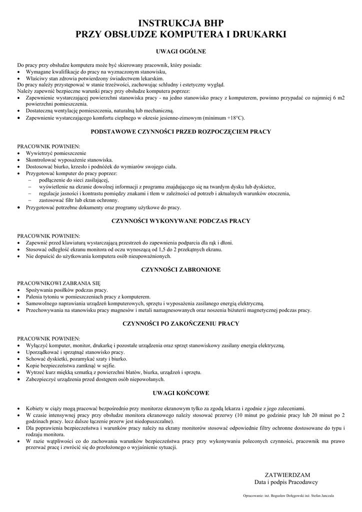 INSTRUKCJA BHP PRZY OBSŁUDZE KOMPUTERA I DRUKARKI UWAGI OGÓLNE Do pracy przy obsłudze komputera może być skierowany pracownik, który posiada: • Wymagane kwalifikacje do pracy na wyznaczonym stanowisku, • Właściwy stan zdrowia potwierdzony świadectwem lekarskim. Do pracy należy przystępować w stanie trzeźwości, zachowując schludny i estetyczny wygląd. Należy zapewnić bezpieczne warunki pracy przy obsłudze komputera poprzez: • Zapewnienie wystarczającej powierzchni stanowiska pracy - na jedno stanowisko pracy z komputerem, powinno przypadać co najmniej 6 m2 powierzchni pomieszczenia. • Dostateczną wentylację pomieszczenia, naturalną lub mechaniczną. • Zapewnienie wystarczającego komfortu cieplnego w okresie jesienne-zimowym (minimum +18°C). PODSTAWOWE CZYNNOŚCI PRZED ROZPOCZĘCIEM PRACY PRACOWNIK POWINIEN: • Wywietrzyć pomieszczenie • Skontrolować wyposażenie stanowiska. • Dostosować biurko, krzesło i podnóżek do wymiarów swojego ciała. • Przygotować komputer do pracy poprzez: − podłączenie do sieci zasilającej, − wyświetlenie na ekranie dowolnej informacji z programu znajdującego się na twardym dysku lub dyskietce, − regulacje jasności i kontrastu pomiędzy znakami i tłem w zależności od potrzeb i aktualnych warunków otoczenia, − zastosować filtr lub ekran ochronny. • Przygotować potrzebne dokumenty oraz programy użytkowe do pracy. CZYNNOŚCI WYKONYWANE PODCZAS PRACY PRACOWNIK POWINIEN: • Zapewnić przed klawiaturą wystarczającą przestrzeń do zapewnienia podparcia dla rąk i dłoni. • Stosować odległość ekranu monitora od oczu wynoszącą od 1,5 do 2 przekątnych ekranu. • Nie dopuścić do użytkowania komputera osób nieupoważnionych. CZYNNOŚCI ZABRONIONE PRACOWNIKOWI ZABRANIA SIĘ • Spożywania posiłków podczas pracy. • Palenia tytoniu w pomieszczeniach pracy z komputerem. • Samowolnego naprawiania urządzeń komputerowych, sprzętu i wyposażenia zasilanego energią elektryczną. • Przechowywania na stanowisku pracy magnesów i metali namagnesowanych oraz noszenia biżuterii magnetycznej podczas pracy. CZYNNOŚCI PO ZAKOŃCZENIU PRACY PRACOWNIK POWINIEN: • Wyłączyć komputer, monitor, drukarkę i pozostałe urządzenia oraz sprzęt stanowiskowy zasilany energia elektryczną. • Uporządkować i sprzątnąć stanowisko pracy. • Schować dyskietki, pozamykać szaty i biurko. • Kopie bezpieczeństwa zamknąć w sejfie. • Wytrzeć kurz miękką szmatką z powierzchni blatów, biurka, urządzeń i sprzętu. • Zabezpieczyć urządzenia przed dostępem osób niepowołanych. UWAGI KOŃCOWE • • • • Kobiety w ciąży mogą pracować bezpośrednio przy monitorze ekranowym tylko za zgodą lekarza i zgodnie z jego zaleceniami. W czasie intensywnej pracy przy obsłudze monitora ekranowego należy stosować przerwy (10 minut po godzinie pracy lub 20 minut po 2 godzinach pracy. lecz dalsze łączenie przerw jest niedopuszczalne). Dla poprawienia bezpieczeństwa i warunków pracy należy na ekrany monitorów stosować odpowiednie filtry ochronne dostosowane do typu i rodzaju monitora. W razie wątpliwości co do zachowania warunków bezpieczeństwa pracy przy wykonywaniu poleconych czynności, pracownik ma prawo przerwać pracę i zwrócić się do przełożonego o wyjaśnienie sytuacji. ZATWIERDZAM Data i podpis Pracodawcy Opracowanie: inż. Bogusław Dołęgowski inż. Stefan Janczala
