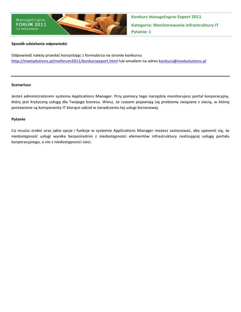 Konkurs ManageEngine Expert 2011 Kategoria: Monitorowanie infrastruktury IT Pytanie: 1 Sposób udzielania odpowiedzi Odpowiedź należy przesład korzystając z formularza na stronie konkursu http://mwtsolutions.pl/meforum2011/konkursexpert.html lub emailem na adres [email protected] Scenariusz Jesteś administratorem systemu Applications Manager. Przy pomocy tego narzędzia monitorujesz portal korporacyjny, który jest krytyczną usługą dla Twojego biznesu. Wiesz, że czasem pojawiają się problemy związane z siecią, w której postawione są komponenty IT biorące udział w świadczeniu tej usługi biznesowej. Pytanie Co musisz zrobid oraz jakie opcje i funkcje w systemie Applications Manager możesz zastosowad, aby upewnid się, że niedostępnośd usługi wynika bezpośrednio z niedostępności elementów infrastruktury realizującej usługę portalu korporacyjnego, a nie z niedostępności sieci.