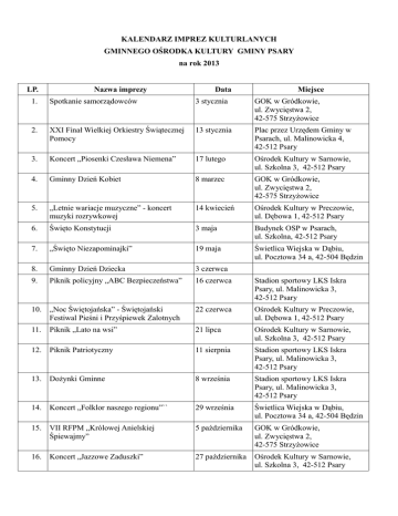 KALENDARZ IMPREZ KULTURLANYCH GMINNEGO OŚRODKA KULTURY GMINY PSARY na rok 2013 LP. Nazwa imprezy Data Miejsce 1. Spotkanie samorządowców 3 stycznia GOK w Gródkowie, ul. Zwycięstwa 2, 42-575 Strzyżowice 2. XXI Finał Wielkiej Orkiestry Świątecznej Pomocy 13 stycznia Plac przez Urzędem Gminy w Psarach, ul. Malinowicka 4, 42-512 Psary 3. Koncert „Piosenki Czesława Niemena” 17 lutego Ośrodek Kultury w Sarnowie, ul. Szkolna 3, 42-512 Psary 4. Gminny Dzień Kobiet 8 marzec GOK w Gródkowie, ul. Zwycięstwa 2, 42-575 Strzyżowice 5. „Letnie wariacje muzyczne” - koncert muzyki rozrywkowej 14 kwiecień Ośrodek Kultury w Preczowie, ul. Dębowa 1, 42-512 Psary 6. Święto Konstytucji 3 maja Budynek OSP w Psarach, ul. Szkolna, 42-512 Psary 7. „Święto Niezapominajki” 19 maja Świetlica Wiejska w Dąbiu, ul. Pocztowa 34 a, 42-504 Będzin 8. Gminny Dzień Dziecka 3 czerwca 9. Piknik policyjny „ABC Bezpieczeństwa” 16 czerwca Stadion sportowy LKS Iskra Psary, ul. Malinowicka 3, 42-512 Psary 10. „Noc Świętojańska” - Świętojański Festiwal Pieśni i Przyśpiewek Zalotnych 22 czerwca Ośrodek Kultury w Preczowie, ul. Dębowa 1, 42-512 Psary 11. Piknik „Lato na wsi” 21 lipca Ośrodek Kultury w Sarnowie, ul. Szkolna 3, 42-512 Psary 12. Piknik Patriotyczny 11 sierpnia Stadion sportowy LKS Iskra Psary, ul. Malinowicka 3, 42-512 Psary 13. Dożynki Gminne 8 września Stadion sportowy LKS Iskra Psary, ul. Malinowicka 3, 42-512 Psary 14. Koncert „Folklor naszego regionu”`` 29 września Świetlica Wiejska w Dąbiu, ul. Pocztowa 34 a, 42-504 Będzin 15. VII RFPM „Królowej Anielskiej Śpiewajmy” 5 października GOK w Gródkowie, ul. Zwycięstwa 2, 42-575 Strzyżowice 16. Koncert „Jazzowe Zaduszki” 27 października Ośrodek Kultury w Sarnowie, ul. Szkolna 3, 42-512 Psary 17. „Święto Niepodległości” 11 listopada Świetlica Wiejska w Dąbiu, ul. Pocztowa 34 a, 42-504 Będzin 18. Konkurs „Mam talent” 24 listopada GOK w Gródkowie, ul. Zwycięstwa 2, 42-575 Strzyżowice 19. Barbórka 4 grudzień GOK w Gródkowie, ul. Zwycięstwa 2, 42-575 Strzyżowice 20. Gminne Mikołajki 6 grudzień GOK w Gródkowie, ul. Zwycięstwa 2, 42-575 Strzyżowice 21. Koncert Kolęd 22 grudzień Parafia pw. Św. Piotra i Pawła Apostołów w Psarach, ul. Zwycięstwa 40, 42-512 Psary