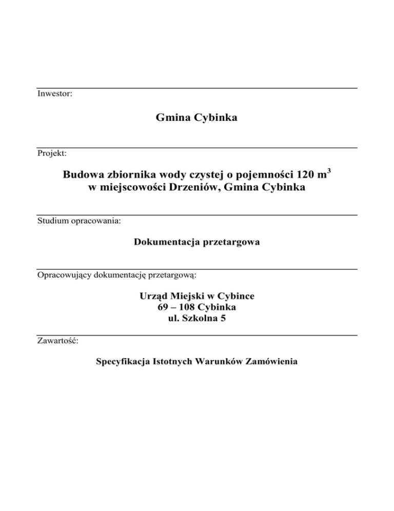 Inwestor: Gmina Cybinka Projekt: Budowa zbiornika wody czystej o pojemności 120 m3 w miejscowości Drzeniów, Gmina Cybinka Studium opracowania: Dokumentacja przetargowa Opracowujący dokumentację przetargową: Urząd Miejski w Cybince 69 – 108 Cybinka ul. Szkolna 5 Zawartość: Specyfikacja Istotnych Warunków Zamówienia Specyfikacja Istotnych Warunków Zamówienia dla zamówienia o szacunkowej wartości nieprzekraczającej 60.000 euro ZAMAWIAJĄCY: Urząd Miejski w Cybince 69 – 108 Cybinka ul. Szkolna 5 tel. (068) 391 13 08, fax (068) 391 13 63 www.cybinka.pl e-mail: [email protected] O udzielenie zamówienia mogą ubiegać się wyłącznie Wykonawcy, których oferta odpowiada zasadom określonym w ustawie z dnia 29 stycznia 2004r. - Prawo zamówień publicznych (Dz. U.Nr 19, poz. 177) i spełnia wymagania określone w niniejszej Specyfikacji Istotnych Warunków Zamówienia. Wykonawcą moŜe być osoba fizyczna, osoba prawna lub jednostka organizacyjna nie posiadająca osobowości prawnej oraz podmioty te występujące wspólnie. Podmioty występujące wspólnie ponoszą solidarną odpowiedzialność za nie wykonanie lub nienaleŜyte wykonanie zamówienia. Wykonawcy wspólnie ubiegający się o udzielenie zamówienia ustanawiają pełnomocnika do reprezentowania ich w postępowaniu o udzielenie zamówienia albo reprezentowania w postępowaniu i zawarcia umowy w sprawie zamówienia publicznego. PODSTAWA PRAWNA Ustawa z dnia 29 stycznia 2004r. - Prawo zamówień publicznych 177) (Dz. U. z 2004r.Nr 19, poz. TRYB UDZIELENIA ZAMÓWIENIA – przetarg nieograniczony Formularz zawierający Specyfikację Istotnych Warunków Zamówienia moŜna osobiście w Urzędzie Miejskim w Cybince (pok. nr 2a) lub za zaliczeniem pocztowym. odebrać ROZDZIAŁ I – INFORMACJE DOTYCZĄCE PRZEDMIOTU ZAMÓWIENIA 1. Określenie przedmiotu zamówienia Zamawiający, za pośrednictwem ogłoszenia na stronie internetowej www.cybinka.pl oraz na tablicy ogłoszeń w swojej siedzibie ogłosił przetarg nieograniczony na budowę zbiornika wody czystej o pojemności 120m3 o konstrukcji Ŝelbetowej w miejscowości Drzeniów, Gmina Cybinka. Szczegółowy zakres robót do wykonania określa kosztorys stanowiący załącznik nr 2 do niniejszej specyfikacji. Technologia wykonawstwa wg punktów opisu technologicznego zawartego w punktach przedmiaru robót (baza normatywna WKNR itp.) W załączeniu do SIWZ wyciąg z opisu technologicznego projektowanej inwestycji. PowyŜszy zakres podzielono na pozycje elementów: 1. Roboty ziemne 2. Roboty konstrukcyjne 3. Roboty ślusarsko - kowalskie 4. Roboty elewacyjne W zaproponowanych cenach jednostkowych wykonania przedmiotu zamówienia naleŜy ująć roboty i koszty uzupełniające: - koszt utrzymania placu budowy i zaplecza, koszt wykonania przyłączeń wodociągowych i energetycznych dla potrzeb terenu budowy oraz ponoszenia kosztów ich zuŜycia, - koszty ewentualnych wyłączeń i włączeń energii elektrycznej, - koszt obsługi geodezyjnej (dla wymaganego zakresu robót), - projekt zmiany organizacji ruchu drogowego na okres realizacji robót uzgodniony przez wymagane instytucje, - koszty zabezpieczenia i oznakowania robót, - opłaty z tytułu zajęcia pasa drogowego, - koszty uzyskania i dostarczenia wymaganych atestów, koszty badań, prób i rozruchu, - koszty opracowania inwentaryzacji powykonawczej wykonanych robót ( 4 komplety map) wraz ze szkicami polowymi i wykazem długości odcinków poszczególnych średnic, - koszty demontaŜu, napraw, montaŜu ogrodzeń posesji oraz innych uszkodzeń obiektów istniejących i elementów zagospodarowania terenu, - inne koszty związane z procesem wykonawstwa mające uszczegółowić technologię robót i szczegóły rozwiązań w oparciu o dostarczony przez Zamawiającego projekt budowlany i przedmiar robót oraz inne roboty nie ujęte w niniejszej SIWZ, lecz niezbędne w celu osiągnięcia zamierzonego efektu rzeczowego. Uwaga: Projekt budowlany do wglądu w siedzibie Zamawiającego po uprzednim kontakcie telefonicznym pod nr tel. 068 391 13 08. UWAGA: Zamawiający dopuszcza moŜliwość wyłączenia z realizacji części robót objętych przetargiem. Decyzja o zakresie j.w. zostanie podjęta w toku procesu inwestycyjnego. Wartość robót włączonych zostanie rozliczona wg zasad określonych niniejszą specyfikacją. 2. Wymagany termin wykonania zamówienia Wymagany termin wykonania przedmiotowego zamówienia publicznego - od daty zakończenia postępowania przetargowego do 30 grudnia 2006 roku. Wykonany obiekt zostanie przekazany Zamawiającemu stosownie do obowiązującego prawa budowlanego. Gwarancja Wykonawca winien udzielić na wykonane roboty gwarancji na okres 36 miesięcy dla wszystkich elementów robót objętych zamówieniem. 3. Określenie części zamówienia, która nie moŜe zostać powierzona podwykonawcom. Zgodnie z art. 36 ust.4 ustawy – Prawo zamówień publicznych Zamawiający określa następujące roboty budowlane, które mogą zostać powierzone podwykonawcom: - roboty inŜynieryjne. ROZDZIAŁ II – OPIS OBLICZENIA CENY OFERTY, KRYTERIÓW I SPOSOBÓW DOKONYWANIA OCENY OFERTY 1. Opis obliczenia ceny oferty Wykonawca określi ceny na wszystkie elementy zamówienia wymienione w ślepym kosztorysie, który po wypełnieniu przez Wykonawcę stanowić będzie kosztorys ofertowy – załącznik do oferty, określającej ostateczną cenę oferty brutto. Dla pełnego zakresu robót związanych z przedmiotem zamówienia – Wykonawcy, uczestnicy niniejszego postępowania, mają bezwzględny obowiązek wypełniania wszystkich pozycji załączonego ślepego kosztorysu. Jeśli dla danej pozycji kosztorysowej Wykonawca nie zamierza określić ceny jednostkowej (np. w wyniku ujęcia kosztu tej pozycji w innej) naleŜy bezwzględnie wpisać cyfrę“0,0”. Niedopuszczalne jest stosowanie znaków graficznych typu: klamry, powtórzenia itp., mogących powodować niejasności w interpretacji ceny oferty. Wykonawca ok