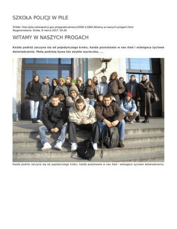 SZKOŁA POLICJI W PILE Źródło: http://pila.szkolapolicji.gov.pl/spp/aktualnosci/2009-1/1892,Witamy-w-naszych-progach.html Wygenerowano: Środa, 8 marca 2017, 05:26 WITAMY W NASZYCH PROGACH Każda podróż zaczyna się od pojedynczego kroku, każda pozostawia w nas ślad i wzbogaca życiowe doświadczenia. Małą podróżą bywa też zwykła wycieczka, ... Każda podróż zaczyna się od pojedynczego kroku, każda pozostawia w nas ślad i wzbogaca życiowe doświadczenia. Małą podróżą bywa też zwykła wycieczka, która przynosi ciekawe wrażenia i nową wiedzę. Takie właśnie odczucia mieli zapewne uczniowie z klasy 2a z Zespołu Szkół Ponadgimnazjalnych nr 3 w Pile, którzy odwiedzili naszą Szkołę. Młodzież z zaciekawieniem obejrzała szkolną bibliotekę, w której znajduje się ponad 44 tysiące woluminów. Podziwiała także zabytkowe witraże znajdujące się w auli i galerii sztuki ?Akwarium?. Poznała dystynkcje policyjne oraz elementy policyjnego umundurowania. Największe wrażenie na gościach zrobiły jednak sale tematyczne: daktyloskopii oraz pierwszej pomocy przedmedycznej. Uczniowie zwiedzili także park koło Szkoły, który o tej porze roku wygląda naprawdę pięknie. (04.11.09) Ocena: 0/5 (0) Tweetnij