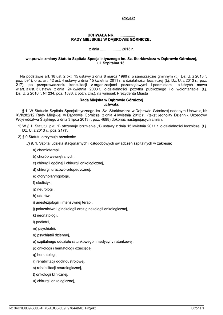 Projekt UCHWAŁA NR .................... RADY MIEJSKIEJ W DĄBROWIE GÓRNICZEJ z dnia .................... 2013 r. w sprawie zmiany Statutu Szpitala Specjalistycznego im. Sz. Starkiewicza w Dąbrowie Górniczej, ul. Szpitalna 13. Na podstawie art. 18 ust. 2 pkt. 15 ustawy z dnia 8 marca 1990 r. o samorządzie gminnym (t.j. Dz. U. z 2013 r. poz. 594), oraz art. 42 ust. 4 ustawy z dnia 15 kwietnia 2011 r. o działalności leczniczej (t.j. Dz. U. z 2013 r., poz. 217), po przeprowadzeniu konsultacji z organizacjami pozarządowymi i podmiotami, o których mowa w art. 3 ust. 3 ustawy z dnia 24 kwietnia 2003 r. o działalności pożytku publicznego i o wolontariacie (t.j. Dz. U. z 2010 r. Nr 234, poz. 1536, z późn. zm.), na wniosek Prezydenta Miasta Rada Miejska w Dąbrowie Górniczej uchwala: § 1. W Statucie Szpitala Specjalistycznego im. Sz. Starkiewicza w Dąbrowie Górniczej nadanym Uchwałą Nr XVI/282/12 Rady Miejskiej w Dąbrowie Górniczej z dnia 4 kwietnia 2012 r., (tekst jednolity Dziennik Urzędowy Województwa Śląskiego z dnia 3 lipca 2013 r. poz. 4698) dokonać następujących zmian: 1) W § 1. Statutu pkt 1) otrzymuje brzmienie „1) ustawy z dnia 15 kwietnia 2011 r. o działalności leczniczej (t.j. Dz. U. z 2013 r., poz. 217)”, 2) § 9 Statutu otrzymuje brzmienie: „§ 9. 1. Szpital udziela stacjonarnych i całodobowych świadczeń szpitalnych w zakresie: a) chemioterapii, b) chorób wewnętrznych, c) chirurgii ogólnej i chirurgii onkologicznej, d) chirurgii urazowo-ortopedycznej, e) otorynolaryngologii, f) okulistyki, g) neurologii, h) udarów, i) anestezjologii i intensywnej terapii, j) położnictwa i ginekologii oraz ginekologii onkologicznej, k) neonatologii, l) pediatrii, m) psychiatrii, n) psychiatrii dziennej, o) szpitalnego oddziału ratunkowego i medycyny ratunkowej, p) onkologii i hematologii dziecięcej, q) hematologii, r) rehabilitacji ogólnoustrojowej, s) rehabilitacji neurologicznej, t) onkologii klinicznej, u) chirurgii onkologicznej, Id: 34C1E0D9-380E-4F73-ADC8-6E9F97844BA8. Projekt Strona 1 w) ginekologii onkologicznej. Świadczenia w zakresie: okulistyki, otorynolaryngologii, chirurgii urazowoortopedycznej, chirurgii ogólnej, ginekologii, urologii, chirurgii onkologicznej, ginekologii onkologicznej, laryngologii onkologicznej, onkologii i hematologii dziecięcej oraz chemioterapii udzielane mogą być w trybie chirurgii jednego dnia. 2. Szpital udziela ambulatoryjnych świadczeń w zakresie: a) onkologii i hematologii dziecięcej, b) proktologii, c) gastroenterologii, d) hematologii, e) onkologii, f) chorób tarczycy, g) chorób piersi, h) rehabilitacji i rehabilitacji dziecięcej (w zakładzie rehabilitacji), i) neurologii, j) ginekologii i położnictwa, k) otorynolaryngologii, l) okulistyki, m) chirurgii ogólnej, n) chirurgii urazowo-ortopedycznej, o) patologii i kontroli rozwoju noworodka, p) diabetologii, q) anestezjologii, r) psychiatrii, s) wad postawy, t) pulmonologii dziecięcej, u) alergologii dziecięcej, v) profilaktyki i leczenia wrodzonej dysplazji stawów biodrowych u dzieci, w) sportowo-lekarskiej i medycyny sportowej dla dzieci i młodzieży, y) chirurgii onkologicznej, z) ginekologii onkologicznej, za) leczenia bólu, zb) onkologii dziecięcej, zc) hematologii dziecięcej, zd) chirurgii onkologicznej dziecięcej, ze) leczenia obrzęku limfatycznego, zf) medycyny nuklearnej, zg) radioterapii, zh) immunologii, zi) teleradioterapii, zj) brachyterapii, zk) tomografii komputerowej, zl) rezonansu magnetycznego, zm) medycyny paliatywnej, Id: 34C1E0D9-380E-4F73-ADC8-6E9F97844BA8. Projekt Strona 2 zn) onkologii klinicznej, zo) otorynolaryngologii onkologicznej, zp) histopatologii, zq) elektromiografii (EMG). 3. Szpital udziela stacjonarnych i całodobowych świadczeń zdrowotnych innych niż szpitalne w zakresie świadczeń pielęgnacyjno-opiekuńczo-leczniczych, hospicjów oraz medycyny paliatywnej. 4. Szpital udziela świadczeń w zakresie medycyny pracy. 5. Szpital udziela świadczeń w zakresie diagnostyki medycznej i obrazowej. 6. Szpital udziela świadczeń zdrowotnych w ramach podstawowej opieki zdrowotnej w zakresie: nocnej i świątecznej wyjazdowej opieki lekarskiej i pielęgniarskiej, nocnej i świątecznej ambulatoryjnej opieki lekarskiej i pielęgniarskiej oraz transportu sanitarnego.”; 3) W § 19 ust. 1 Statutu lit. d) otrzymuje brzmienie: „d) Główny Księgowy,”. 4) § 22 Statutu otrzymuje brzmienie: „§ 22. Gospodarka finansowa Szpitala opiera się na zasadach ustalonych w: 1) ustawie z dnia 15 kwietnia 2011 r. o działalności leczniczej (t.j. Dz.U. z 2013 r. poz. 217) 2) ustawie z dnia z późn. zm.) 29 września 1994 r. o rachunkowości (t.j. Dz.U. z 2013 r., poz. 330, 3) ustawie z dnia 27 sierpnia 2009 r. o finansach publicznych (Dz.U. z 2009 r. Nr 157, poz. 1240, z późn. zm.)”; 5) W § 27 ust.2 otrzymuje brzmienie: „2. Organem zatwierdzającym sprawozdanie finansowe Szpitala w rozumieniu ustawy o rachunkowości (t.j. Dz.U. z 2013 r., poz. 330, z późn. zm.) jest Rada Miejska w Dąbrowie Górniczej.”; 6) Załącznik do Statutu otrzymuje brzmienie, zgodnie z załącznikiem do niniejszej uchwały Rady Miejskiej. § 2. Wykonanie uchwały powierza się Prezydentowi Miasta. § 3. Uchwała wchodzi w życie po upływie 14 dni od dnia ogłoszenia w Dzienniku Urzędowym Województwa Śląskiego. Przewodnicząca Rady Miejskiej w Dąbrowie Górniczej Agnieszka Pasternak Id: 34C1E0D9-380E-4F73-ADC8-6E9F97844BA8. Projekt Strona 3 Załącznik do Uchwały Nr .................... Rady Miejskiej w Dąbrowie Górniczej z dnia....................2013 r. Załącznik do Statutu Szpitala Specjalistycznego im. Sz. Starkiewicza w Dąbrowie Górniczej, ul. Szpitalna 13 Wykaz jednostek organizacyjnych, komórek organizacyjnych wykonujących zadania statutowe Ogólna liczba łóżek – 616 I. Jednostki organizacyjne: 1) Szpital 2) Przyszpitalna Przychodnia Specjalistyczna 3) Dział Diagnostyki Medycznej 4) Zakład Rehabilitacji