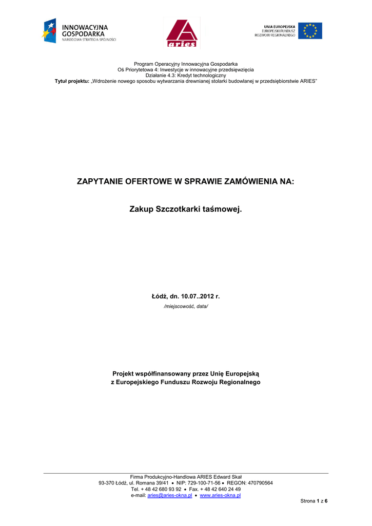 Program Operacyjny Innowacyjna Gospodarka Oś Priorytetowa 4: Inwestycje w innowacyjne przedsięwzięcia Działanie 4.3: Kredyt technologiczny Tytuł projektu: „Wdrożenie nowego sposobu wytwarzania drewnianej stolarki budowlanej w przedsiębiorstwie ARIES” ZAPYTANIE OFERTOWE W SPRAWIE ZAMÓWIENIA NA: Zakup Szczotkarki taśmowej. Łódź, dn. 10.07..2012 r. /miejscowość, data/ Projekt współfinansowany przez Unię Europejską z Europejskiego Funduszu Rozwoju Regionalnego Firma Produkcyjno-Handlowa ARIES Edward Skał 93-370 Łódź, ul. Romana 39/41 NIP: 729-100-71-56 REGON: 470790564 Tel. + 48 42 680 93 92 Fax. + 48 42 640 24 49 e-mail: [email protected] www.aries-okna.pl Strona 1 z 6 Program Operacyjny Innowacyjna Gospodarka Oś Priorytetowa 4: Inwestycje w innowacyjne przedsięwzięcia Działanie 4.3: Kredyt technologiczny Tytuł projektu: „Wdrożenie nowego sposobu wytwarzania drewnianej stolarki budowlanej w przedsiębiorstwie ARIES” 1. Nazwa i adres Zamawiającego: ARIES Firma Produkcyjno- Handlowa Edward Skał NIP: 729-100-71-56 REGON: 470790564 Adres: 93-370 Łódź, ul. Romana 39/41 Tel. +48 42 640 24 49, 680 93 92 Fax. +48 42 640 24 49 2. Postanowienia ogólne: Zamówienie udzielane będzie w trybie postępowania ofertowego. Zamawiający nie dopuszcza składania ofert częściowych. Zamawiający nie dopuszcza składania ofert wariantowych. 3. Opis przedmiotu zamówienia. Przedmiotem zamówienia jest zakup Szczotkarki taśmowej. Szczotkarka winna zapewniać precyzyjne szlifowanie drewna profilowanego (ramiaki okienne i drzwiowe) w fazie międzyoperacyjnej np. po impregnacji lub podkładzie. Szczotkarka winna posiadać jeden lub dwa obszary szlifowania każdy o szerokości minimum 100 mm. Każdy obszar o innej gradacji papieru ściernego i wysokości szczotek. Elementem roboczym szczotkarki jest pas segmentowy wyposażony w kombinację szczotek oraz listków papieru ściernego. Konstrukcja pasa winna umożliwiać łatwą wymianę zużytych segmentów na nowe. Zróżnicowanie wysokości szczotek i papieru winno umożliwiać szlifowanie powierzchni płaskich oraz głęboko profilowanych. 4. Termin realizacji zamówienia. Sierpień 2012 r. Firma Produkcyjno-Handlowa ARIES Edward Skał 93-370 Łódź, ul. Romana 39/41 NIP: 729-100-71-56 REGON: 470790564 Tel. + 48 42 680 93 92 Fax. + 48 42 640 24 49 e-mail: [email protected] www.aries-okna.pl Strona 2 z 6 Program Operacyjny Innowacyjna Gospodarka Oś Priorytetowa 4: Inwestycje w innowacyjne przedsięwzięcia Działanie 4.3: Kredyt technologiczny Tytuł projektu: „Wdrożenie nowego sposobu wytwarzania drewnianej stolarki budowlanej w przedsiębiorstwie ARIES” 5. Opis warunków udziału w postępowaniu oraz sposobu dokonywania oceny spełnienia tych warunków: 5.1. W postępowaniu mogą wziąć udział Wykonawcy, którzy spełniają następujące warunki: a. posiadają uprawnienia do wykonywania działalności lub czynności w zakresie odpowiadającym przedmiotowi zamówienia, b. posiadają niezbędną wiedzę i doświadczenie oraz dysponują potencjałem technicznym i osobami zdolnymi do wykonania zamówienia. 5.2. Ocena spełnienia warunków udziału w niniejszym postępowaniu dokonana zostanie na zasadzie spełnia / nie spełnia w oparciu o informacje zawarte w dokumentach i oświadczeniach złożonych przez Wykonawców. 6. Wykaz oświadczeń i dokumentów, jakie mają dostarczyć wykonawcy w celu potwierdzenia spełnienia warunków udziału w postępowaniu: 6.1. Aktualny odpis z właściwego rejestru albo aktualne zaświadczenie o wpisie do ewidencji działalności gospodarczej, jeżeli odrębne przepisy wymagają wpisu do rejestru lub zgłoszenia do ewidencji działalności gospodarczej, wystawiony nie wcześniej niż 6 miesięcy przed upływem terminu składania ofert. 6.2. Wykaz zrealizowanych usług (min. dwóch zamówień o charakterze odpowiadającym przedmiotowi zamówienia) z ostatnich 3 lat, a jeżeli okres działalności jest krótszy – w tym okresie, z podaniem ich wartości, przedmiotu, dat wykonania i odbiorców oraz dokumenty potwierdzające, że wymienione usługi zostały wykonane z należytą starannością (np. protokoły odbioru). 7. Osoby uprawnione do porozumiewania się z Wykonawcami: Edward Skał Tel. 602 390 319 Firma Produkcyjno-Handlowa ARIES Edward Skał 93-370 Łódź, ul. Romana 39/41 NIP: 729-100-71-56 REGON: 470790564 Tel. + 48 42 680 93 92 Fax. + 48 42 640 24 49 e-mail: [email protected] www.aries-okna.pl Strona 3 z 6 Program Operacyjny Innowacyjna Gospodarka Oś Priorytetowa 4: Inwestycje w innowacyjne przedsięwzięcia Działanie 4.3: Kredyt technologiczny Tytuł projektu: „Wdrożenie nowego sposobu wytwarzania drewnianej stolarki budowlanej w przedsiębiorstwie ARIES” 8. Miejsce i termin złożenia oferty. Oferty należy składać osobiście lub listownie na adres Zamawiającego tj.: ARIES Firma Produkcyjno- Handlowa Edward Skał, 93-370 Łódź, ul. Romana 39/41 Oferty można również składać drogą mailową na adres: [email protected] w nieprzekraczalnym terminie do dnia 24.07.2012 r. do godz. 12.00 Uwaga: Oferty złożone po terminie nie będą rozpatrywane. Oferta powinna zawierać: 1. Nazwę oferenta. 2. Datę sporządzenia oferty. 3. Adres lub siedzibę oferenta. 4. Numer telefonu i faksu. 5. Termin ważności oferty. Oferta musi być podpisana przez osobę lub osoby uprawnione do występowania w obrocie prawnym w imieniu oferenta, przy czym podpis musi być czytelny lub opisany pieczęciami imiennymi. Wykonawca może złożyć wyłącznie jedną ofertę, w formie pisemnej. 9. Termin związania ofertą. Wykonawca pozostaje związany ofertą przez okres 60 dni. Bieg terminu rozpoczyna się wraz z upływem terminu składania ofert. 10. Termin i miejsce otwarcia ofert. Otwarcie ofert nastąpi dnia 24.07.2012 r. o godz. 13.00 w siedzibie Zamawiającego. Zamawiający nie przewiduje publicznego otwarcia ofert. Firma Produkcyjno-Handlowa ARIES Edward Skał 93-370 Łódź, ul. 