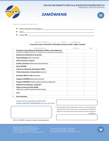 ZAMÓWIENIE Jednostka zamawiająca (dane do faktury) Nazwa jednostki zamawiającej _________________________________________________________ adres _____________________________________________________________________________ numer NIP _________________________________________________________________________ Zgodnie z ofertą nr ______/______ z dnia _____ zamawiamy: Przenośny zestaw inkasencki rozliczający dostawę wody i odbiór ścieków. NAZWA PRODUKTU o ILOŚĆ (szt.) CENA Komputer typu Motorola Workabout PRO4 z akumulatorem (Windows Embedded Handheld 6.5 Professional bez polskiej wersji językowej) o Spolszczona klawiatura ekranowa o Stacja dokująca (do transmisji) o Folia ochronna na ekran o Zasilacz sieciowy (ładowarka akumulatora) o Karta SD 8GB o Futerał na Motorola Workabout PRO4 o Torba inkasencka z kieszeniami (czarna) o Drukarka MEFA-12 Bt (komplet) o Program WODNIK (pierwsza licencja) o Program WODNIK (każda kolejna licencja programu) o Moduł komunikacyjny „Pośredni” o Papier termiczny firmy SEIKO (zalecany w okresie gwarancji drukarek) o Inne: Koszt dostawy Stawka VAT na wszystkie produkty 23%. RAZEM WARTOŚĆ ZAMÓWIENIA ( W tym VAT 23% ) * W przypadku zakupu kolejnego zestawu w danej jednostce proszę podać numer fabryczny już posiadanych PSIONÓW. Będzie to warunek otrzymania kolejnych licencji programu >WODNIK< DATA, PODPIS i pieczęć osoby zamawiającej. Usługi Informatyczne PROINFO Sp. z o.o. 95-035 Ozorków, ul. Kard. Wyszyńskiego 28 tel. 42 277-14-55; tel./fax. 42 718-36-37 e-mail: [email protected], www.proinfo.com.pl Certyfikat ISO 9001: 2009 Nr 1546/4/2011 NIP: 732-217-82-10 / Regon: 363933101 Bank PKO S.A. 38 1240 3057 1111 0000 3451 9376