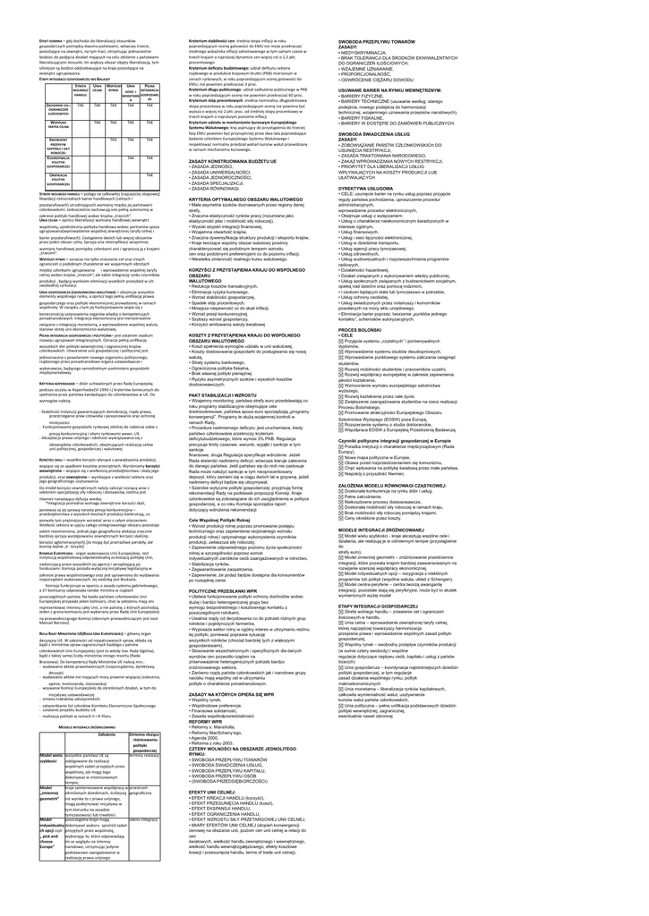 EFEKT DOMINA – gdy dochodzi do liberalizacji stosunków gospodarczych pomiędzy dwoma państwami, wówczas trzecie, pozostające na zewnątrz, na tym traci, otrzymując jednocześnie bodziec do podjęcia działań mających na celu zbliżenie z państwami liberalizującymi stosunki. Im większy obszar objęty liberalizacją, tym silniejsze są bodźce oddziaływujące na kraje pozostające na zewnątrz ugrupowania. ETAPY INTEGRACJI GOSPODARCZEJ WG BALASSY ZNOSZENIE CEŁ I STREFA WOLNEGO HANDLU UNIA CELNA WSPÓLNY TAK TAK TAK TAK TAK TAK TAK TAK TAK TAK TAK TAK TAK TAK RYNEK UNIA PEŁNA GOSP. I INTEGRACJA MONETARN GOSPODARC ZA A OGRANICZEŃ ILOŚCIOWYCH WSPÓLNA TARYFA CELNA SWOBODNY PRZEPŁYW KAPITAŁU I SIŁY ROBOCZEJ KOORDYNACJA POLITYKI GOSPODARCZEJ UNIFIKACJA TAK POLITYKI GOSPODARCZEJ STREFA WOLNEGO HANDLU – polega na całkowitej (najczęściej etapowej) likwidacji różnorodnych barier handlowych (celnych i pozataryfowych) utrudniających wymianę między jej państwami członkowskimi. Jednocześnie zachowują one pełną autonomię w zakresie polityki handlowej wobec krajów „trzecich”. UNIA CELNA – oprócz liberalizacji wymiany handlowej wewnątrz wspólnoty, ujednolicona polityka handlowa wobec partnerów spoza ugrupowania(wprowadzenie wspólnej zewnętrznej taryfy celnej i barier pozataryfowych). Zastąpienie dwóch lub więcej obszarów przez jeden obszar celny. Sprzyja ona intensyfikacji wzajemnej wymiany handlowej pomiędzy członkami unii i ogranicza ją z krajami „trzecimi”. WSPÓLNY RYNEK – oznacza nie tylko zniesienie ceł oraz innych ograniczeń o podobnym charakterze we wzajemnych obrotach między członkami ugrupowania i wprowadzenie wspólnej taryfy celnej wobec krajów „trzecich”, ale także integrację rynku czynników produkcji , będącą wynikiem eliminacji wszelkich przeszkód w ich swobodnej cyrkulacji. UNIA GOSPODARCZA (EKONOMICZNO‐WALUTOWA) – obejmuje wszystkie elementy wspólnego rynku, a oprócz tego pełną unifikację prawa gospodarczego oraz polityki ekonomicznej prowadzonej w ramach wspólnoty. W związku z tym jej funkcjonowanie wiąże się z koniecznością ustanowienia organów władzy o kompetencjach ponadnarodowych. Integracja ekonomiczna jest nierozerwalnie związana z integracją monetarną, a wprowadzenie wspólnej waluty stanowi istotę unii ekonomiczno‐walutowej. PEŁNA INTEGRACJA GOSPODARCZA I POLITYCZNA– jest ostatnim stadium rozwoju ugrupowań integracyjnych. Oznacza pełną unifikację wszystkich sfer polityki wewnętrznej i zagranicznej krajów członkowskich. Utworzenie unii gospodarczej i politycznej jest jednoznaczne z powstaniem nowego organizmu politycznego, rządzonego przez ponadnarodowe organa ustawodawcze i wykonawcze, będącego samodzielnym podmiotem gospodarki międzynarodowej. KRYTERIA KOPENHASKIE – zbiór uchwalonych przez Radę Europejską podczas szczytu w Kopenhadze(VI 1993 r.) kryteriów koniecznych do spełnienia przez państwa kandydujące do członkowstwa w UE. Do wymogów należą: ‐ Stabilność instytucji gwarantujących demokrację, rządy prawa, przestrzeganie praw człowieka i poszanowanie oraz ochronę mniejszości. ‐ Funkcjonowanie gospodarki rynkowej zdolnej do radzenia sobie z presją konkurencyjną i siłami rynkowymi wewn. UE. ‐ Akceptacja prawa unijnego i zdolność wywiązywania się z obowiązków członkowskich, obejmujących realizację celów unii politycznej, gospodarczej i walutowej KORZYŚCI SKALI – wszelkie korzyści płynące z powiększania produkcji, wiążące się ze spadkiem kosztów przeciętnych. Wyróżniamy korzyści wewnętrzne – wiążące się z wielkością przedsiębiorstwa i skalą jego produkcji, oraz zewnętrzne – wynikające z wielkości sektora oraz jego geograficznego usytuowania. Do źródeł korzyści zewnętrznych należy zaliczyć rosnącą wraz z sektorem specjalizację siły roboczej i dostawców, istotna jest również narastająca dyfuzja wiedzy. *Integracja pośrednio wzmaga zewnętrzne korzyści skali, ponieważ za jej sprawą narasta presja konkurencyjna – przedsiębiorstwa o wysokich kosztach produkcji bankrutują, co pozwala tym prężniejszym wzrastać wraz z całym otoczeniem. Wielkość sektora w ujęciu całego zintegrowanego obszaru pozostaje zatem niezmieniona, jednak jego geograficzna alokacja znacznie bardziej sprzyja występowaniu zewnętrznych korzyści skali(np. korzyści aglomeracyjnych).[to mogą być przeraźliwe pierdoły, ale brzmią ładnie ;d ‐ brzytki] KOMISJA EUROPEJSKA ‐ organ wykonawczy Unii Europejskiej. Jest instytucją wspólnotową odpowiedzialną za bieżącą politykę Unii, nadzorującą prace wszystkich jej agencji i zarządzającą jej funduszami. Komisja posiada wyłączną inicjatywę legislacyjną w zakresie prawa wspólnotowego oraz jest uprawniona do wydawania rozporządzeń wykonawczych. Jej siedzibą jest Bruksela. Komisja funkcjonuje w oparciu o zasady systemu gabinetowego, a 27 komisarzy odpowiada randze ministra w rządach poszczególnych państw. Na każde państwo członkowskie Unii Europejskiej przypada jeden komisarz, choć w założeniu mają oni reprezentować interesy całej Unii, a nie państw, z których pochodzą. Jeden z grona komisarzy jest wybierany przez Radę Unii Europejskiej na przewodniczącego Komisji (obecnym przewodniczącym jest José Manuel Barroso). ROLA RADY MINISTRÓW UE(RADA UNII EUROPEJSKIEJ) – główny organ decyzyjny UE. W zależności od rozpatrywanych spraw, składa się bądź z ministrów spraw zagranicznych każdego z państw członkowskich Unii Europejskiej (jest to wtedy tzw. Rada Ogólna), bądź z takiej samej liczby ministrów innego resortu (Rada Branżowa). Do kompetencji Rady Ministrów UE należą min.: ‐ wydawanie aktów prawotwórczych (rozporządzenia, dyrektywy, decyzje) ‐ wydawanie aktów nie mających mocy prawnie wiążącej (zalecenia, opinie, memoranda, stanowiska) ‐ wzywanie Komisji Europejskiej do określonych dz