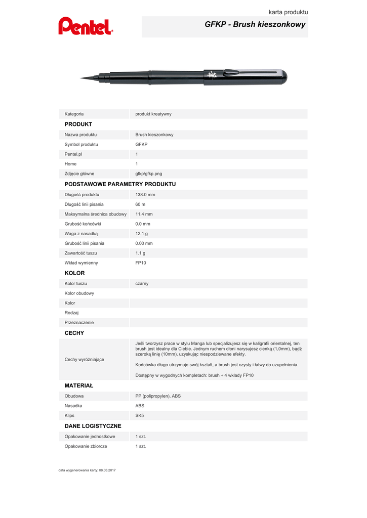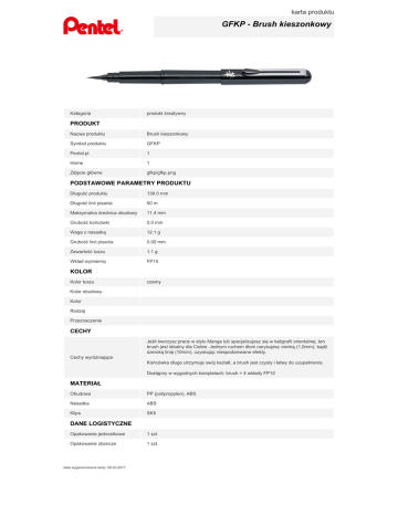 karta produktu GFKP - Brush kieszonkowy Kategoria produkt kreatywny PRODUKT Nazwa produktu Brush kieszonkowy Symbol produktu GFKP Pentel.pl 1 Home 1 Zdjęcie główne gfkp/gfkp.png PODSTAWOWE PARAMETRY PRODUKTU Długość produktu 138.0 mm Długość linii pisania 60 m Maksymalna średnica obudowy 11.4 mm Grubość końcówki 0.0 mm Waga z nasadką 12.1 g Grubość linii pisania 0.00 mm Zawartość tuszu 1.1 g Wkład wymienny FP10 KOLOR Kolor tuszu czarny Kolor obudowy Kolor Rodzaj Przeznaczenie CECHY Jeśli tworzysz prace w stylu Manga lub specjalizujesz się w kaligrafii orientalnej, ten brush jest idealny dla Ciebie. Jednym ruchem dłoni narysujesz cienką (1,0mm), bądź szeroką linię (10mm), uzyskując niespodziewane efekty. Cechy wyróżniające Końcówka długo utrzymuje swój kształt, a brush jest czysty i łatwy do uzupełnienia. Dostępny w wygodnych kompletach: brush + 4 wkłady FP10 MATERIAŁ Obudowa PP (polipropylen), ABS Nasadka ABS Klips SK5 DANE LOGISTYCZNE Opakowanie jednostkowe 1 szt. Opakowanie zbiorcze 1 szt. data wygenerowania karty: 08.03.2017
