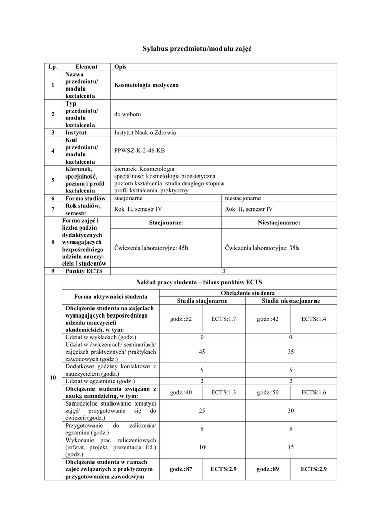Sylabus przedmiotu/modułu zajęć Lp. 1 2 3 4 5 6 7 8 9 Element Nazwa przedmiotu/ modułu kształcenia Typ przedmiotu/ modułu kształcenia Instytut Kod przedmiotu/ modułu kształcenia Kierunek, specjalność, poziom i profil kształcenia Forma studiów Rok studiów, semestr Forma zajęć i liczba godzin dydaktycznych wymagających bezpośredniego udziału nauczyciela i studentów Punkty ECTS Opis Kosmetologia medyczna do wyboru Instytut Nauk o Zdrowiu PPWSZ-K-2-46-KB kierunek: Kosmetologia specjalność: kosmetologia bioestetyczna poziom kształcenia: studia drugiego stopnia profil kształcenia: praktyczny stacjonarne niestacjonarne Rok II, semestr IV Rok II, semestr IV Stacjonarne: Niestacjonarne: Ćwiczenia laboratoryjne: 45h Ćwiczenia laboratoryjne: 35h 3 Nakład pracy studenta – bilans punktów ECTS Forma aktywności studenta 10 Obciążenie studenta na zajęciach wymagających bezpośredniego udziału nauczycieli akademickich, w tym: Udział w wykładach (godz.) Udział w ćwiczeniach/ seminariach/ zajęciach praktycznych/ praktykach zawodowych (godz.) Dodatkowe godziny kontaktowe z nauczycielem (godz.) Udział w egzaminie (godz.) Obciążenie studenta związane z nauką samodzielną, w tym: Samodzielne studiowanie tematyki zajęć/ przygotowanie się do ćwiczeń (godz.) Przygotowanie do zaliczenia/ egzaminu (godz.) Wykonanie prac zaliczeniowych (referat, projekt, prezentacja itd.) (godz.) Obciążenie studenta w ramach zajęć związanych z praktycznym przygotowaniem zawodowym Obciążenie studenta Studia stacjonarne Studia niestacjonarne godz.:52 ECTS:1.7 ECTS:1.4 0 0 45 35 5 5 2 2 godz.:40 godz.:87 godz.:42 ECTS:1.3 godz.:50 ECTS:1.6 25 30 5 5 10 15 ECTS:2.9 godz.:89 ECTS:2.9 11 12 Suma Nauczyciel akademicki odpowiedzialny za przedmiot/ moduł (egzaminujący) Nauczyciele akademiccy prowadzący przedmiot/ moduł godz.:92 ECTS:3 godz.:92 ECTS:3 Dr n.med. Izabela Załęska Dr n. med. Izabela Załęska / lek. med. Łukasz Ordynowski 13 Wymagania (kompetencje) wstępne Znajomość anatomii twarzy, chorób dermatologicznych ( ich semiotyki i przyczyn) oraz chemii surowców wykorzystywanych w medycynie estetycznej. Umiejętność zebrania wywiadu kosmetologicznego. 14 Założenia i cele przedmiotu Zaznajomienie studentów ze wskazaniami, przeciwwskazaniami i powikłaniami po nowoczesnych zabiegach inwazyjnych z zakresu kosmetologii oraz medycyny estetycznej. Opis efektów kształcenia w zakresie: W1 W2 15 Efekty kształcenia 16 Treści kształcenia WIEDZY Student posiada wiedzę umożliwiającą różnicowanie defektów kosmetycznych od chorób skóry oraz wiedzę umożliwiającą wykonanie dopuszczalnych i zalecanych zabiegów kosmetycznych w niektórych jednostkach chorobowych skóry. Student objaśnia podstawowe rodzaje zabiegów medycyny estetycznej, potrafi zaproponować zabiegi z zakresu medycyny estetycznej oraz wymienia podstawowe wypełniacze estetyczne. Odniesienie do kierunkowych efektów kształcenia Odniesienie do efektów kształcenia dla obszaru K2_W01 M2_W02 M2_W03 K2_W07 M2_W07 M2_W09 UMIEJĘTNOŚCI Student nakreśla podstawowe techniki stosowane w medycynie estetycznej, ocenia M2_U02 przydatność zabiegów medycyny estetycznej U1 M2_U05 oraz potrafi interpretować mechanizmy tych K2_U26 M2_U09 zabiegów. M2_U10 Student potrafi współpracować z lekarzem w zakresie zleconych zabiegów. KOMPETENCJI SPOŁECZNYCH Student ma świadomość przydatności K1 posiadanej wiedzy dotyczącej medycyny K2_K01 M2_K02 estetycznej. Student ma świadomość dalszego kształcenia K2 K2_K07 M2_K01 i korzystania z pomocy innych specjalistów. Student zna zasady komunikacji K3 K2_K08 M2_K08 interpersonalnej z klientem. 1 .Wywiad kosmetologiczny i badanie dermatologiczne skóry poddawanej zabiegowi w gabinecie medycyny estetycznej. Komunikacja z pacjentem, protokoły zabiegowe 2. Peelingi medyczne powierzchowne i średniogłębokie - omówienie wskazań, przeciwwskazań i możliwych powikłań związanych z tymi zabiegami, odpowiedni dobór substancji czynnej w peelingu do problemu pacjenta. Omówienie wyglądu skóry po poszczególnych zabiegach. 3. Mezoterapia igłowa, lipoliza iniekcyjna oraz rollery ‐ wskazania, przeciwwskazania i możliwe powikłania. Dobór substancji stosowanych w mezoterapii do potrzeb pacjenta. 4. Toksyna botulinowa i kwas hialuronowy - wskazania, przeciwwskazania i możliwe powikłania, rodzaje toksyn botulinowych . 5. Wypełniacze estetyczne na bazie kwasu hialuronowego usieciowanego postępowanie po zabiegu, omówienie możliwych efektów, czynniki wpływające na skrócenie działania poszczególnych preparatów. 6. Osocze bogato płytkowe. 7. Nici PDO – zastosowanie w korektach i technikach liftingujacych. 8. Modelowanie i powiększanie ust. 9. Umiejętność przekazania postępowania pielęgnacyjnego po wykonanym zabiegu oraz zaproponowanie pacjentowi odmiennego sposobu terapii lub poprawy urody niż wybrany przez niego, praca z aparatem fotograficznym, lustrem itp. 17 Stosowane metody dydaktyczne Metody weryfikacji efektów 18 kształcenia (w odniesieniu do poszczególnych efektów) Kryteria oceny osiągniętych 19 efektów kształcenia Forma i warunki zaliczenia przedmiotu/ modułu, w tym 20 zasady dopuszczenia do egzaminu / zaliczenia z oceną 21 Wykaz literatury podstawowej 22 Wykaz literatury uzupełniającej Ćwiczenia, zajęcia praktyczne, dyskusja . Efekt kształcenia W1 W2 U1 K1 K2 K3 Sposób weryfikacji efektów kształcenia: egzamin pisemny egzamin pisemny zaliczenie ustne, obserwacja w czasie zajęć dyskusje, obserwacja w czasie zajęć dyskusje, obserwacja w czasie zajęć dyskusje, obserwacja w czasie zajęć Kryteria oceniania: test wielokrotnego wyboru (pytania zamknięte i otwarte) Uzyskane punkty przelicza się na oceny wg. następującej skali: 51-60% dst; 61-70% +dst; 71-80% db; 81-90% +db; 91-100% bdb Forma zakończenia: egzamin pisemny. 1. Obecność na ćwiczeniach, zaliczenie zadań praktycznych. 1. Adamski Z., Kaszuba A.,