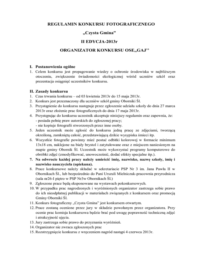 REGULAMIN KONKURSU FOTOGRAFICZNEGO „Czysta Gmina” II EDYCJA-2013r ORGANIZATOR KONKURSU OSE,,GAJ’’ I. Postanowienia ogólne 1. Celem konkursu jest propagowanie wiedzy o ochronie środowiska w najbliższym otoczeniu, zwiększenie świadomości ekologicznej wśród uczniów szkół oraz prezentacja osiągnięć uczestników konkursu. II. Zasady konkursu 1. Czas trwania konkursu – od 03 kwietnia 2013r do 15 maja 2013r. 2. Konkurs jest przeznaczony dla uczniów szkół gminy Oborniki Śl. 3. Przystąpienie do konkursu następuje przez zgłoszenie udziału szkoły do dnia 27 marca 2013r oraz złożenie prac fotograficznych do dnia 17 maja 2013r. 4. Przystępując do konkursu uczestnik akceptuje niniejszy regulamin oraz zapewnia, że: - posiada pełnię praw autorskich do zgłoszonej pracy; - nie kopiuje fotografii stworzonych przez inne osoby. 5. Jeden uczestnik może zgłosić do konkursu jedną pracę ze zdjęciami, tworzącą określoną, zamkniętą całość, przedstawiającą dzikie wysypiska śmieci itp. 6. Wszystkie fotografie powinny mieć postać odbitki kolorowej w formacie minimum 13x18 cm, naklejone na biały brystol i zatytułowane oraz z miejscem naniesionym na mapie gminy Obornik Śl. Uczestnik może wykorzystać programy komputerowe do obróbki zdjęć (zmodyfikować, unowocześnić, dodać efekty specjalne itp.). 7. Na odwrocie każdej pracy należy umieścić imię, nazwisko, nazwę szkoły, imię i nazwisko nauczyciela (opiekuna). 8. Prace konkursowe należy składać w sekretariacie PSP Nr 3 im. Jana Pawła II w Obornikach Śl., lub bezpośrednio do Pani Urszuli Mielniczuk-pracownia przyrodnicza (sala nr26-I piętro w PSP Nr3w Obornikach Śl.) 9. Zgłoszone prace będą eksponowane na wystawach pokonkursowych. 10. W przypadku prac nagrodzonych i wyróżnionych organizator zastrzega sobie prawo do ich nieodpłatnej publikacji w materiałach związanych z konkursem oraz promocją Gminy Oborniki Śl. 11. Konkurs fotograficzny „Czysta Gmina” jest konkursem otwartym. 12. Prace zostaną ocenione przez jury w składzie powołanym przez organizatora. Przy ocenie prac komisja konkursowa będzie brać pod uwagę poprawność techniczną zdjęć i atrakcyjność ujęcia. 13. Jury zastrzega sobie prawo do przyznania wyróżnień. 14. Organizator nie zwraca zgłoszonych prac 15. Rozstrzygnięcie konkursu z wręczeniem nagród nastąpi 4 czerwca 2013r. III. Nagrody 1. Fundatorem nagród jest Gmina Oborniki Śl., Nadleśnictwo, Koło Łowieckie „Krzyżówka” i inni sponsorzy. IV. Postanowienia końcowe 1. Udział w konkursie jest równoznaczny z wyrażeniem zgody na wykorzystywanie danych osobowych uczestników. 2. Wszystkie informacje nt. konkursu udziela Urszula Mielniczuk nr tel. 71 310 14 81 PSP Nr 3 im. Jana Pawła II w Obornikach Śl. 3. Regulamin umieszczony jest na szkolnej stronie: www.sp3obornikisl.edupage.org 4. Komisję tworzy Obornickie Stowarzyszenie Ekologiczne ,,GAJ’’ W imieniu OSE ,,GAJ’’- Prezes Urszula Mielniczuk