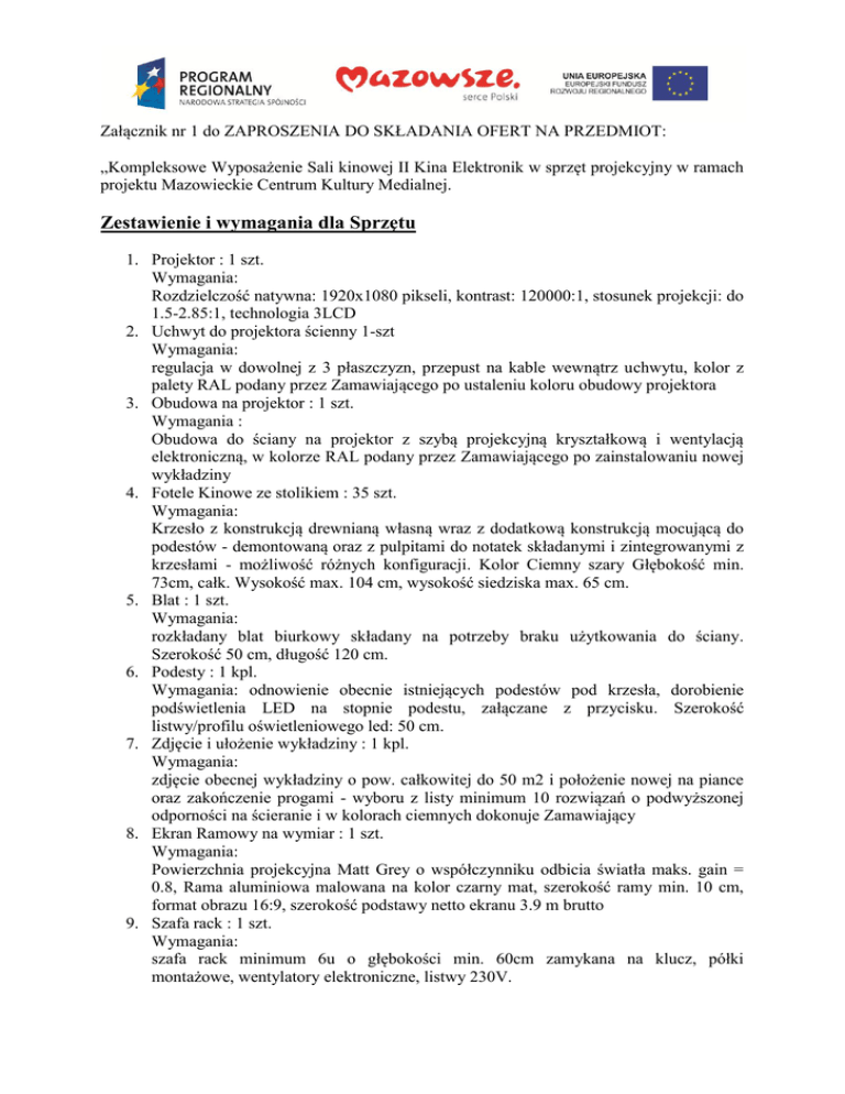 Załącznik nr 1 do ZAPROSZENIA DO SKŁADANIA OFERT NA PRZEDMIOT: „Kompleksowe Wyposażenie Sali kinowej II Kina Elektronik w sprzęt projekcyjny w ramach projektu Mazowieckie Centrum Kultury Medialnej. Zestawienie i wymagania dla Sprzętu 1. Projektor : 1 szt. Wymagania: Rozdzielczość natywna: 1920x1080 pikseli, kontrast: 120000:1, stosunek projekcji: do 1.5-2.85:1, technologia 3LCD 2. Uchwyt do projektora ścienny 1-szt Wymagania: regulacja w dowolnej z 3 płaszczyzn, przepust na kable wewnątrz uchwytu, kolor z palety RAL podany przez Zamawiającego po ustaleniu koloru obudowy projektora 3. Obudowa na projektor : 1 szt. Wymagania : Obudowa do ściany na projektor z szybą projekcyjną kryształkową i wentylacją elektroniczną, w kolorze RAL podany przez Zamawiającego po zainstalowaniu nowej wykładziny 4. Fotele Kinowe ze stolikiem : 35 szt. Wymagania: Krzesło z konstrukcją drewnianą własną wraz z dodatkową konstrukcją mocującą do podestów - demontowaną oraz z pulpitami do notatek składanymi i zintegrowanymi z krzesłami - możliwość różnych konfiguracji. Kolor Ciemny szary Głębokość min. 73cm, całk. Wysokość max. 104 cm, wysokość siedziska max. 65 cm. 5. Blat : 1 szt. Wymagania: rozkładany blat biurkowy składany na potrzeby braku użytkowania do ściany. Szerokość 50 cm, długość 120 cm. 6. Podesty : 1 kpl. Wymagania: odnowienie obecnie istniejących podestów pod krzesła, dorobienie podświetlenia LED na stopnie podestu, załączane z przycisku. Szerokość listwy/profilu oświetleniowego led: 50 cm. 7. Zdjęcie i ułożenie wykładziny : 1 kpl. Wymagania: zdjęcie obecnej wykładziny o pow. całkowitej do 50 m2 i położenie nowej na piance oraz zakończenie progami - wyboru z listy minimum 10 rozwiązań o podwyższonej odporności na ścieranie i w kolorach ciemnych dokonuje Zamawiający 8. Ekran Ramowy na wymiar : 1 szt. Wymagania: Powierzchnia projekcyjna Matt Grey o współczynniku odbicia światła maks. gain = 0.8, Rama aluminiowa malowana na kolor czarny mat, szerokość ramy min. 10 cm, format obrazu 16:9, szerokość podstawy netto ekranu 3.9 m brutto 9. Szafa rack : 1 szt. Wymagania: szafa rack minimum 6u o głębokości min. 60cm zamykana na klucz, półki montażowe, wentylatory elektroniczne, listwy 230V. 10. Wentylacja w sali : 1 kpl. Wymagania: komplet wentylacji nadmuchowej i wydmuchowej zamontowany w ścianie tylnej Sali kinowej 11. Uchwyty na głośniki : 5 szt. Wymagania: komplet 5 szt. uchwytów regulowanych w 3 płaszczyznach do głośników posiadanych przez Zamawiającego 12. Okno : 1 szt. Wymagania: Dostawa i montaż okna dla operatora na tylnej ścianie sali dla podglądu nie mniejsze niż 30cm x 30cm 13. Baner reklamowy : 1 kpl. Wymagania: Baner reklamowy kina 4x1,5 m + Nadruk full kolor + 2 Reflektory na uchwytach + Konstrukcja stalowa pod baner + Okablowanie 230V + podpięcie pod czujnik zmierzchu wraz z samym czujnikiem 14. Podświetlane LED zamykane gabloty na plakaty zewnętrzne : 1 kpl. Wymagania: 6 podświetlanych gablot zamykanych na klucz i podłączonych pod istniejący czujnik zmierzchu oraz przeznaczonych do instalacji sufitowej. Pojemność w pionie minimum format B1. 15. Okablowanie audio oraz Video niezbędne do uruchomienia i podłączenia sprzętu, instalacja wszystkich oferowanych urządzeń zawierające wszelkie niezbędne materiały i akcesoria budowlane i techniczne do uruchomienia systemu i przeprowadzenia remontu sali, kalibracja urządzeń i pomiary akustyczne oraz obrazu UWAGA: 1. W każdym przypadku kiedy przedmiot zamówienia jest opisany w przez wskazanie znaków towarowych, patentów lub pochodzenia Zamawiający dopuszcza rozwiązania równoważne opisywanym. 2. W każdym przypadku kiedy przedmiot zamówienia jest opisany w za pomocą norm, aprobat, specyfikacji technicznych lub innych systemów odniesienia Zamawiający dopuszcza rozwiązania równoważne opisywanym. 3. Wykonawca, który powołuje się na rozwiązania równoważne opisywanym przez Zamawiającego, jest obowiązany wykazać w ofercie, że oferowane przez niego dostawy spełniają wymagania określone przez Zamawiającego. W takim przypadku Wykonawcza przedstawi w dodatkowym załączniku do oferty wykaz rozwiązań równoważnych wraz z dokumentami potwierdzającymi spełnienie wymagań dla tych rozwiązań.