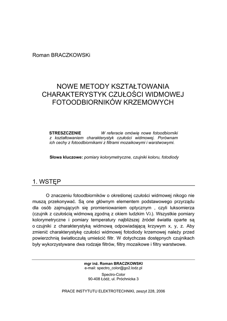 Roman BRACZKOWSKi NOWE METODY KSZTAŁTOWANIA CHARAKTERYSTYK CZUŁOŚCI WIDMOWEJ FOTOODBIORNIKÓW KRZEMOWYCH STRESZCZENIE W referacie omówię nowe fotoodbiorniki z kształtowaniem charakterystyk czułości widmowej. Porównam ich cechy z fotoodbiornikami z filtrami mozaikowymi i warstwowymi. Słowa kluczowe: pomiary kolorymetryczne, czujniki koloru, fotodiody 1. WSTĘP O znaczeniu fotoodbiorników o określonej czułości widmowej nikogo nie muszą przekonywać. Są one głównym elementem podstawowego przyrządu dla osób zajmujących się promieniowaniem optycznym , czyli luksomierza (czujnik z czułością widmową zgodną z okiem ludzkim Vλ). Wszystkie pomiary kolorymetryczne i pomiary temperatury najbliższej źródeł światła oparte są o czujniki z charakterystyką widmową odpowiadającą krzywym x, y, z. Aby zmienić charakterystykę czułości widmowej fotodiody krzemowej należy przed powierzchnią światłoczułą umieścić filtr. W dotychczas dostępnych czujnikach były wykorzystywane dwa rodzaje filtrów, filtry mozaikowe i filtry warstwowe. mgr inż. Roman BRACZKOWSKI e-mail: [email protected] Spectro-Color 90-408 Łódź, ul. Próchnicka 3 PRACE INSTYTUTU ELEKTROTECHNIKI, zeszyt 228, 2006 108 R. Braczkowski Filtr mozaikowy składał się z wielu filtrów szklanych wklejonych o obok siebie lub jeden nad drugim. Taki filtr wymagał dużych powierzchni światłoczułych, a każdy fragment powierzchni światłoczułej jest naświetlany innym promieniowaniem. W przypadku pomiarów kolorymetrycznych powierzchnia czujników potraja się. Filtr warstwowy również składa się z wielu filtrów szklanych, lecz są one naklejone warstwowo jak tort. Pozwala to na stosowanie elementów o mniejszych powierzchniach światłoczułych. Jednak i w tym przypadku przy pomiarach kolorymetrycznych istnieje problem równomiernego oświetlenia trzech odbiorników mierzonym promieniowaniem. 2. NOWY FOTOODBIORNIK Rys. 1. Widok czujnika koloru xyz Wymienionych wcześniej wad nie posiada prezentowany czujnik koloru. Jest to 57 fotodiod krzemowych typu PIN w jednej obudowie. Fotodiody rozmieszczone są w matrycy heksagonalnej. Wypadkowa charakterystyka dla poszczególnych składowych tworzona jest prze 19 fotodiod z filtrami interferencyjnymi. Filtry są napylane bezpośrednio na krzem. Okno czujnika wynosi zaledwie 2 mm. Rys. 2. Wykres czułości widmowej czujnika koloru dla szerokości połówkowej 27 nm 109 Nowe metody kształtowania charakterystyk czułości widmowej fotoodbiorników ... Rys. 3. Wykres czułości widmowej czujnika koloru dla szerokości połówkowej 2 nm TABELA 1 Podstawowe parametry Opis Rozmiar okna pomiarowego Obszar światło czuły dla poszczególnych kolorów Maksymalna czułość dla poszczególnych kolorów Tolerancja krzywej filtra Symbol Parametry min. max. 2,0 0,76 D A λZ = 445 nm Smax typ. λY = 555 nm λXK = 445 nm λXI = 600 nm 0,21 0,30 0,11 0,31 0,23 0,33 0,12 0,35 Δλ (λ) mm mm2 0,25 0,36 0,13 0,38 A/W <1%*λ nm Napięcie wsteczne VR Prąd ciemny IR VR = 2,5V 10 pA Pojemność C VR = 2V 70 pF Czas narastania i zaniku Współczynnik szumów 0 Jednost. 0 Kąt wejściowy ϕ Zakres temperaturowy pracy Top fR = 100 Hz <10 Δλ<1%∗λ -20 V μs 2 tr. t, NEP 2,5 -13 W/√Hz 10 grad +85 °C Producent czujnika zadbał również o elektroniczne podzespoły współpracujące z czujnikiem. Niestety okazały się one nie najwyższej jakości. Jedynie wzmacniacz wstępny można uznać za przydatny. Natomiast 12−bitowy przetwornik jak i oprogramowanie, regularnie zawieszające się, powędrowało 110 R. Braczkowski do kosza. Na zdjęciu przedstawiamy kolorymetr wykonany przez naszą firmę. Posiada on przetwornik 16−bitowy, oprogramowanie z możliwością korekcji i złącze USB do współpracy z komputerem. Zasilanie bateryjne doładowywane z sieci lub przez złącze USB. Rys. 4. Schemat układu wejściowego Rys. 5. Kolorymetr z nowym czujnikiem koloru Nowe metody kształtowania charakterystyk czułości widmowej fotoodbiorników ... 111 W opracowaniu są optyczne układy wejściowe i oświetlacz D65 na diodach LED. Przewidujemy wyposażenie kolorymetru w kulę całkującą do pomiarów: diod luminescencyjnych, pomiarów barwy światła, pomiarów odbiciowych d/0 i 45/0. 3. PODSUMOWANIE Mam nadzieję, iż przedstawiony tu zintegrowany czujnik koloru jest pierwszym lecz nie ostatnim tego typu czujnikiem. Może w najbliższej przyszłości pojawią się czujniki UV z różnymi krzywymi czułości lub inne czujniki spektralne. Pozwoli to na znaczną miniaturyzację mierników promieniowania i obniżenie kosztów wytwarzania. LITERATURA 1. Katalog firmowy JEN COLOR Rękopis dostarczono, dnia 05.09.2006 r. NEW METHODS OF SHAPING SPECTRAL SENSITIVITY IN SILICON PHOTORECEIVERS R. BRACZKOWSKI ABSTRACT In this report I will talk about new photoreceirers with spectral sensitivity shaping. I will compare their features with photoreceireivers with laminated and mosaic filters.