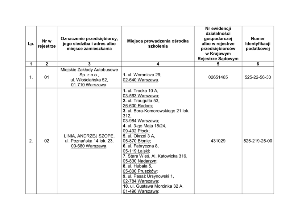 Lp. Nr w rejestrze 1 2 1. 01 2. 02 Oznaczenie przedsiębiorcy, jego siedziba i adres albo miejsce zamieszkania 3 Miejskie Zakłady Autobusowe Sp. z o.o., ul. Włościańska 52, 01-710 Warszawa. LINIA, ANDRZEJ SZOPE, ul. Poznańska 14 lok. 23, 00-680 Warszawa. Miejsca prowadzenia ośrodka szkolenia 4 1. ul. Woronicza 29, 02-640 Warszawa. 1. ul. Trocka 10 A, 03-563 Warszawa; 2. ul. Traugutta 53, 26-600 Radom; 3. ul. Bora-Komorowskiego 21 lok. 312, 03-984 Warszawa; 4. ul. 3-go Maja 18/24, 09-402 Płock; 5. ul. Okrzei 3 A, 05-870 Błonie; 6. ul. Fabryczna 8, 05-119 Łajski; 7. Stara Wieś, Al. Katowicka 316, 05-830 Nadarzyn; 8. ul. Hubala 5, 05-800 Pruszków; 9. ul. Pasaż Ursynowski 1, 02-784 Warszawa; 10. ul. Gustawa Morcinka 32 A, 01-496 Warszawa; Nr ewidencji działalności gospodarczej albo w rejestrze przedsiębiorców w Krajowym Rejestrze Sądowym 5 Numer Identyfikacji podatkowej 6 02651465 525-22-56-30 431029 526-219-25-00 Lp. Nr w rejestrze Oznaczenie przedsiębiorcy, jego siedziba i adres albo miejsce zamieszkania 1 2 3 Miejsca prowadzenia ośrodka szkolenia 4 11. ul. Topolowa 4 lok. 10, 05-300 Mińsk Mazowiecki; 12. ul. Narutowicza 5, 96-500 Sochaczew; 13. ul. Przemysłowa 25, 27-300 Lipsko; 14. ul. Narutowicza 1, 96-500 Sochaczew; 15. ul. Mireckiego 54, 96-300 Żyrardów; 16. ul. Targowa 7, 07-100 Węgrów; 17. ul. Al. Komisji Edukacji Narodowej 36 lok. 109, 02-722 Warszawa.; 18. ul. Kościelna 22, 26-800 Białobrzegi; 19. ul. Mleczarska 5, 06-400 Ciechanów; 20. ul. Skłodowskiej-Curie 24, 08-300 Sokołów Podlaski; 21. Al. Krakowska 80, 05-090 Raszyn; 22. ul. Kościuszki 13, 96-300 Żyrardów; Nr ewidencji działalności gospodarczej albo w rejestrze przedsiębiorców w Krajowym Rejestrze Sądowym 5 Numer Identyfikacji podatkowej 6 Lp. Nr w rejestrze Oznaczenie przedsiębiorcy, jego siedziba i adres albo miejsce zamieszkania 1 2 3 03 Michalczewski sp. z o.o. ul. Ks. Łukasika 5, 26-600 Radom. 4. 04 Ośrodek Szkolenia „TEST”, Zbigniew Krzysztof Wyszyński, ul. Górczewska 253 D, lok. 6, 01-459 Warszawa. 5. 05 BUCH-CAR Rafał Buchcar, ul. Sochaczewska 38, 05-870 Błonie. 3. Miejsca prowadzenia ośrodka szkolenia 4 23. ul. Odlewnicza 7, 03-231 Warszawa. 1. ul. Płochocińska 33, 03-044 Warszawa; 2. ul. Ks. Łukasika 5, 26-600 Radom. Wykreślenie na wniosek w dniu 2 lutego 2011 r. 1. ul. Sochaczewska 38, 05-870 Błonie. Nr ewidencji działalności gospodarczej albo w rejestrze przedsiębiorców w Krajowym Rejestrze Sądowym 5 Numer Identyfikacji podatkowej 6 001535 796-006-70-30 5674 762-107-57-42 1284 529-104-30-56 Lp. Nr w rejestrze 1 2 6. 06 7. 07 Oznaczenie przedsiębiorcy, jego siedziba i adres albo miejsce zamieszkania 3 Europejskie Centrum Szkolenia Kierowców s.c. Rafał Jańczuk, Michał Krasnodębski, Marek Tomaszewski, Elżbieta Piętka, ul. Jutrzenki 45, 02-230 Warszawa. Polska Izba Gospodarcza Transportu Samochodowego i Spedycji, Al. Jerozolimskie 144, 02-305 Warszawa. Miejsca prowadzenia ośrodka szkolenia 4 Wykreślenie na wniosek w dniu 1 lutego 2011 r. 1. ul. Żwirki i Wigóry 6, 05-825 Grodzisk Mazowiecki; 2. ul. Zacisze 18, 08-300 Sokołów Podlaski; 3. ul. 18 Stycznia 36, 09-500 Gostynin; 4. ul. Laskowa 26, 05-600 Grójec; 5. ul. Kolejowa 22, 08-200 Łosice; 6. Przytycka 4, 26-600 Radom; 7. ul. Wjazdowa 4, 26-600 Radom; 8. Rodziny Ziętalów 5, 26-600 Radom; 9. ul, Chełmońskiego 33, Nr ewidencji działalności gospodarczej albo w rejestrze przedsiębiorców w Krajowym Rejestrze Sądowym 5 Numer Identyfikacji podatkowej 6 04551465 113-264-81-93 0000140203 522-10-15-876 Lp. Nr w rejestrze Oznaczenie przedsiębiorcy, jego siedziba i adres albo miejsce zamieszkania 1 2 3 08 CENTRUM DORADZTWA I SZKOLEŃ ZAWODOWYCH CENTRUM BADAŃ LEKARSKICH I PSYCHOLOGICZNYCH HANDEL-USŁUGI „KUBA”, IGIELSKI ALEKSANDER, ul. Bohaterów Warszawy 18/1, 70-372 Szczecin. 8. Miejsca prowadzenia ośrodka szkolenia 4 05-825 Grodzisk Mazowiecki; 10. ul. Zawadzkiego 1, 07-412 Ostrołęka; 11. ul. Wołomińska 271, 05-250 Janików Nowy; 12. Budowlana 3, 08-110 Siedlce. Wykreślenie na wniosek w dniu 28 stycznia 2014 r. Nr ewidencji działalności gospodarczej albo w rejestrze przedsiębiorców w Krajowym Rejestrze Sądowym 5 2709/2003 Numer Identyfikacji podatkowej 6 852-191-48-76 Lp. Nr w rejestrze Oznaczenie przedsiębiorcy, jego siedziba i adres albo miejsce zamieszkania Miejsca prowadzenia ośrodka szkolenia 1 2 3 4 9. 10 09 10 Wiesław Słojewski Ośrodek Szkolenia Kierowców Wykreślenie na wniosek „WIDOK”, w dniu 2 maja 2016 r. ul. Grzybowa 1 A, 96-100 Skierniewice. Szkoła Nauki Jazdy Andrzej Gryglas, ul. Bohaterów Modlina 48, 05-100 Nowy Dwór Mazowiecki. 1. ul. Chemików 1 A, 05-100 Nowy Dwór Mazowiecki. Nr ewidencji działalności gospodarczej albo w rejestrze przedsiębiorców w Krajowym Rejestrze Sądowym 5 Numer Identyfikacji podatkowej 6 198 836-00-00-383 013101596 531-119-51-84 Lp. Nr w rejestrze Oznaczenie przedsiębiorcy, jego siedziba i adres albo miejsce zamieszkania Miejsca prowadzenia ośrodka szkolenia 1 2 3 4 11. 12. 13. 1. ul. Obrońców Lwowa 1, 05-119 Legionowo; 2. ul. Modlińska 6, 03-216 Warszawa; 3. ul. Warszawska 24, 05-820 Piastów; 4. ul. E. Ciołka 12/220, 01-402 Warszawa; 5. ul. Piłsudzkiego 42/1, 05-600 Grójec; 6. Pl. Poświętne 11, 05-640 Mogielnica. 11 Paweł Żuchowski ABC – SKOLENIA, ul. Krasińskiego 80, 05-080 Izabelin. 12 Centrum Szkolenia Kierowców Władysław Osiński, ul. Kościuszki 26, 09-402 Płock. 1. ul. Kościuszki 26, 09-402 Płock; 2. ul. Królewiecka 25 lok. 11, 09-402 Płock. 13 Prywatna Szkoła Nauki Jazdy Roman Garstka, ul. Stodólna 14, 09-500 Gostynin. 1. ul. Stodólna 14, 09-500 Gostynin. Nr ewidencji działalności gospodarczej albo w rejestrze przedsiębiorców w Krajowym Rejestrze Sądowym 5 2066 Numer Identyfikacji podatkowej 6 118-046-64-55 WOS.V.6411/05881)90 774-120-28-06 00001306 971-001-79-25 Lp. Nr w rejestrze 1 2 14. 14 15. 16. 17. Oznaczenie przedsiębiorcy, jego siedziba i adres albo miejsce zamieszkan