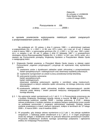 Załącznik do uchwały nr LIX/680/06 Rady Miasta Opola z dnia 23 lutego 2006 r. Porozumienie nr /06 z dnia......................................2006 r. w sprawie powierzenia wykonywania z przeprowadzeniem poboru w 2006 r. niektórych zadań związanych Na podstawie art. 33 ustawy z dnia 5 czerwca 1998 r. o administracji rządowej w województwie (Dz. U. z 2001 r. nr 80, poz. 872 z późn. zm.) oraz art. 8 ust. 2 ustawy z dnia 8 marca 1990 r. o samorządzie gminnym (Dz. U. z 2001 r. nr 142, poz. 1591 z późn. zm.), w związku z art. 35 ust. 2 ustawy z dnia 21 listopada 1967 r. o powszechnym obowiązku obrony Rzeczypospolitej Polskiej (Dz. U. z 2004 r. nr 241, poz. 2416 z późn. zm.) zawiera się Porozumienie pomiędzy Wojewodą Opolskim a Prezydentem Miasta Opola o następującej treści: § 1. Wojewoda Opolski powierza, a Prezydent Miasta Opola (zwany w dalszej części Porozumienia „organem przyjmującym”) przyjmuje do wykonania niżej wymienione zadania: 1) zawieranie umów z dyrektorami zakładów opieki zdrowotnej o przeprowadzanie badań specjalistycznych i radiologicznych oraz obserwacji szpitalnej poborowych, 2) wypłacanie wynagrodzeń za udział w pracy powiatowej komisji lekarskiej, 3) pokrywanie kosztów wykonania: badań specjalistycznych, badań radiologicznych, obserwacji szpitalnej poborowych, zgodnie z cennikiem usług medycznych, obowiązującym w danym zakładzie opieki zdrowotnej, do którego poborowy został skierowany, 4) przekazanie zakładom opieki zdrowotnej środków rekompensujących zarobki utracone przez lekarzy i średni personel medyczny obsługujących powiatową komisję lekarską. § 2. 1. Na wykonanie zadań wymienionych w § 1 pkt 2, 3 i 4 Porozumienia przeznacza się z budżetu Wojewody Opolskiego dotację celową w kwocie 19 500 zł (dział 750 – administracja publiczna, rozdział 75045 – komisje poborowe, § 2120 – dotacja celowa przekazana z budżetu państwa na zadania bieżące realizowane przez powiat na podstawie porozumień z organami administracji rządowej). Dotacja celowa zostanie przekazana w trzech równych transzach, kolejno w terminach do: 27 lutego 2006 r., 6 marca 2006 r. oraz 6 kwietnia 2006 r. 2. W przypadku, gdy dotacja celowa wymieniona w § 2 pkt 1, nie pokryje wydatków związanych z realizacją zadań określonych w § 1 pkt 2, 3 i 4 organ przyjmujący może się ubiegać o dodatkowe środki na pokrycie faktycznie poniesionych kosztów. Przyznanie dodatkowych środków wymaga uprzedniego podpisania i ogłoszenia aneksu do niniejszego Porozumienia. § 3.1. Prezydent Miasta Opola zobowiązuje się do składania dyrektorowi Wydziału Spraw Obywatelskich i Migracji Opolskiego Urzędu Wojewódzkiego miesięcznych sprawozdań z wykorzystania dotacji celowej, przekazanej z budżetu Wojewody Opolskiego na zadania określone w § 1 pkt 2, 3 i 4. 2. Rozliczenie całości dotacji z § 2120 otrzymanej na pobór należy przedłożyć do Wydziału Spraw Obywatelskich i Migracji w nieprzekraczalnym terminie do dnia 30 czerwca 2006 r. 3. Dotacje udzielone z budżetu państwa: 1) wykorzystane niezgodnie z przeznaczeniem, 2) pobrane nienależnie lub w nadmiernej wysokości - podlegają zwrotowi do budżetu państwa wraz z odsetkami w wysokości określonej jak dla zaległości podatkowych, w terminie do dnia 28 lutego roku następującego po roku, w którym udzielono dotacji. Do zwrotu dotacji, o których mowa wyżej, stosuje się przepisy art. 145 i art. 146 ustawy z dnia 30 czerwca 2005 r. o finansach publicznych (Dz. U. nr 249, poz. 2104). § 4.1. W imieniu Wojewody Opolskiego nadzór nad realizacją zadań objętych Porozumieniem sprawuje dyrektor Wydziału Spraw Obywatelskich i Migracji Opolskiego Urzędu Wojewódzkiego, który w szczególności: organizuje i przeprowadza kontrole, przygotowuje zalecenia pokontrolne, wydaje wiążące wytyczne w zakresie realizacji powierzonych zadań. 2. Prezydent Miasta Opola zobowiązuje się do zapewnienia warunków umożliwiających przeprowadzanie kontroli realizacji zadań objętych Porozumieniem, jak też do przestrzegania otrzymanych wytycznych i zaleceń pokontrolnych. § 5. Prezydent Miasta Opola odpowiada za – zgodną z obowiązującym prawem – realizację wymienionych w Porozumieniu zadań. § 6.1. Zadania ujęte w § 1 pkt 2, 3 i 4 będą realizowane w czasie obowiązywania poboru, tj. od 27 lutego do 24 kwietnia 2006 r. 2. Porozumienie wygasa po rozliczeniu całości dotacji z § 2120, jednak nie później niż do 30 września 2006 r. 3. Wcześniejsze wypowiedzenie Porozumienia, z zachowaniem miesięcznego terminu, wymaga formy pisemnej i może być dokonane na wniosek organu przyjmującego lub przez Wojewodę Opolskiego. § 7. Porozumienie sporządzono w trzech jednobrzmiących egzemplarzach. § 8. Porozumienie wchodzi w życie z dniem ogłoszenia w Dzienniku Urzędowym Województwa Opolskiego. Prezydent Miasta Opola Wojewoda Opolski 2