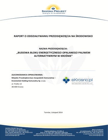 RAPORT O ODD)IAŁYWANIU PR)EDSIĘW)IĘCIA NA ŚRODOWISKO NA)WA PR)EDSIĘW)IĘCIA: „BUDOWA BLOKU ENERGETYCZNEGO OPALANEGO PALIWEM ALTERNATYWNYM W KROŚNIE” ZLECENIODAWCA OPRACOWANIA: Miejskie Przedsię iorstwo Gospodarki Ko u al ej – Kroś ieński Holdi g Ko u al y Sp. z o.o. ul. Fredry 12 38-400 Krosno Ta ó , Listopad 2014 Rapo t o Oddział a iu P zedsię zię ia a Ś odo isko: Budo a Bloku E e get z ego opala ego pali e alte at K oś ie SPIS TREŚCI WYKA) UŻYWANYCH DEFINICJI I TERMINÓW ..................................................................................................... 8 WYKA) UŻYWANYCH SKRÓTÓW ....................................................................................................................... 10 1. PODSTAWA, CEL I ZAKRES OPRACOWANIA .............................................................................................. 11 1.1. PR)EDSIĘW)IĘCIE INWESTYCYJNE .................................................................................................................... 11 1.2. WNIOSKODAWCA ........................................................................................................................................ 11 1.3. KLASYFIKACJA PR)EDSIĘW)IĘCIA ..................................................................................................................... 11 1.4. CEL I ZAKRES RAPORTU ................................................................................................................................. 12 1.5. PODSTAWA PRAWNA OPRACOWANIA RAPORTU................................................................................................. 13 1.6. PRZEPISY PRAWNE NA POZIOMIE UE ............................................................................................................... 13 1.6.1. Przepisy prawne na poziomie UE – stęp...................................................................................... 13 1.6.2. D ekt a Pa la e tu Eu opejskiego i Rad / /WE sp a ie odpadó o az u h lają a iektó e d ekt .......................................................................................................................................... 14 1.6.3. D ekt a Rad / /WE sp a ie składo a ia odpadó ................................................. 15 1.6.4. D ekt a Pa la e tu Eu opejskiego i Rad / /WE sp a ie spala ia odpadó ........... 16 1.6.5. Dyrekt a Pa la e tu Eu opejskiego i Rad / /UE sp a ie e isji p ze sło h (zintegrowane zapobieganie zanieczyszczeniom i ich kontrola – Dyrektywa IED) .......................................... 17 1.7. PRZEPISY PRAWNE NA POZIOMIE KRAJOWYM .................................................................................................... 20 1.7.1. Przepisy prawne na poziomie krajowym – stęp .......................................................................... 20 1.7.2. Ustawa o odpadach ....................................................................................................................... 23 1.7.3. Usta a o ut z a iu z stoś i i po ządku g i a h.................................................................. 29 1.7.4. Ustawa Prawo Energetyczne ......................................................................................................... 31 1.7.5. Rozpo ządze ie sp a ie k te ió o az p o edu dopusz za ia odpadó do składo a ia a składo isku da ego t pu ................................................................................................................................ 32 1.7.6. Rozpo ządze ie sp a ie agań dot zą h p o adze ia p o esu te i z ego p zekształ a ia odpadó ................................................................................................................................ 33 1.7.7. Rozpo ządze ie sp a ie sta da dó e is j h z i stala ji .................................................... 34 1.7.8. Rozpo ządze ie sp a ie sposo u o li za ia da h o da ie ś iade t a po hodzenia z kogeneracji ...................................................................................................................................................... 35 1.7.9. Rozpo ządze ie sp a ie ś iade t po hodze ia, uisz ze ia opłat zastęp zej, zakupu e e gii elektrycznej i iepła t o zo h O)E ...................................................................................................... 36 1.7.10. Rozpo ządze ie sp a ie sz zegóło h a u kó te h i z h k alifiko a ia zęś i e e gii odz ska ej z te i z ego p zekształ a ia odpadó ko u al h jako O)E ................................................ 37 1.8. PROGRAMY, PLANY I WYTYCZNE NA POZIOMIE UE, KRAJOWYM I REGIONALNYM....................................................... 38 1.8.1. BAT „Waste I i e atio ” .............................................................................................................. 38 1.8.2. Kpgo 2014 ...................................................................................................................................... 40 1.8.2.1. 1.8.2.2. 1.8.3. 1.8.4. 1.8.4.1. 1.8.4.2. 1.8.4.3. Wstęp ........................................................................................................................................................ 40 Cele w zakresie gospodarki odpadami komunalnymi ................................................................................ 40 St ategia oz oju oje ództ a – podka pa kie , Rzeszó sie pień ........................... 41 Pla gospoda ki odpada i oje ództ a podka pa kiego .......................................................... 42 Wstęp ........................................................................................................................................................ 42 Regiony Gospodarowania Odpadami Komunalnymi ................................................................................. 43 Cele w zakresie gospodarki odpadami komunalnymi ..........................................................