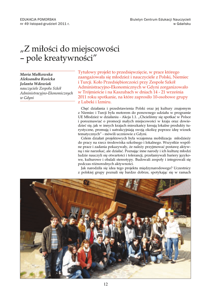 EDUKACJA POMORSKA nr 49 listopad-grudzień 2011 r. Biuletyn Centrum Edukacji Nauczycieli w Gdańsku „Z miłości do miejscowości – pole kreatywności” Maria Małkowska Aleksandra Rosicka Jolanta Wdowiak nauczyciele Zespołu Szkół Administracyjno-Ekonomicznych w Gdyni Tytułowy projekt to przedsięwzięcie, w prace którego zaangażowała się młodzież i nauczyciele z Polski, Niemiec i Turcji. Koło Przedsiębiorczości przy Zespole Szkół Administracyjno-Ekonomicznych w Gdyni zorganizowało w Trójmieście i na Kaszubach w dniach 14 - 21 września 2011 roku spotkanie, na które zaprosiło 10-osobowe grupy z Lubeki i Izmiru. Chęć działania i przedstawienia Polski oraz jej kultury znajomym z Niemiec i Turcji była motorem do ponownego udziału w programie UE Młodzież w działaniu - Akcja 1.1. „Chcieliśmy się spotkać w Polsce i porozmawiać o promocji małych miejscowości w kraju oraz dowiedzieć się, jak w innych krajach mieszkańcy kreują lokalne produkty turystyczne, promują i uatrakcyjniają swoją okolicę poprzez ideę wiosek tematycznych” - mówili uczniowie z Gdyni. Celem działań projektowych była wzajemna mobilizacja młodzieży do pracy na rzecz środowiska szkolnego i lokalnego. Wszystkie wspólne prace i zadania pokazywały, że należy przyjmować postawę aktywną i nie narzekać, ale działać. Poznając inne narody i ich kulturę młodzi ludzie nauczyli się otwartości i tolerancji, przełamywali bariery językowe, kulturowe i obalali stereotypy. Budowali zespoły i integrowali się podczas różnorodnych aktywności. Jak narodziła się idea tego projektu międzynarodowego? Uczestnicy z polskiej grupy poznali się bardzo dobrze, spotykając się w ramach 12 Biuletyn Centrum Edukacji Nauczycieli w Gdańsku EDUKACJA POMORSKA nr 49 listopad-grudzień 2011 r. Koła Przedsiębiorczości podczas realizacji projektów w programach „Młodzież w działaniu” i „Comenius”. Ich entuzjazm, energia i zainteresowania oraz ciekawość świata sprawiły, że do realizacji i kontynuacji projektu zaprosili przyjaciół z Niemiec i Turcji. Dyrekcja szkoły wspierała grupę inicjatywną w działaniach i pośredniczyła w rozmowach z Urzędem Miasta, który z kolei wyraził zgodę na reprezentowanie gdyńskiej młodzieży, podpisując umowę z Narodową Agencją. Idea wiosek tematycznych to temat dyskusji międzynarodowej. Jak zmienić myślenie mieszkańców o własnej miejscowości, w której dla większości nic się nie dzieje i z której należy za wszelką cenę uciec do dużego miasta? Jakie działania należy podjąć, by inni chcieli do niej przyjechać i w jaki sposób ją wyróżnić wśród innych miejsc? Jak stworzyć markę i logo miejscowości? Jak angażować do działań mieszkańców? Jak pozyskać sprzymierzeńców? Wielu uczestników projektu mieszka lub mieszkało w małych miejscowościach. Zastanawiali się, co ciekawego mogą sobie wzajemnie pokazać w odwiedzanych krajach. Czy zawsze musi to być duże miasto, który każdy z nas zna z prasy, internetu, telewizji czy wyjazdów? Na stronach internetowych znaleźli adresy wiosek współpracujących w ramach akcji „wioski tematyczne”. Pracując nad projektem korzystali z poczty elektronicznej i Skype’a, by ustalić wspólne działania i plan pobytu w Polsce. Szczegółowy przydział ćwiczeń i zakres obowiązków nastąpił w czasie wizyty przygotowawczej, która odbyła się 2 tygodnie przed spotkaniem. Udział w niej wzięli uczeń i nauczyciel z każdego z krajów partnerskich. Na początku działań projektowych ustalono wspólny regulamin postępowania, który podpisali wszyscy uczestnicy. W trakcie i na koń- 13 cu projektu odbyła się ewaluacja działań poprzez metody graficzne, dyskusje w grupach i na forum. Przykłady małych miejscowości, które zwiedzili uczestnicy projektu to Szymbark i Hel. Rozmawiali z ich mieszkańcami i opracowali programy promujące nietypowo, ale skutecznie podobne małe miejscowości. Poprzez wspólne zajęcia, które poprowadziła młodzież, rozwijali kreatywność, przedsiębiorczość oraz komunikowanie się w obcym języku. Uczniowie, pracując w mieszanych narodowościowo grupach stworzyli markę miejscowości, określili jej zasoby, słabe i mocne strony oraz sposoby wykorzystywania tego, czym ona dysponuje. Efekty swoich prac przedstawiali na forum w języku angielskim. Zachęciło ich to do dalszej nauki języka obcego i ośmieliło do występów publicznych. Każda z grup przedstawiła przykłady miejscowości z własnych krajów realizujących idee wiosek tematycznych. W projekcie duży nacisk położono na zabawy integracyjne i poznanie innych kultur. Zastosowano metody aktywizujące - eksperymenty terenowe, dramę, metody graficzne, taniec, śpiew, wywiady, podchody w mieście, konkursy, zajęcia z mieszkańcami wiosek. Poznano podstawowe zwroty w języku polskim, niemieckim i tureckim. Zorganizowano międzynarodowy piknik, wieczory narodowe, na których przybliżono poszczególne kultury poprzez tańce, piosenki i gry. Udział w spotkaniu rozbudził ciekawość świata i umożliwił uczestnikom rozwój lub nabycie nowych umiejętności, takich jak: kreatywność, planowanie i organizowanie pracy własnej i zespołu, porozumiewanie się w języku angielskim. Nauczył otwartości i tolerancji oraz wzajemnego mobilizowania do działań. Zwiększył szanse na ciekawszą pracę przez podwyższenie kompetencji zawodowych. EDUKACJA POMORSKA nr 49 listopad-grudzień 2011 r. Biuletyn Centrum Edukacji Nauczycieli w Gdańsku Przez wspólne działania i dyskusje, uczestnicy poznali uwarunkowania kulturowe, religijne i społeczne oraz język przyjaciół z zagranicy, co wzbogaciło wiedzę i wrażliwość, a także stało się przyczynkiem do dalszych poszukiwań i kreowania własnego rozwoju młodych uczestników projektu. W czasie działań projektowych uczestnicy poznali: metodę pracy „Brainwriting - metoda 6 3 5”. Jest ona niew