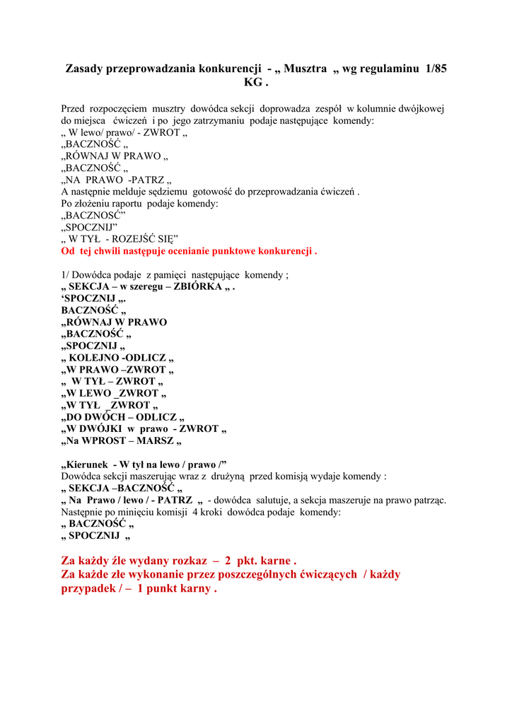 Zasady przeprowadzania konkurencji - „ Musztra „ wg regulaminu 1/85 KG . Przed rozpoczęciem musztry dowódca sekcji doprowadza zespół w kolumnie dwójkowej do miejsca ćwiczeń i po jego zatrzymaniu podaje następujące komendy: „ W lewo/ prawo/ - ZWROT „ „BACZNOŚĆ „ „RÓWNAJ W PRAWO „ „BACZNOŚĆ „ „NA PRAWO -PATRZ „ A następnie melduje sędziemu gotowość do przeprowadzania ćwiczeń . Po złożeniu raportu podaje komendy: „BACZNOSĆ” „SPOCZNIJ” „ W TYŁ - ROZEJŚĆ SIĘ” Od tej chwili następuje ocenianie punktowe konkurencji . 1/ Dowódca podaje z pamięci następujące komendy ; „ SEKCJA – w szeregu – ZBIÓRKA „ . ‘SPOCZNIJ „. BACZNOŚĆ „ „RÓWNAJ W PRAWO „BACZNOŚĆ „ „SPOCZNIJ „ „ KOLEJNO -ODLICZ „ „W PRAWO –ZWROT „ „ W TYŁ – ZWROT „ „W LEWO _ZWROT „ „W TYŁ _ZWROT „ „DO DWÓCH – ODLICZ „ „W DWÓJKI w prawo - ZWROT „ „Na WPROST – MARSZ „ „Kierunek - W tył na lewo / prawo /” Dowódca sekcji maszerując wraz z drużyną przed komisją wydaje komendy : „ SEKCJA –BACZNOŚĆ „ „ Na Prawo / lewo / - PATRZ „ - dowódca salutuje, a sekcja maszeruje na prawo patrząc. Następnie po minięciu komisji 4 kroki dowódca podaje komendy: „ BACZNOŚĆ „ „ SPOCZNIJ „ Za każdy źle wydany rozkaz – 2 pkt. karne . Za każde złe wykonanie przez poszczególnych ćwiczących / każdy przypadek / – 1 punkt karny .