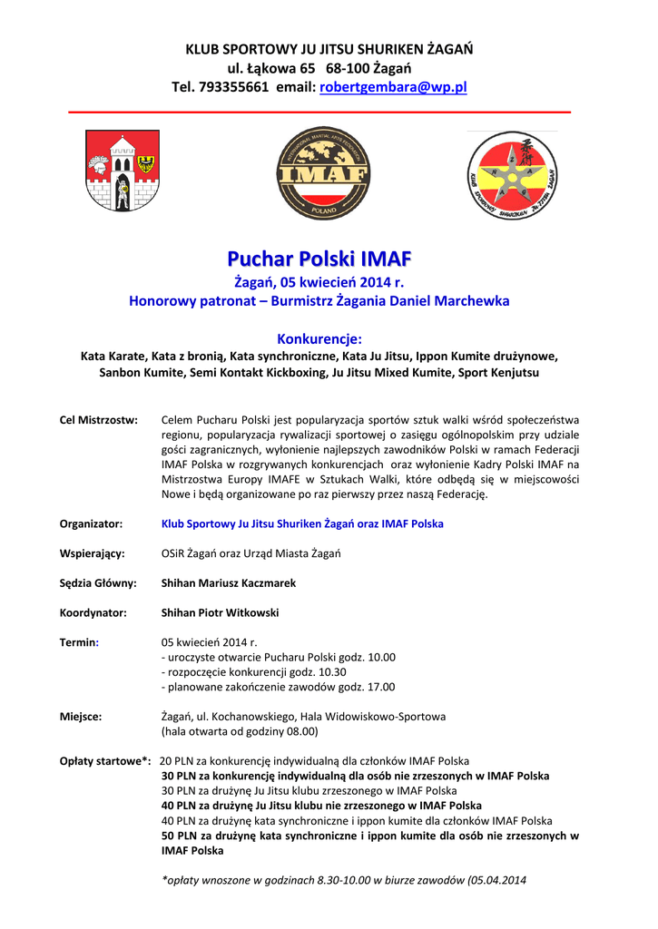 KLUB SPORTOWY JU JITSU SHURIKEN ŻAGAŃ ul. Łąkowa 65 68-100 Żagań Tel. 793355661 email: [email protected] Puchar Polski IMAF Żagań, 05 kwiecień 2014 r. Honorowy patronat – Burmistrz Żagania Daniel Marchewka Konkurencje: Kata Karate, Kata z bronią, Kata synchroniczne, Kata Ju Jitsu, Ippon Kumite drużynowe, Sanbon Kumite, Semi Kontakt Kickboxing, Ju Jitsu Mixed Kumite, Sport Kenjutsu Cel Mistrzostw: Celem Pucharu Polski jest popularyzacja sportów sztuk walki wśród społeczeństwa regionu, popularyzacja rywalizacji sportowej o zasięgu ogólnopolskim przy udziale gości zagranicznych, wyłonienie najlepszych zawodników Polski w ramach Federacji IMAF Polska w rozgrywanych konkurencjach oraz wyłonienie Kadry Polski IMAF na Mistrzostwa Europy IMAFE w Sztukach Walki, które odbędą się w miejscowości Nowe i będą organizowane po raz pierwszy przez naszą Federację. Organizator: Klub Sportowy Ju Jitsu Shuriken Żagań oraz IMAF Polska Wspierający: OSiR Żagań oraz Urząd Miasta Żagań Sędzia Główny: Shihan Mariusz Kaczmarek Koordynator: Shihan Piotr Witkowski Termin: 05 kwiecień 2014 r. - uroczyste otwarcie Pucharu Polski godz. 10.00 - rozpoczęcie konkurencji godz. 10.30 - planowane zakończenie zawodów godz. 17.00 Miejsce: Żagań, ul. Kochanowskiego, Hala Widowiskowo-Sportowa (hala otwarta od godziny 08.00) Opłaty startowe*: 20 PLN za konkurencję indywidualną dla członków IMAF Polska 30 PLN za konkurencję indywidualną dla osób nie zrzeszonych w IMAF Polska 30 PLN za drużynę Ju Jitsu klubu zrzeszonego w IMAF Polska 40 PLN za drużynę Ju Jitsu klubu nie zrzeszonego w IMAF Polska 40 PLN za drużynę kata synchroniczne i ippon kumite dla członków IMAF Polska 50 PLN za drużynę kata synchroniczne i ippon kumite dla osób nie zrzeszonych w IMAF Polska *opłaty wnoszone w godzinach 8.30-10.00 w biurze zawodów (05.04.2014 Nagrody: medale i dyplomy za pierwsze trzy miejsca, dla każdego zwycięzcy konkurencji puchar, nagrody rzeczowe dla najlepszego zawodnika i zawodniczki do lat 16 i powyżej lat 16. Konkurencje: Kata indywidualne: 1. Kata młodzików 10-12 lat 2. Kata kadetów 13-15 lat 3. Kata juniorów 16-18 lat, białe – zielone pasy ( 9kyu – 6kyu ) 4. Kata juniorów 16-18 lat, niebieskie – brązowe pasy ( 5kyu – 1kyu ) 5. Kata seniorów 19+, żółte – niebieskie pasy ( 8kyu – 4kyu ) 6. Kata seniorów 19+, brązowe i czarne pasy ( 3kyu – Dan ) 7. Kata młodziczek 10-12 lat 8. Kata kadetek 13-15 lat 9. Kata juniorek 16-18 lat 10. Kata seniorek 19+ Kata indywidualne z bronią (bez podziału na płeć i stopnie zaawansowania): 11. Kata Kobudo, grupa młodsza do 15 lat 12. Kata Kobudo, grupa starsza 16+ Kata synchroniczne (3 osoby, mogą startować drużyny mieszane): 13. Kata synchroniczne, grupa młodsza do 15 lat 14. Kata synchroniczne, grupa starsza 16+ Kata Ju Jitsu (bez podziału na stopnie zaawansowania): 15. Kata ju jitsu kadetów 13-15 lat 16. Kata ju jitsu juniorów 16-18 lat 17. Kata ju jitsu seniorów 19+ 18. Kata ju jitsu kadetek i juniorek 13-18 lat 19. Kata ju jitsu seniorek 19+ Sanbon kumite: 20. Sanbon Kumite młodzików 10-12 lat 21. Sanbon Kumite kadetów 13-15 lat 22. Sanbon Kumite juniorów 16-18 lat 23. Sanbon Kumite seniorów 19+, żółte-niebieskie pasy ( 8kyu –4kyu ) 24. Sanbon Kumite seniorów 19+, brązowe-czarne pasy ( 3kyu-dan ) 25. Sanbon Kumite młodziczek 10-12 lat 26. Sanbon Kumite kadetek 13-15 lat 27. Sanbon Kumite juniorek 16-18 lat 28. Sanbon Kumite seniorek 19+ Semi Kontakt: 29. Semi Kontakt kadetów 13-15 lat, waga lekka 30. Semi Kontakt kadetów 13-15 lat, waga średnia 31. Semi Kontakt kadetów 13-15 lat, waga ciężka 32. Semi Kontakt juniorów 16-18 lat, waga lekka 33. Semi Kontakt juniorów 16-18 lat, waga średnia 34. Semi Kontakt juniorów 16-18 lat, waga ciężka 35. Semi Kontakt seniorów 19+, waga lekka 36. Semi Kontakt seniorów 19+, waga średnia 37. Semi Kontakt seniorów 19+, waga ciężka 38 Semi Kontakt kadetek 13-15 lat, lżejsze 39. Semi Kontakt kadetek 13-15 lat, cięższe 40. Semi Kontakt juniorek 16-18 lat, lżejsze 41. Semi Kontakt juniorek 16-18 lat, cięższe 42. Semi Kontakt seniorek 19+, lżejsze 43. Semi Kontakt seniorek 19+, cięższe Ju Jitsu Mixed Kumite: 44-48. Ju Jitsu Mixed Kumite kadetów 13-15 lat -45 kg, - 52 kg, -59 kg, - 66 kg, + 66 kg 49-53. Ju Jitsu Mixed Kumite kadetek 13-15 lat -45 kg, - 52 kg, -59 kg, - 66 kg, + 66 kg 54-58. Ju Jitsu Mixed Kumite juniorów 16-18 lat - 55kg, - 62 kg, - 79 kg, -86 kg , +86 kg 59-63. Ju Jitsu Mixed Kumite juniorek 16-18 lat - 50kg, - 55 kg, -60kg, - 65 kg. + 65 kg 64-68. Ju Jitsu Mixed Kumite seniorów 19+ – 65kg, – 77 kg, - 84 kg, - 91 kg, +91 kg 69-73. Ju Jitsu Mixed seniorek 19+ – 55 kg, - 62 kg, - 69 kg , -76 kg, +76 kg Sport Kenjutsu: 74. Sport Kenjutsu 10-12 lat, - 140cm młodziczki i młodzicy razem 75. Sport Kenjutsu 10-12 lat, +140cm młodziczki i młodzicy razem 76. Sport Kenjutsu 13-15 lat, -160cm kadetki i kadeci razem 77. Sport Kenjutsu 13-15 lat, +160cm kadetki i kadeci razem 78. Sport Kenjutsu juniorów 16-18 lat, -170cm 79. Sport Kenjutsu juniorów 16-18 lat, +170cm 80. Sport Kenjutsu seniorów 19+, -180cm 81. Sport Kenjutsu seniorów 19+, +180cm 82. Sport Kenjutsu juniorek 16-18 lat 83. Sport Kenjutsu seniorek 19+ Ippon Kumite: 84. Ippon Kumite Drużynowe seniorów (3 osoby) O przypisaniu do kategorii wiekowej decyduje pełna data urodzenia. Organizator zastrzega sobie możliwość łączenia kategorii wagowych lub wzrostowych we wszystkich konkurencjach, w których wystąpi mniej niż trzech zgłoszonych zawodników. Łączone mogą być kategorie najbardziej zbliżone do siebie. Junior może wystartować w kategorii senior za pisemną zgodą trenera. W kategorii Ju Jitsu Mixed Kumite różnica wagi nie może być większa niż 10 kg, w innych przypadkach dana kategoria wagowa nie zostanie rozegrana! Zgłoszenia: Zgłoszenia należy nadsyłać najpóźniej do dnia 28.03.2014, wyłącznie pocztą elektro