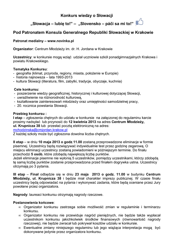 Konkurs wiedzy o Słowacji „Słowacja – lubię to!” – „Slovensko – páči sa mi to!” Pod Patronatem Konsula Generalnego Republiki Słowackiej w Krakowie Patronat medialny – www.novinka.pl Organizator: Centrum Młodzieży im. dr. H. Jordana w Krakowie Uczestnicy: w konkursie mogą wziąć udział uczniowie szkół ponadgimnazjalnych Krakowa i powiatu Krakowskiego. Tematyka Konkursu: - geografia (klimat, przyroda, regiony, miasta, położenie w Europie) - historia najnowsza – lata 1993-2013 - kultura Słowacji (literatura, film, zabytki, tradycje, obyczaje, kuchnia) Cele konkursu: - poszerzenie wiedzy geograficznej, historycznej i kulturowej dotyczącej Słowacji, - uwrażliwienie na różnorodność kulturową, - kształtowanie zainteresowań młodzieży oraz umiejętności samodzielnej pracy, - 20. rocznica powstania Słowacji. Przebieg konkursu : I etap – zgłoszenia chętnych do udziału w konkursie na załączonej do regulaminu karcie prosimy nadsyłać lub przynosić do 12 kwietnia 2013 na adres Centrum Młodzieży, ul. Krupnicza 38 lub przesłać pocztą elektroniczną na adres: [email protected] Z każdej szkoły może być zgłoszona dowolna liczba chętnych. II etap – w dniu 10 maja 2013 o godz.11.00 zostaną przeprowadzone eliminacje w formie pisemnej. Uczestnicy będą rozwiązywać indywidualnie test przez godzinę zegarową. O miejscu eliminacji uczestnicy zostaną powiadomieni w późniejszym terminie. Do finału przechodzi 5 osób, które zdobędą największą liczbę punktów. Jeżeli eliminacje pisemne nie wyłonią 5 uczestników, pomiędzy uczestnikami, którzy zdobędą tę samą liczbę punktów zostanie przeprowadzona przed finałem dogrywka ustna. Uczestnicy otrzymają po 3 pytania. III etap – Finał odbędzie się w dniu 23 maja 2013 o godz. 11.00 w budynku Centrum Młodzieży, ul. Krupnicza 38 i będzie miał charakter imprezy publicznej. W czasie finału uczestnicy będą odpowiadać na pytania i wykonywać zadania, które będą oceniane przez Jury powołane przez organizatora. Nagrody: laureaci konkursu otrzymają nagrody rzeczowe. Postanowienia końcowe: • Organizator konkursu zastrzega sobie możliwość zmian w regulaminie i terminarzu konkursu. • Organizator konkursu nie przewiduje nagród pieniężnych, nie będzie także wypłacał uczestnikom konkursu jakichkolwiek środków finansowych (równowartość nagrody rzeczowej), nie będzie zwracał lub pokrywał kosztów udziału w konkursie. • Ewentualne zmiany niniejszego regulaminu lub jego wiążąca interpretacja mogą być dokonywane jedynie przez organizatora konkursu. • • • Organizator zastrzega sobie prawo do fotografowania podczas eliminacji i finału konkursu oraz do nieodpłatnego publikowania tych zdjęć na stronie www.cmjordan.krakow.pl. Przesłanie zgłoszenia do udziału w konkursie jest równoznaczne z akceptacją wszystkich punktów regulaminu. Do udzielania informacji o konkursie organizator upoważnia Monikę Stachnik-Czaplę: [email protected] oraz Małgorzatę Chodzińską: [email protected] Sugerowania literatura: • Jerzy Tomaszewski „Słowacja” • Wiesława Rusin „Słowacja” • Słowacja Globtroter. Planuj Zwiedzaj Podróżuj. • Lech Kościelak "Historia Słowacji" • Strony www poświęcone Słowacji