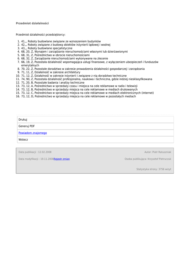 Przedmiot działalności Przedmiot działalności przedsiębiorcy: 1. 2. 3. 4. 5. 6. 7. 8. 9. 10. 11. 12. 13. 14. 15. 16. 41,,, Roboty budowlane związane ze wznoszeniem budynków 42,,, Roboty związane z budową obiektów inżynierii lądowej i wodnej 43,,, Roboty budowlane specjalistyczne 68, 20, Z, Wynajem i zarządzanie nieruchomościami własnymi lub dzierżawionymi 68, 31, Z, Pośrednictwo w obrocie nieruchomościami 68, 32, Z, Zarządzanie nieruchomościami wykonywane na zlecenie 66, 19, Z, Pozostała działalność wspomagająca usługi finansowe, z wyłączeniem ubezpieczeń i funduszów emerytalnych 70, 22, Z, Pozostałe doradztwo w zakresie prowadzenia działalności gospodarczej i zarządzania 71, 11, Z, Działalność w zakresie architektury 71, 12, Z, Działalność w zakresie inżynierii i związane z nią doradztwo techniczne 74, 90, Z, Pozostała działalność profesjonalna, naukowa i techniczna, gdzie indziej niesklasyfikowana 71, 20, B, Pozostałe badania i analizy techniczne 73, 12, A, Pośrednictwo w sprzedaży czasu i miejsca na cele reklamowe w radio i telewizji 73, 12, B, Pośrednictwo w sprzedaży miejsca na cele reklamowe w mediach drukowanych 73, 12, C, Pośrednictwo w sprzedaży miejsca na cele reklamowe w mediach elektronicznych (internet) 73, 12, D, Pośrednictwo w sprzedaży miejsca na cele reklamowe w pozostałych mediach Drukuj Generuj PDF Powiadom znajomego Wstecz Data publikacji : 12.02.2008 Data modyfikacji : 19.11.2008Rejestr zmian Autor: Piotr Ratuszniak Osoba publikująca: Krzysztof Pietruczuk Statystyka strony: 3756 wizyt