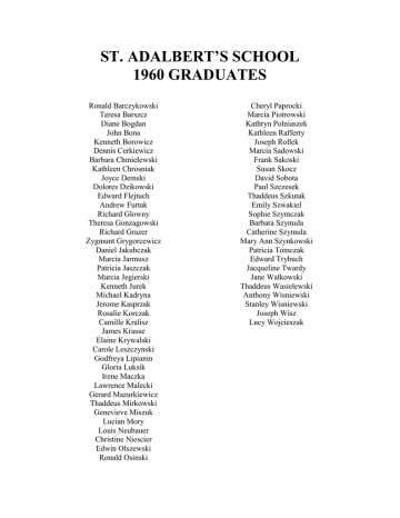 ST. ADALBERT’S SCHOOL 1960 GRADUATES Ronald Barczykowski Teresa Barszcz Diane Bogdan John Bona Kenneth Borowicz Dennis Cerkiewicz Barbara Chmielewski Kathleen Chrosniak Joyce Demski Dolores Dzikowski Edward Flejtuch Andrew Furtak Richard Glowny Theresa Gonzagowski Richard Grazer Zygmunt Grygorcewicz Daniel Jakubczak Marcia Jarmusz Patricia Jaszczak Marcia Jegierski Kenneth Jurek Michael Kadryna Jerome Kasprzak Rosalie Korczak Camille Kralisz James Krause Elaine Krywalski Carole Leszczynski Godfreya Lipianin Gloria Luksik Irene Maczka Lawrence Malecki Gerard Mazurkiewicz Thaddeus Mirkowski Genevieve Miszuk Lucian Mory Louis Neubauer Christine Niescier Edwin Olszewski Ronald Osinski Cheryl Paprocki Marcia Piotrowski Kathryn Polniaszek Kathleen Rafferty Joseph Rollek Marcia Sadowski Frank Sakoski Susan Skocz David Sobota Paul Szczesek Thaddeus Szkutak Emily Szwakiel Sophie Szymczak Barbara Szymula Catherine Szymula Mary Ann Szynkowski Patricia Tomczak Edward Trybuch Jacqueline Twardy Jane Walkowski Thaddeus Wasielewski Anthony Wisniewski Stanley Wisniewski Joseph Wisz Lucy Wojcieszak