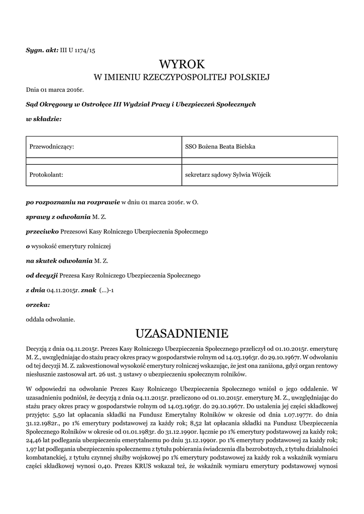 Sygn. akt: III U 1174/15 WYROK W IMIENIU RZECZYPOSPOLITEJ POLSKIEJ Dnia 01 marca 2016r. Sąd Okręgowy w Ostrołęce III Wydział Pracy i Ubezpieczeń Społecznych w składzie: Przewodniczący: SSO Bożena Beata Bielska Protokolant: sekretarz sądowy Sylwia Wójcik po rozpoznaniu na rozprawie w dniu 01 marca 2016r. w O. sprawy z odwołania M. Z. przeciwko Prezesowi Kasy Rolniczego Ubezpieczenia Społecznego o wysokość emerytury rolniczej na skutek odwołania M. Z. od decyzji Prezesa Kasy Rolniczego Ubezpieczenia Społecznego z dnia 04.11.2015r. znak (...)-1 orzeka: oddala odwołanie. UZASADNIENIE Decyzją z dnia 04.11.2015r. Prezes Kasy Rolniczego Ubezpieczenia Społecznego przeliczył od 01.10.2015r. emeryturę M. Z., uwzględniając do stażu pracy okres pracy w gospodarstwie rolnym od 14.03.1963r. do 29.10.1967r. W odwołaniu od tej decyzji M. Z. zakwestionował wysokość emerytury rolniczej wskazując, że jest ona zaniżona, gdyż organ rentowy niesłusznie zastosował art. 26 ust. 3 ustawy o ubezpieczeniu społecznym rolników. W odpowiedzi na odwołanie Prezes Kasy Rolniczego Ubezpieczenia Społecznego wniósł o jego oddalenie. W uzasadnieniu podniósł, że decyzją z dnia 04.11.2015r. przeliczono od 01.10.2015r. emeryturę M. Z., uwzględniając do stażu pracy okres pracy w gospodarstwie rolnym od 14.03.1963r. do 29.10.1967r. Do ustalenia jej części składkowej przyjęto: 5,50 lat opłacania składki na Fundusz Emerytalny Rolników w okresie od dnia 1.07.1977r. do dnia 31.12.1982r., po 1% emerytury podstawowej za każdy rok; 8,52 lat opłacania składki na Fundusz Ubezpieczenia Społecznego Rolników w okresie od 01.01.1983r. do 31.12.1990r. łącznie po 1% emerytury podstawowej za każdy rok; 24,46 lat podlegania ubezpieczeniu emerytalnemu po dniu 31.12.1990r. po 1% emerytury podstawowej za każdy rok; 1,97 lat podlegania ubezpieczeniu społecznemu z tytułu pobierania świadczenia dla bezrobotnych, z tytułu działalności kombatanckiej, z tytułu czynnej służby wojskowej po 1% emerytury podstawowej za każdy rok a wskaźnik wymiaru części składkowej wynosi 0,40. Prezes KRUS wskazał też, że wskaźnik wymiaru emerytury podstawowej wynosi 0,86, część uzupełniająca wynosi 752,78zł, łączna wysokość emerytury rolniczej brutto wynosi 1.108,92zł (356,14zł +752,78zł) a emerytura netto wynosi 941,92zł. Nadto organ rentowy wskazał, że wyrokiem Sądu Okręgowego w ostrołęce z dnia 09.12.2015r., wydanym w sprawie IIIU 526/15, oddalono odwołanie M. Z. od wcześniejszej decyzji Prezesa KRUS, przyznającej mu prawo emerytury rolniczej. Ostatecznie odwołujący domagał się również zwiększenia części uzupełniającej emerytury za 3 pełne lata i dwa kwartały, bowiem wiek emerytalny uzyskał 14.03.2012r. i nie musiał już płacić składek, składki te jednak płacił, gdyż o emeryturę wystąpił dopiero w 2015r. Sąd ustalił następujący stan faktyczny: M. Z. w dniu 02.06.2015r. złożył wniosek o przyznanie prawa do emerytury rolniczej. Po jego rozpoznaniu decyzją z dnia 15.06.2015r. Prezes Kasy Rolniczego Ubezpieczenia Społecznego przyznał mu od dnia 02.06.2015r. prawo do emerytury rolniczej. Do ustalenia jej części składkowej przyjęto: - 5,50 lat opłacania składki na Fundusz Emerytalny Rolników w okresie od dnia 1.07.1977r. do dnia 31.12.1982r., po 1% emerytury podstawowej za każdy rok, - 8,52 lat opłacania składki na Fundusz Ubezpieczenia Społecznego Rolników w okresie od 01.01.1983r. do 31.12.1990r. łącznie po 1% emerytury podstawowej za każdy rok, - 24,46 lat podlegania ubezpieczeniu emerytalnemu po dniu 31.12.1990r. po 1% emerytury podstawowej za każdy rok, - 1,97 lat podlegania ubezpieczeniu społecznemu z tytułu pobierania świadczenia dla bezrobotnych, z tytułu działalności kombatanckiej, z tytułu czynnej służby wojskowej po 1% emerytury podstawowej za każdy rok, - wskaźnik wymiaru części składkowej wyniósł 0,40. Wskaźnik wymiaru emerytury podstawowej wyniósł 0,86. Część uzupełniającą emerytury wyliczono w wysokości 85,50% emerytury podstawowej na kwotę 752,78zł, łączna wysokość emerytury rolniczej brutto wyniosła 1.108,92zł brutto (356,14zł +752,78zł) a emerytura netto wyniosła 941,92zł. Do ustalenia prawa do świadczenia uwzględniono: okresy pracy w gospodarstwie rolnym od 30.10.1967r. do 18.10.1969r., od 01.03.1976r. do 30.06.1977r., od 01.07.1977r. do 31.12.1982r., od 01.01.1983r. do 31.12.1990r. i od 01.01.1991r. do 15.06.20015r. Nadto uwzględniono okres zasadniczej służby wojskowej od 30.10.1967r. do 18.10.1969r. M. Z., składając wniosek o emeryturę rolniczą, domagał się zaliczenia okresu pracy w gospodarstwie rolnym od marca 1963r. do marca 1969r., od 11.03.1976r. do 12.07.2006r. i od 03.07.2006r. do dnia złożenia wniosku. Z powyższych okresów Prezes KRUS, wydając decyzję z 15.06.2015r., nie uwzględnił jedynie okresu od 13.03.1963r. do 29.10.1967r. Odwołujący, składając wniosek o emeryturę rolniczą, nie domagał się natomiast zaliczenia okresu pracy w gospodarstwie rolnym od 19.10.1969r. do 10.03.1976r. W dniu 04.11.2015r. Prezes KRUS wydał decyzję, w której uwzględnił do stażu pracy okres pracy w gospodarstwie rolnym od 13.03.1963r. do 29.10.1967r. W dalszym ciągu nie uwzględnił zaś tego okresu do ustalenia wysokości części składkowej emerytury wskazując, że okres ten przypada w okresie dłuższym niż 25 lat wstecz od spełnienia przez odwołującego warunków do uzyskania emerytury rolniczej. M. Z., ur. (...), warunki do uzyskania prawa do emerytury rolniczej spełnił w dniu 14.03.2012r. Wydając decyzje z dnia 15.06.2015r. i z dnia 04.11.2015r. organ rentowy nie zastosował przepisu art. 26 ust. 3 ustawy o ubezpieczeniu społecznym rolników, bowiem w dacie przyznawania emerytury odwołujący osiągnął już powszechny wiek emerytalny. Powyższy stan faktyczny Sąd ustalił w oparciu o całość dokumentów zawartych w aktach eme