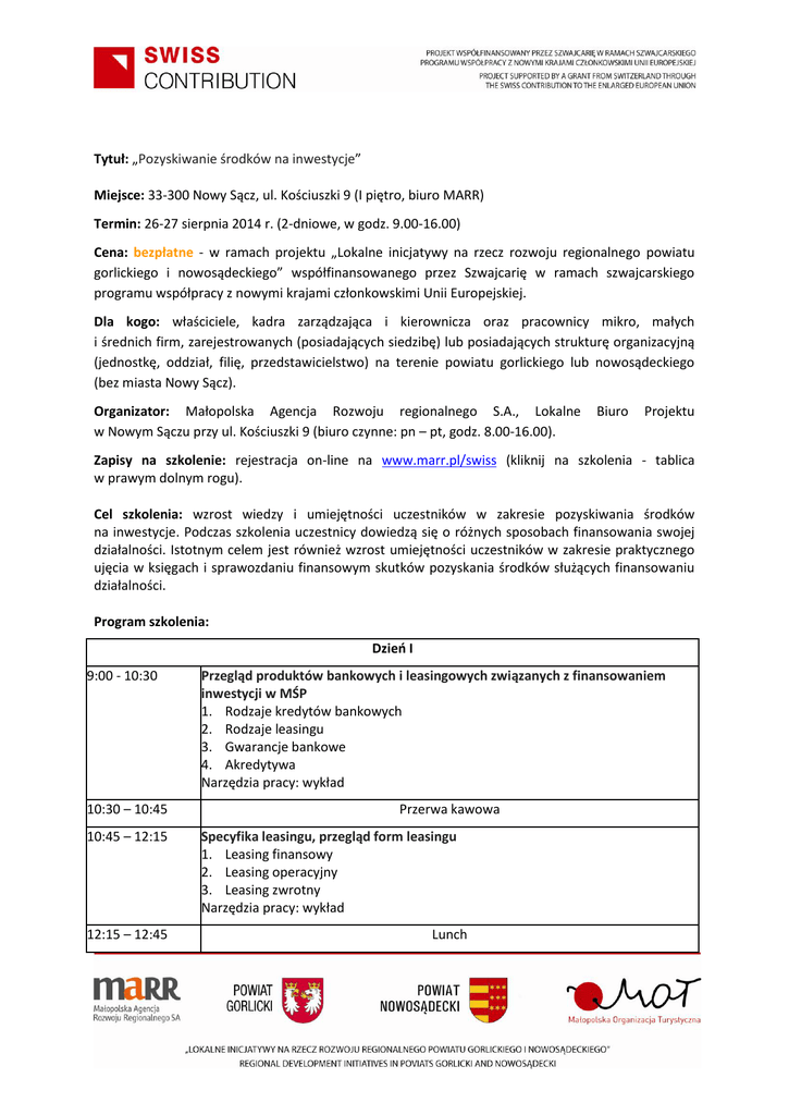 Tytuł: „Pozyskiwanie środków na inwestycje” Miejsce: 33-300 Nowy Sącz, ul. Kościuszki 9 (I piętro, biuro MARR) Termin: 26-27 sierpnia 2014 r. (2-dniowe, w godz. 9.00-16.00) Cena: bezpłatne - w ramach projektu „Lokalne inicjatywy na rzecz rozwoju regionalnego powiatu gorlickiego i nowosądeckiego” współfinansowanego przez Szwajcarię w ramach szwajcarskiego programu współpracy z nowymi krajami członkowskimi Unii Europejskiej. Dla kogo: właściciele, kadra zarządzająca i kierownicza oraz pracownicy mikro, małych i średnich firm, zarejestrowanych (posiadających siedzibę) lub posiadających strukturę organizacyjną (jednostkę, oddział, filię, przedstawicielstwo) na terenie powiatu gorlickiego lub nowosądeckiego (bez miasta Nowy Sącz). Organizator: Małopolska Agencja Rozwoju regionalnego S.A., Lokalne w Nowym Sączu przy ul. Kościuszki 9 (biuro czynne: pn – pt, godz. 8.00-16.00). Biuro Projektu Zapisy na szkolenie: rejestracja on-line na www.marr.pl/swiss (kliknij na szkolenia - tablica w prawym dolnym rogu). Cel szkolenia: wzrost wiedzy i umiejętności uczestników w zakresie pozyskiwania środków na inwestycje. Podczas szkolenia uczestnicy dowiedzą się o różnych sposobach finansowania swojej działalności. Istotnym celem jest również wzrost umiejętności uczestników w zakresie praktycznego ujęcia w księgach i sprawozdaniu finansowym skutków pozyskania środków służących finansowaniu działalności. Program szkolenia: Dzień I 9:00 - 10:30 10:30 – 10:45 10:45 – 12:15 12:15 – 12:45 Przegląd produktów bankowych i leasingowych związanych z finansowaniem inwestycji w MŚP 1. Rodzaje kredytów bankowych 2. Rodzaje leasingu 3. Gwarancje bankowe 4. Akredytywa Narzędzia pracy: wykład Przerwa kawowa Specyfika leasingu, przegląd form leasingu 1. Leasing finansowy 2. Leasing operacyjny 3. Leasing zwrotny Narzędzia pracy: wykład Lunch 12:45 – 14:15 14:15 – 14:30 14:30 – 16:00 Podstawowe zasady rachunkowości kredytów i leasingów 1. Ujęcie rachunkowe i wycena zobowiązania kredytowego – ewidencja różnych form kredytów. 2. Ujęcie księgowe umów leasingowych – leasing finansowy i leasing operacyjny Narzędzia pracy: wykład i ćwiczenia – przykłady i zadania Przerwa kawowa Podstawowe zasady rachunkowości kredytów i leasingów c.d. 1. Ujęcie rachunkowe i wycena zobowiązania kredytowego – ewidencja różnych form kredytów. 2. Ujęcie księgowe umów leasingowych – leasing finansowy i leasing operacyjny Narzędzia pracy: wykład i ćwiczenia – przykłady i zadania Dzień II 9:00 – 10:30 10:30 – 10:45 10:45 – 12:15 12:15 – 12:45 12:45 – 13.30 13.30 – 14:15 14:15 – 14:30 14:30 – 16:00 Alternatywne dla kredytu bankowego i leasingu źródła finansowania inwestycji. 1. Dotacje. 2. Faktoring i jego rodzaje. 3. Obrót wierzytelnościami. 4. Pożyczki i obligacje. Narzędzia pracy: wykład i ćwiczenia – przykłady i zadania Przerwa kawowa Kapitałowe źródła finansowania inwestycji. 1. Emisja akcji i udziałów. 2. Dopłaty do kapitału. 3. Obligacje zamienne na akcje. Narzędzia pracy: wykład i ćwiczenia – przykłady i zadania Lunch Kapitałowe źródła finansowania inwestycji – c.d. Warunki uczestnictwa i funkcjonowania firmy na NewConnect. Narzędzia pracy: wykład Przerwa kawowa Funkcjonujące fundusze pożyczkowe, fundusze poręczeniowe oraz fundusze inwestycyjne typu Venture Capital. Narzędzia pracy: wykład W ramach szkolenia MARR S.A. zapewnia materiały szkoleniowe, zaświadczenia o ukończeniu szkolenia, zaświadczenia o uzyskanej pomocy de minimis oraz catering. TRENER: Elżbieta Pudło Biegły rewident wpisany do rejestru biegłych KIBR pod numerem 9950. Ukończone studia menedżerskie executive MBA i uzyskany dyplom Master of Business Administration – GFKM Gdańsk i Graduate School w Nicei. Wieloletni pracownik instytucji finansowych. Doświadczony wykładowca w Oddziałach Okręgowych Stowarzyszenia Księgowych w Polsce. Prowadzenie wykładów z zakresu MSR/MSSF na studiach podyplomowych organizowanych przez Instytut Rachunkowości i Podatków, Wyższą Szkołę Informatyki i Zarządzania w Rzeszowie oraz na obligatoryjnych szkoleniach dla biegłych rewidentów z zakresu rachunkowości i audytu. Współpracuje z miesięcznikiem Rachunkowość i dziennikami Rzeczpospolita i Puls Biznesu. Liczba miejsc ograniczona, decyduje kolejność zgłoszeń! Pytania? Tel. 18 262 12 76 Zapisz się już dziś www.marr.pl/swiss