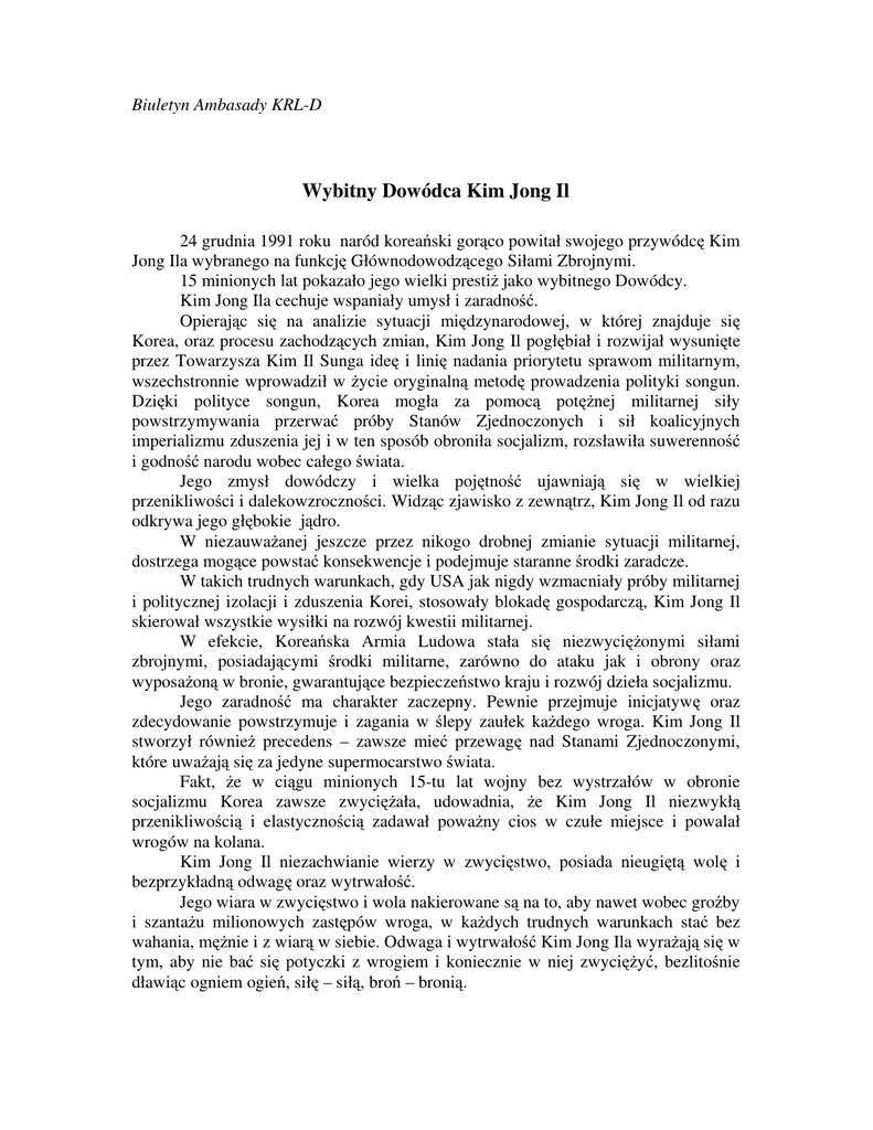Biuletyn Ambasady KRL-D Wybitny Dowódca Kim Jong Il 24 grudnia 1991 roku naród koreański gorąco powitał swojego przywódcę Kim Jong Ila wybranego na funkcję Głównodowodzącego Siłami Zbrojnymi. 15 minionych lat pokazało jego wielki prestiż jako wybitnego Dowódcy. Kim Jong Ila cechuje wspaniały umysł i zaradność. Opierając się na analizie sytuacji międzynarodowej, w której znajduje się Korea, oraz procesu zachodzących zmian, Kim Jong Il pogłębiał i rozwijał wysunięte przez Towarzysza Kim Il Sunga ideę i linię nadania priorytetu sprawom militarnym, wszechstronnie wprowadził w życie oryginalną metodę prowadzenia polityki songun. Dzięki polityce songun, Korea mogła za pomocą potężnej militarnej siły powstrzymywania przerwać próby Stanów Zjednoczonych i sił koalicyjnych imperializmu zduszenia jej i w ten sposób obroniła socjalizm, rozsławiła suwerenność i godność narodu wobec całego świata. Jego zmysł dowódczy i wielka pojętność ujawniają się w wielkiej przenikliwości i dalekowzroczności. Widząc zjawisko z zewnątrz, Kim Jong Il od razu odkrywa jego głębokie jądro. W niezauważanej jeszcze przez nikogo drobnej zmianie sytuacji militarnej, dostrzega mogące powstać konsekwencje i podejmuje staranne środki zaradcze. W takich trudnych warunkach, gdy USA jak nigdy wzmacniały próby militarnej i politycznej izolacji i zduszenia Korei, stosowały blokadę gospodarczą, Kim Jong Il skierował wszystkie wysiłki na rozwój kwestii militarnej. W efekcie, Koreańska Armia Ludowa stała się niezwyciężonymi siłami zbrojnymi, posiadającymi środki militarne, zarówno do ataku jak i obrony oraz wyposażoną w bronie, gwarantujące bezpieczeństwo kraju i rozwój dzieła socjalizmu. Jego zaradność ma charakter zaczepny. Pewnie przejmuje inicjatywę oraz zdecydowanie powstrzymuje i zagania w ślepy zaułek każdego wroga. Kim Jong Il stworzył również precedens – zawsze mieć przewagę nad Stanami Zjednoczonymi, które uważają się za jedyne supermocarstwo świata. Fakt, że w ciągu minionych 15-tu lat wojny bez wystrzałów w obronie socjalizmu Korea zawsze zwyciężała, udowadnia, że Kim Jong Il niezwykłą przenikliwością i elastycznością zadawał poważny cios w czułe miejsce i powalał wrogów na kolana. Kim Jong Il niezachwianie wierzy w zwycięstwo, posiada nieugiętą wolę i bezprzykładną odwagę oraz wytrwałość. Jego wiara w zwycięstwo i wola nakierowane są na to, aby nawet wobec groźby i szantażu milionowych zastępów wroga, w każdych trudnych warunkach stać bez wahania, mężnie i z wiarą w siebie. Odwaga i wytrwałość Kim Jong Ila wyrażają się w tym, aby nie bać się potyczki z wrogiem i koniecznie w niej zwyciężyć, bezlitośnie dławiąc ogniem ogień, siłę – siłą, broń – bronią. W latach 90-ch zeszłego wieku, kiedy „zimna wojna” między wschodem i zachodem sprowadziła się do rywalizacji między Koreą a USA, w pełni ujawniły się te jego cechy osobiste. Na twarde stanowisko USA przedstawić swoje jeszcze twardsze, na nóż wroga odpowiedzieć mieczem, na strzelbę – armatą. Z takim zdecydowaniem Korea odniosła zwycięstwo za zwycięstwem w politycznej, militarnej i dyplomatycznej rywalizacji z USA. Nie bez przyczyny wielu ludzi twierdzi, że dzięki odwadze Kim Jong Ila nasza planeta nie odchyla się od swojej orbity, dzięki jego woli kręci się ona równo. Kim Jong Il w najwyższym stopniu uosabia miłość i zaufanie do żołnierzy. Odnosi się on do uzbrojonych żołnierzy nie jak do żołnierzy podporządkowanych Najwyższemu Głównodowodzącemu, lecz jak do towarzyszy rewolucyjnych, których łączy wspólna myśl, wola i uczucie. „Poprzez zaufanie i miłość uczynię armię zespołem, zwartym kolektywem” – z taką myślą jedzie tam, gdzie tylko znajdują się żołnierze, bez względu na odległość i trudy podróży. Aby spotkać się z żołnierzami przebywał na posterunkach na pierwszej linii, skąd wróg jest na wyciągnięcie ręki, pokonywał często kręte górskie ścieżki czy morskie fale. W ten sposób stosunki między Najwyższym Głównodowodzącym i żołnierzami stały się ścisłe i mocne, a ich cechą charakterystyczną jest jednomyślność i zwartość. Pewien lotnik, aby zapewnić bezpieczeństwo dowództwa rewolucji koreańskiej odmówił katapultowania się i zginął spadając z płonącym samolotem. Pewnego razu żołnierze przykryli własnym ciałem wybuchający granat ręczny, czym uchronili od zniszczenia portrety Kim Il Sunga i Kim Jong Ila oraz uratowali swoich towarzyszy. Koreańska Armia Ludowa, mocno złączona gotowością bronić własną piersią swojego przywódcę, stanowi symbol niezwyciężoności państwowej potęgi Korei, a jej potęga jest silniejsza od broni jądrowej. Koreańska Armia Ludowa, której Najwyższym Głównodowodzącym jest Kim Jong Il zawsze będzie zwyciężać.