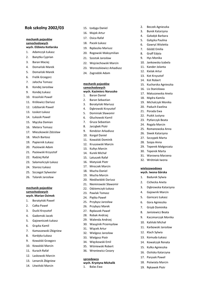 Rok szkolny 2002/03 15. Łodyga Daniel 16. Majek Artur 17. Osica Rafał mechanik pojazdów samochodowych wych. Elżbieta Kotlarska 19. Rędaszka Mariusz 1. Adamczyk Łukasz 20. Rogowski Maksymilian 2. Banytka Cyprian 21. Szostak Jarosław 3. Baran Maciej 22. Wojciechowski Marcin 4. Domański Marek 23. Woroszkiewicz Arkadiusz 5. Domański Marek 24. Zagrodzki Adam 6. Frelik Grzegorz 7. Jałocha Tomasz 8. Kondej Jarosław 9. Kondej Łukasz 10. Krasiński Paweł 11. Królewicz Dariusz 12. Lidzbarski Paweł 13. Łoskot Łukasz 14. Łukasik Paweł 15. Mączka Damian 16. Metera Tomasz 17. Mieszkowski Zdzisław 18. Moch Bartosz 19. Papiernik Łukasz 20. Paziewski Adam 21. Paziewski Krzysztof 22. Radziej Rafał 23. Salamończyk Łukasz 24. Starosz Łukasz 25. Szczegot Sylwester 26. Talarek Jarosław mechanik pojazdów samochodowych wych. Marian Ozimek 1. Boratyński Paweł 2. Całka Paweł 3. Ducki Krzysztof 4. Gadomski Jacek 5. Gajowniczek Łukasz 6. Grązka Kamil 7. Kamaszewski Zbigniew 8. Kardyka Łukasz 9. Kowalski Grzegorz 10. Kowalski Marcin 11. Kurach Rafał 18. Pacek Łukasz mechanik pojazdów samochodowych wych. Kazimierz Naruszko 1. Baran Daniel 2. Baran Sebastian 3. Boratyński Mariusz 4. Dąbrowski Krzysztof 5. Dominiak Sławomir 6. Głuchowski Kamil 7. Gruza Sebastian 8. Jarząbek Piotr 9. Kendzior Arkadiusz 10. Korgol Daniel 11. Kowalski Dominik 12. Kruszewski Marcin 13. Kultys Marcin 14. Kurek Michał 15. Latuszek Rafał 16. Matysiak Piotr 17. Mroczek Marcin 18. Mucha Daniel 19. Mucha Marcin 20. Niedźwidzki Dariusz 21. Niemirowski Sławomir 22. Odziemczyk Łukasz 23. Pawlak Tomasz 24. Piętka Paweł 25. Przybysz Jarosław 26. Przybysz Marek 27. Rędaszek Paweł 28. Robak Andrzej 29. Walenda Andrzej 30. Wasążnik Przemysław 31. Wiącek Artur 32. Wielgosz Jarosław 33. Wielgosz Piotr 34. Więckowski Emil 35. Wiśniewski Robert 36. Wroniewicz Cezary 12. Laskowski Marcin 13. Lenarcik Zbigniew 14. Litwiński Marcin sprzedawca wych. Krystyna Michalik 1. Balas Ewa 2. 3. 4. 5. 6. 7. 8. 9. 10. 11. 12. 13. 14. 15. 16. 17. 18. 19. 20. 21. 22. 23. 24. 25. 26. 27. 28. 29. 30. 31. 32. Beczek Agnieszka Burek Katarzyna Gaładyk Barbara Gałązka Paulina Gawryś Wioletta Góźdź Emilia Graff Edyta Hys Monika Jankowska Izabela Kander Jolanta Kielak Artur Kot Krzysztof Kot Robert Kucharska Agnieszka Lis Stanisława Matuszewska Aneta Mądra Kamila Michalczyk Monika Paduch Ewelina Porada Ewa Pszkit Justyna Pytlarczyk Beata Rogala Marcin Romanowska Anna Siwek Katarzyna Szczypek Marta Szopa Anna Teperek Małgorzata Teperek Marta Warowna Marzena Wrótniak Iwona wielozawodowa wych. Iwona Górska 1. Badurek Sylwia 2. Cichecka Aneta 3. Dąbrowska Katarzyna 4. Gajownik Marcin 5. Garncarz Łukasz 6. Gora Agnieszka 7. Grzyb Dominika 8. Janisiewicz Beata 9. Kaczmarczyk Monika 10. Kaliński Michał 11. Karbowski Jarosław 12. Klach Sylwia 13. Komuda Łukasz 14. Kowalczyk Renata 15. Kulka Agnieszka 16. Osińska Katarzyna 17. Parysek Paweł 18. Poświata Marcin 19. Rękawek Piotr 20. Rogala Magdalena 6. Garnek Kamil 15. Soszka Józef 21. Sacałowski Albert 7. Hys Daniel 16. Szubiński Zbigniew 22. Saganowski Daniel 8. Kapczyński Tomasz 17. Tudek Arkadiusz Kęczkowska Katarzyna 23. Sionek Jarosław 9. 24. Stanieta Romualda 10. Kępka Mariusz 25. Tudek Urszula 11. Komuda Dominik 18. Witak Grzegorz 19. Ziomek Łukasz 26. Wargocka Agnieszka 12. Kruszewska Katarzyna 27. Wielgosz Magdalena 13. Kruś Anna stolarz wych. Paweł Żak 28. Wielgosz Rafał 14. Kuk Łukasz 1. Boratyński Rafał 29. Wójcik Artur 15. Leszek Tomasz 2. Cichecki Tomasz 30. Wrzesińska Dorota 16. Misiak Kamil 3. Dąbrowski Paweł 31. Zając Urszula 17. Nurzyński Błażej 4. Dybcio Kamil 32. Zduńczyk Katarzyna 18. Osiński Paweł 5. Foryś Marek 33. Żołądek Izabela 19. Pasik Adam 6. Górski Dariusz 20. Paziewski Kamil 7. Kędziorek Robert 21. Radziejewska Monika 8. Kosiorek Krystian 22. Rogala Leszek 9. Matysiak Marek 23. Salamończyk Paweł 10. Mądry Mariusz 24. Suchecka Karolina 11. Mucha Rafał wielozawodowa wych. Wojciech Kaczyński 1. Gudro Rafał 2. 3. Kołnierzak Krzysztof Kondej Krzysztof 4. 5. Kosmala Karol Krupa Kamil 6. 7. Lis Damian Łączyński Paweł 8. 9. Makulec Michał Miętusiewicz Piotr 10. Miroński Rafał 11. Miszta Kamil 12. Moch Paweł 13. Ostrowski Krzysztof 14. Poświata Jacek 15. Półtorak Piotr 25. Szostak Emilia 12. Parol Jarosław 26. Tarczyńska Anna 13. Pietrzak Wojciech 27. Trzaskowska Aleksandra 14. Piłka Paweł 28. Trzeciak Tomasz 15. Piotrowski Adam 29. Urlich Kamil 16. Prusiński Marcin 30. Wiechetek Katarzyna 17. Przyczka Przemysław 31. Wilczek Tadeusz 18. Rząsa Sebastian 32. Witak Marcin 19. Szopa Łukasz 33. Wojciechowska Wioletta 20. Szwed Jarosław 34. Woźniak Norbert 21. Trzmiel Tomasz 35. Wójcik Piotr 22. Wałachowski Sylwester 36. Wróbel Paweł 23. Wasiak Andrzej 37. Żak Piotr 24. Wilary Grzegorz 18. Skoczylas Adam 19. Sosnowski Damian rzeźnik/hydraulik wych. Stanisław Jóźwiak 26. Żuraw Łukasz 20. Sulak Tomasz 21. Sztylka Łukasz 1. Belka Paweł 2. Dziubdziński Daniel kucharz wych. Elżbieta Jóźwiak 22. Walenda Leszek 23. Wydra Marcin 3. Filiks Arkadiusz 1. Barcikowski Sebastian 4. Jałocha Artur 2. Brzozowska Anna 5. Kałaska Mirosław 3. Frelik Marta 6. Łukasik Piotr 4. Gac Monika 7. Moch Piotr 5. Gajownik Karolina 8. Mucha Grzegorz 6. Galas Sylwia 9. 16. Przybysz Jarosław 17. Rosłaniec Paweł 24. Zawadka Piotr 25. Żukowski Sylwester sprzedawca/piekarz wych. Iwona Kiełt 25. Zygadło Damian Mucha Piotr 7. Gazda Iwona 1. Belka Adam 10. Osiak Paweł 8. Jałocha Barbara 2. Bogusz Dariusz 11. Osiński Paweł 9. Jarząbek Elwira 3. Brych Paweł 12. Paprota Marek 10. Jaworska Anna 4. Deska Anna 13. Piętka Wojciech 11. Kaczor Aneta 5. Długaszek Magda 14. Rękawek Łukasz 12. Kobus Justyna 13. Kosiorek Katarzyna 28. Wiśniewska Małgorzata 14. Kot Tomasz 29. Zając Jerzy 12. Słomka Krystyna 15. Lasocki Łukasz 30. Zielińska Weronika 13. Struniawski Łukasz 16. Malitka Kamil 14. 