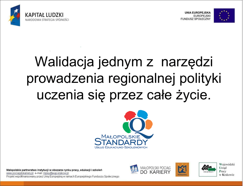 Walidacja jednym z narzędzi prowadzenia regionalnej polityki uczenia się przez całe życie. Potrzeby regionalnej polityki uczenia się przez całe życie /na przykładzie Województwa Małopolskiego/ 1. 2. 3. 4. 5. 6. Koordynacja na poziomie regionu Partnerstwo i dialog społeczny Monitoring sytuacji Zapewnienie informacji o kształceniu Promocja uczenia się przez całe życie Zapewnianie jakości kształcenia Potrzeby regionalnej polityki uczenia się przez całe życie – zapewnianie jakości kształcenia Instytucje kształcące Instytucje oceniające efekty kształcenia Sprawdzanie jakości podmiotów kształcących – małopolski standard usług edukacyjno-szkoleniowych Sprawdzanie jakości podmiotów walidujących Znak jakości dla firm kształcących w Małopolsce Certyfikacja Co to są Małopolskie standardy usług edukacyjno-szkoleniowe USŁUGA ORGANIZACJA ZARZĄDZANIE małopolskie standardy usługi edukacyjno -szkoleniowej KADRA MODEL AGENCJA AKREDYTUJĄCA Małopolskie standardy usług edukacyjno-szkoleniowych • Powołana uchwałą SWM • Firmy szkoleniowe dobrowolnie ubiegają się o znak jakości • Samofinansująca się instytucja, • Akredytuje, certyfikuje, przyznaje znak jakości • prowadzi audyt na podstawie samoewaluacji • Prowadzi monitoring jakości usług szkoleniowych Sejmik i Zarząd WM Małopolska Agencja Akredytująca Firmy certyfikujące jakość usług szkoleniowych Firmy szkoleniowe ubiegające się o certyfikację KLIENCI Z dotychczasowych doświadczeń, konsultacji i pilotażu małopolskich standardów usług edukacyjno-szkoleniowych w ramach Małopolskiego Partnerstwa na rzecz Kształcenia Ustawicznego • • • • • Oddzielenie kształcenia od oceny kwalifikacji – istnieje konieczność wprowadzania mechanizmów zapewniania jakości zarówno do jednostek kształcących jak i jednostek oceniających efekty kształcenia. Jednostka kształcąca nie może jednocześnie oceniać efektów kształcenia. Jak zmierzyć kompetencje społeczne, postawy – o ile wiedza i umiejętności są w dużej mierze możliwe do sprawdzania, niewystarczająca wiedza nt. praktyki w zakresie mierzenia kompetencji społecznych, postaw. System wymaga procesu wprowadzania zmiany – zatem konieczne przygotowanie kadr , np. przygotowanie kadry edukacji formalnej do kształcenia kompetencji społecznych, postaw System będzie wdrażany a nie jedynie obowiązujący tylko jeżeli da możliwość szybszego niż dotąd w edukacji formalnej reagowanie na potrzeby rynku pracy. System musi opierać się na potrzebach pracodawców /zaufanie do dokumentu, współpraca nauka – biznes/ Rola doradców całożyciowych – diagnoza niepotwierdzonych kwalifikacji, bilans kompetencji. Bez wsparcia doradców system kwalifikacji może stać się użyteczny tylko dla bardzo przedsiębiorczych osób a nie jako mechanizm poprawy sytuacji na rynku pracy grup defaworyzowanych. Z doświadczeń innych krajóww ramach współpracy międzynarodowej projektu „Małopolskie partnerstwo instytucji w obszarze rynku pracy, edukacji i szkoleń” Walonia Francja /Roden -Alpy/ • elastyczność • element polityki rynku pracy • zaufanie pracodawców do dokumentu Szkocja czytelność systemu dla przedsiębiorców • oferty pracy zawierają element Szkockich Ram Kwalifikacji i czytelny system punktowy dla kształcących się • www.pociagdokariery.pl