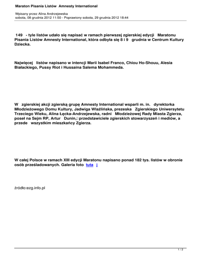 Maraton Pisania Listów Amnesty International Wpisany przez Alina Andrzejewska sobota, 08 grudnia 2012 11:50 - Poprawiony sobota, 29 grudnia 2012 18:44 149 - tyle listów udało się napisać w ramach pierwszej zgierskiej edycji Maratonu Pisania Listów Amnesty International, która odbyła się 8 i 9 grudnia w Centrum Kultury Dziecka. Najwięcej listów napisano w intencji Marii Isabel Franco, Chiou Ho-Shouu, Alesia Białackiego, Pussy Riot i Hussaina Salema Mohammeda. W zgierskiej akcji zgierską grupę Amnesty International wsparli m. in. dyrektorka Młodzieżowego Domu Kultury, Jadwiga Wlaźlińska, prezeska Zgierskiego Uniwersytetu Trzeciego Wieku, Alina Łęcka-Andrzejewska, radni Młodzieżowej Rady Miasta Zgierza, poseł na Sejm RP, Artur Dunin, przedstawiciele zgierskich stowarzyszeń i mediów, a przede wszystkim mieszkańcy Zgierza. W całej Polsce w ramach XIII edycji Maratonu napisano ponad 182 tys. listów w obronie osób prześladowanych. Galeria foto tuta j źródło:ezg.info.pl 1/2 Maraton Pisania Listów Amnesty International Wpisany przez Alina Andrzejewska sobota, 08 grudnia 2012 11:50 - Poprawiony sobota, 29 grudnia 2012 18:44 Szanowni Państwo, Wszyscy wiemy jak bezradny jest pojedynczy człowiek w konfrontacji z bezdusznym aparatem prawnym, zwłaszcza gdy łamane są prawa człowieka. Dlatego przesyłamy tę wiadomość z prośbą o uważne jej przeczytanie i przyłączenie się do akcji.To ważne, żeby ludzie prześladowani czuli naszą solidarność. Do zobaczenia w CKD SOBOTA: 10.00-20.00 NIEDZIELA: 12.00-20.00 W imieniu Zgierskiej Grupy Amnesty International, bardzo serdecznie zapraszamy do wzięcia udziału w XIII Maratonie Pisania Listów, który po raz pierwszy odbędzie się w naszym mieście. Jest to międzynarodowe wydarzenie organizowane przez Amnesty International, którego celem jest domaganie się zwolnienia osób więzionych za przekonania i zaprzestanie prześladowania obrońców praw człowieka. Tegoroczny Maraton odbędzie się w dniach 8-9 grudnia br. Zapraszamy do Centrum Kultury Dziecka, gdzie w spokojnej i przyjaznej atmosferze, goście będą mogli napisać odręcznie list, bądź listy w obronie więźniów sumienia z państw, gdzie prawa człowieka są łamane. Wśród tegorocznych bohaterów i bohaterek są między innymi członkinie zespołu Pussy Riot skazane na pobyt w rosyjskiej kolonii karnej, Aleś Bialacki, jeden z czołowych obrońców praw człowieka na Białorusi czy trzydziestotysięczna społeczność libijskiego miasta Tawarga, zniszczonego w czasie działań wojennych. Postaramy się także pokazać Państwu filmy i spoty o tematyce prawoczłowieczej. Podczas całego weekendu, dzięki Stowarzyszeniu Kameleon, będziemy zbierać pieniądze na znaczki pocztowe do wysłania listów. Zapraszamy także dzieci, które będą mogły wykonywać lampiony akcyjne oraz malować dodające otuchy rysunki dla aktywistów i aktywistek z Sudanu. 2/2