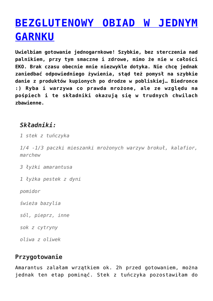 BEZGLUTENOWY OBIAD W JEDNYM GARNKU Uwielbiam gotowanie jednogarnkowe! Szybkie, bez sterczenia nad palnikiem, przy tym smaczne i zdrowe, mimo że nie w całości EKO. Brak czasu obecnie mnie niezwykle dotyka. Nie chcę jednak zaniedbać odpowiedniego żywienia, stąd też pomysł na szybkie danie z produktów kupionych po drodze w pobliskiej… Biedronce :) Ryba i warzywa co prawda mrożone, ale ze względu na pośpiech i te składniki okazują się w trudnych chwilach zbawienne. Składniki: 1 stek z tuńczyka 1/4 -1/3 paczki mieszanki mrożonych warzyw brokuł, kalafior, marchew 3 łyżki amarantusa 1 łyżka pestek z dyni pomidor świeża bazylia sól, pieprz, inne sok z cytryny oliwa z oliwek Przygotowanie Amarantus zalałam wrzątkiem ok. 2h przed gotowaniem, można jednak ten etap pominąć. Stek z tuńczyka pozostawiłam do rozmrażania po przyjściu do domu, można jednak go w ogóle nie rozmrażać bądź przyspieszyć proces, wkładając rybę do mikrofali bądź na patelnię. Przed dalszą obróbką dobrze jest skropić rybę cytryną i pozostawić ją na kilka minut, aby nasiąkła chociaż odrobinę sokiem. Gotujemy niewielką ilość wody w garnku. U mnie było to około 1/2 szklanki, tak aby przykryła stek prawie w całości. Solimy wodę, możemy również dodać do niej liść laurowy i ziele angielskie bądź inne przyprawy. Następnie wkładamy rybę, dodajemy odsączony na sitku amarantus i mrożone warzywa, które przed użyciem dobrze jest sparzyć wodą, ze względu na możliwe śladowe ilości glutenu. Przykrywamy garnek. Pozostawiamy na małym ogniu do momentu ugotowania się amarantusa i ryby. Jednocześnie na suchej patelni prażymy delikatnie pestki dyni. Uważamy, aby ich nie przypalić. Zawartość garnka przekładamy na talerz. Kroimy w ósemki pomidora. Posypujemy go posiekaną świeżą bazylią i polewamy oliwą z oliwek. Gotowanie może stać się o wiele prostsze jeśli zaopatrzymy się w kilka podstawowych produktów do wykorzystania na czarną godzinę. Warzywa (marchew, cebula, czosnek, cukinia, pomidor, inne; ewentualnie mrożonki), kasze (jaglana, amarantus, gryczana, inna), kawałek ryby czy mięsa (także w formie zamrożonej) i ziarna (pestki dyni) czy orzechy (nerkowca, włoskie). Warto zawsze zadbać o to, aby coś pozostało z naszych zapasów, by w czasie trudnym organizacyjnie, zawsze móc wrzucić kilka składników do jednego garnka. Nie bójmy się eksperymentować i próbować nowych technik gotowania. Smacznego! :)