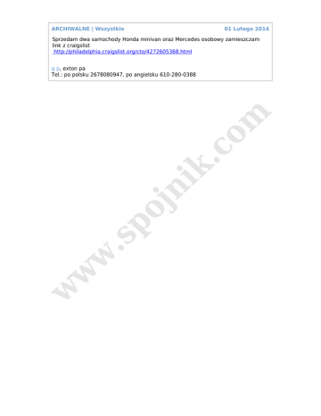ARCHIWALNE | Wszystkie 01 Lutego 2014 Sprzedam dwa samochody Honda minivan oraz Mercedes osobowy zamieszczam link z craigslist http://philadelphia.craigslist.org/cto/4272605368.html w w w .s po jn ik .c o m g p, exton pa Tel.: po polsku 2678080947, po angielsku 610-280-0388