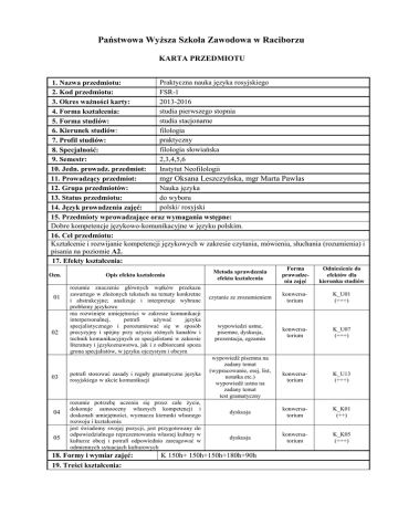 Państwowa Wyższa Szkoła Zawodowa w Raciborzu KARTA PRZEDMIOTU Praktyczna nauka języka rosyjskiego 1. Nazwa przedmiotu: FSR-1 2. Kod przedmiotu: 2013-2016 3. Okres ważności karty: studia pierwszego stopnia 4. Forma kształcenia: studia stacjonarne 5. Forma studiów: 6. Kierunek studiów: filologia praktyczny 7. Profil studiów: filologia słowiańska 8. Specjalność: 2,3,4,5,6 9. Semestr: Instytut Neofilologii 10. Jedn. prowadz. przedmiot: 11. Prowadzący przedmiot: mgr Oksana Leszczyńska, mgr Marta Pawlas 12. Grupa przedmiotów: Nauka języka do wyboru 13. Status przedmiotu: polski/ rosyjski 14. Język prowadzenia zajęć: 15. Przedmioty wprowadzające oraz wymagania wstępne: Dobre kompetencje językowo-komunikacyjne w języku polskim. 16. Cel przedmiotu: Kształcenie i rozwijanie kompetencji językowych w zakresie czytania, mówienia, słuchania (rozumienia) i pisania na poziomie A2. 17. Efekty kształcenia: Ozn. 01 02 03 04 05 Opis efektu kształcenia rozumie znaczenie głównych wątków przekazu zawartego w złożonych tekstach na tematy konkretne i abstrakcyjne; analizuje i interpretuje wybrane problemy językowe ma rozwinięte umiejętności w zakresie komunikacji interpersonalnej, potrafi używać języka specjalistycznego i porozumiewać się w sposób precyzyjny i spójny przy użyciu różnych kanałów i technik komunikacyjnych ze specjalistami w zakresie literatury i językoznawstwa, jak i z odbiorcami spoza grona specjalistów, w języku ojczystym i obcym potrafi stosować zasady i reguły gramatyczne języka rosyjskiego w akcie komunikacji rozumie potrzebę uczenia się przez całe życie, dokonuje samooceny własnych kompetencji i doskonali umiejętności, wyznacza kierunki własnego rozwoju i kształcenia jest świadomy swojej pozycji, jest przygotowany do odpowiedzialnego reprezentowania własnej kultury w kulturze obcej i potrafi odpowiednio zareagować w odmiennych sytuacjach kulturowych 18. Formy i wymiar zajęć: 19. Treści kształcenia: Metoda sprawdzenia efektu kształcenia Forma prowadzenia zajęć Odniesienie do efektów dla kierunku studiów czytanie ze zrozumieniem konwersatorium K_U01 (+++) wypowiedzi ustne, pisemne, dyskusja, prezentacja, egzamin konwersatorium K_U07 (+++) wypowiedź pisemna na zadany temat (wypracowanie, esej, list, notatka etc.) wypowiedź ustna na zadany temat test gramatyczny konwersatorium K_U13 (+++) dyskusja konwersatorium K_K01 (++) dyskusja konwersatorium K_K05 (+++) K 150h+ 150h+150h+180h+90h Tematyka: Wskazywanie osób i przedmiotów, określanie miejsca znajdowania się. Przedstawianie się, podstawowe zwroty grzecznościowe (witanie i żegnanie się, forma grzecznościowa Вы). Miejsce zamieszkania i pracy, zawody. Rodzina i szkoła, klasa (sala) – opis podstawowych czynności ucznia, studenta w trakcie zajęć. Zainteresowania i hobby, sposoby spędzania wolnego czasu. Dni tygodnia, plan zajęć, codzienne domowe czynności i rozkład dnia. Samopoczucie i stan zdrowia. Określanie i porównywanie wieku. Zwierzęta domowe, ich zachowanie i opieka nad nimi. Pory roku, prognoza pogody, nazwy miesięcy. Poczta, forma listu prywatnego, wyrażenia związane z prowadzeniem korespondencji (wzorzec listu, adres pocztowy). Moskwa – stolica Rosji, moskiewskie metro. Orientacja w mieście (pytania o drogę). Środki komunikacji miejskiej. Wrażenia z wakacji. Narodowości. Rosja – godła, flaga, hymn. Miejsce zamieszkania – mieszkanie/dom (adres, opis pomieszczeń, wyposażenie). Określanie czasu zegarowego w sposób oficjalny i nieoficjalny. Święta rodzinne i uroczystości (składanie życzeń). Określanie daty. Zakupy w sklepie spożywczym i przemysłowym – formy grzecznościowe, nazwy podstawowych artykułów spożywczych, warzyw, owoców, urządzeń technicznych. Sposoby spędzania wolnego czasu – kino, dyskoteka, teatr. Petersburg – obiekty i zabytki miasta. W restauracji – zamawianie posiłków, nazwy potraw i napojów, tradycyjne dania rosyjskie. Gramatyka: Rosyjski alfabet, wymowa samogłosek jotowanych oraz „o” w pozycji akcentowanej i poza akcentem, wymowa spółgłosek syczących. Znaczenie akcentu wyrazowego w języku rosyjskim i intonacja zdania pytającego i oznajmującego. Oznaczanie miękkości spółgłosek w piśmie. Funkcja znaku miękkiego i twardego. Odmiana podstawowych regularnych czasowników I i II koniugacji. Konstrukcja zdania oznajmującego, pytającego i przeczącego. Konstrukcja „у меня…, у тебя…” z czasownikiem есть i bez niego. Przyimki у, около oraz в – из, на – с, użycie zaimków pytających где, куда, откуда? Odmiana nieregularnego czasownika хотеть. Odmiana czasowników zwrotnych I i II koniugacji (интересоваться, учиться). Odmiana podstawowych rzeczowników I deklinacji (мама, дядя, школа).Czasownik любить. Czas przeszły i przyszły złożony czasowników. Czasowniki ruchu: идти, пойти, прийти. Oznaczanie następstwa w czasie przy pomocy przyimka после. Konstrukcja „ у меня болит…”, czasowniki чувствовать себя, (за)болеть (чем?). Liczebniki od 1 do 100. Konstrukcja (кто?) cтарше/моложе (кого?). Czasownik заботиться о (ком? чём?). Odmiana podstawowych rzeczowników II deklinacji rodzaju męskiego, zakończonych na spółgłoskę (класс, мальчик) oraz nijakiego (озеро, поле, растение). Wyrażanie woli lub przymusu przy pomocy konstrukcji надо/нужно. Odmiana przymiotników twardotematowych. Odmiana przymiotników miękkotematowych. Odmiana zaimków osobowych. Rekcja czasowników писать, звонить (кому?). Rzeczowniki nieodmienne. Zaimki pytające i przysłówkowe odpowiedzi: где? – здесь, там; куда? – сюда, туда; откуда? – отсюда, оттуда.Odmiana rzeczowników rodzaju męskiego zako